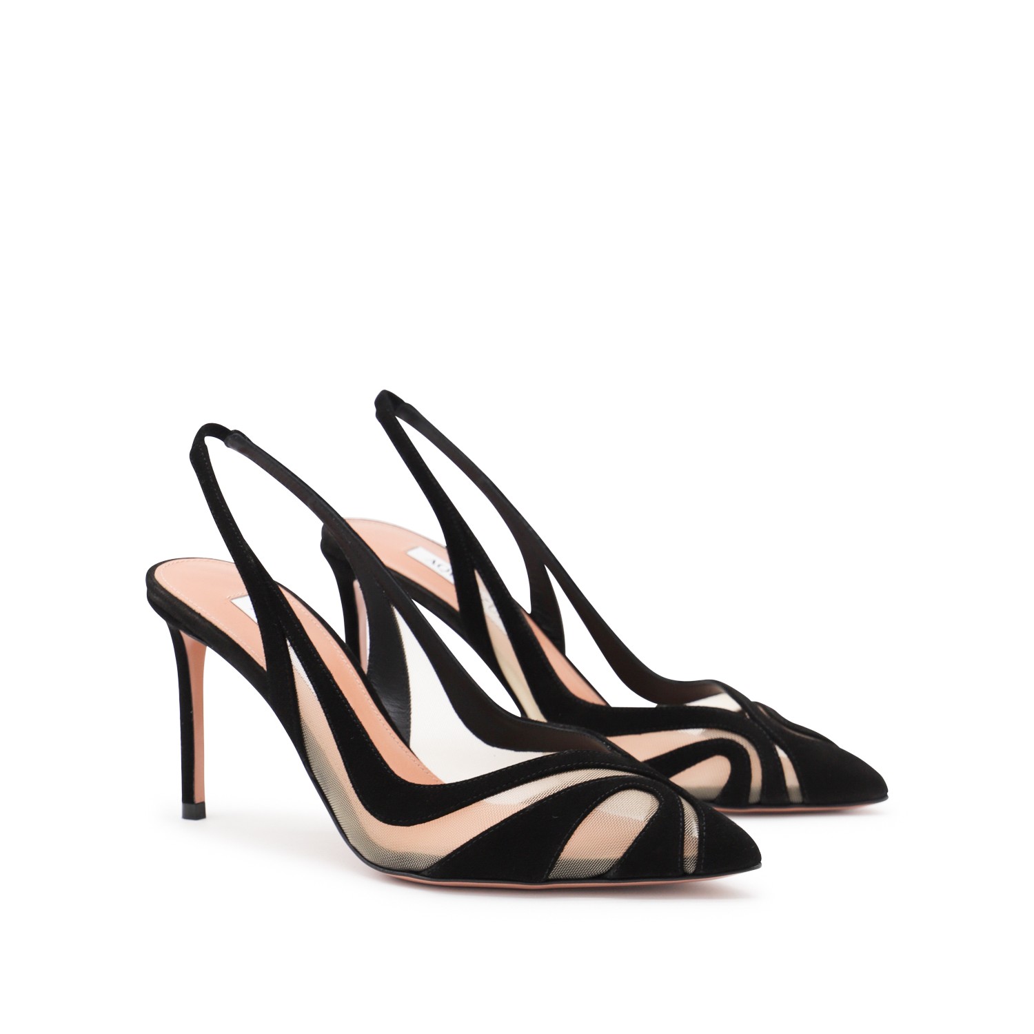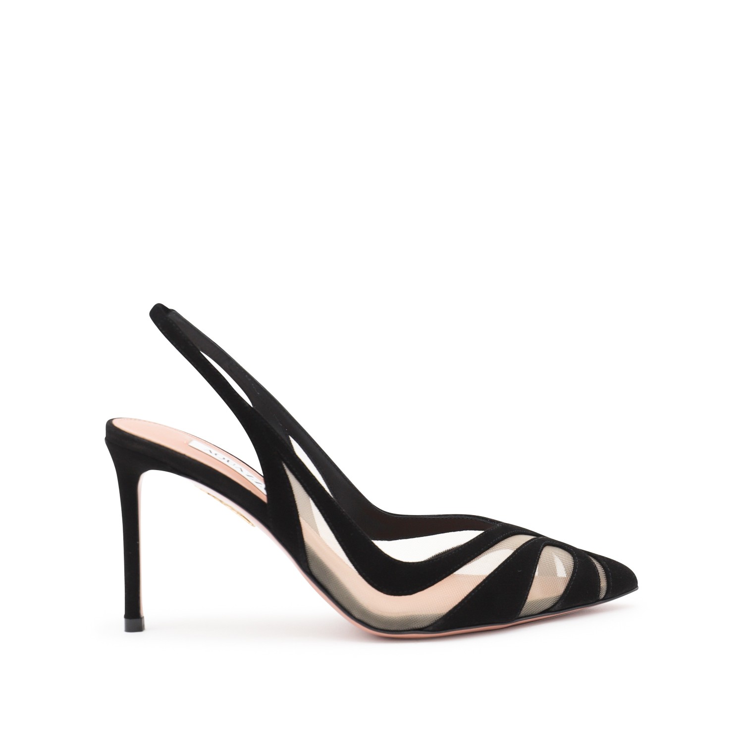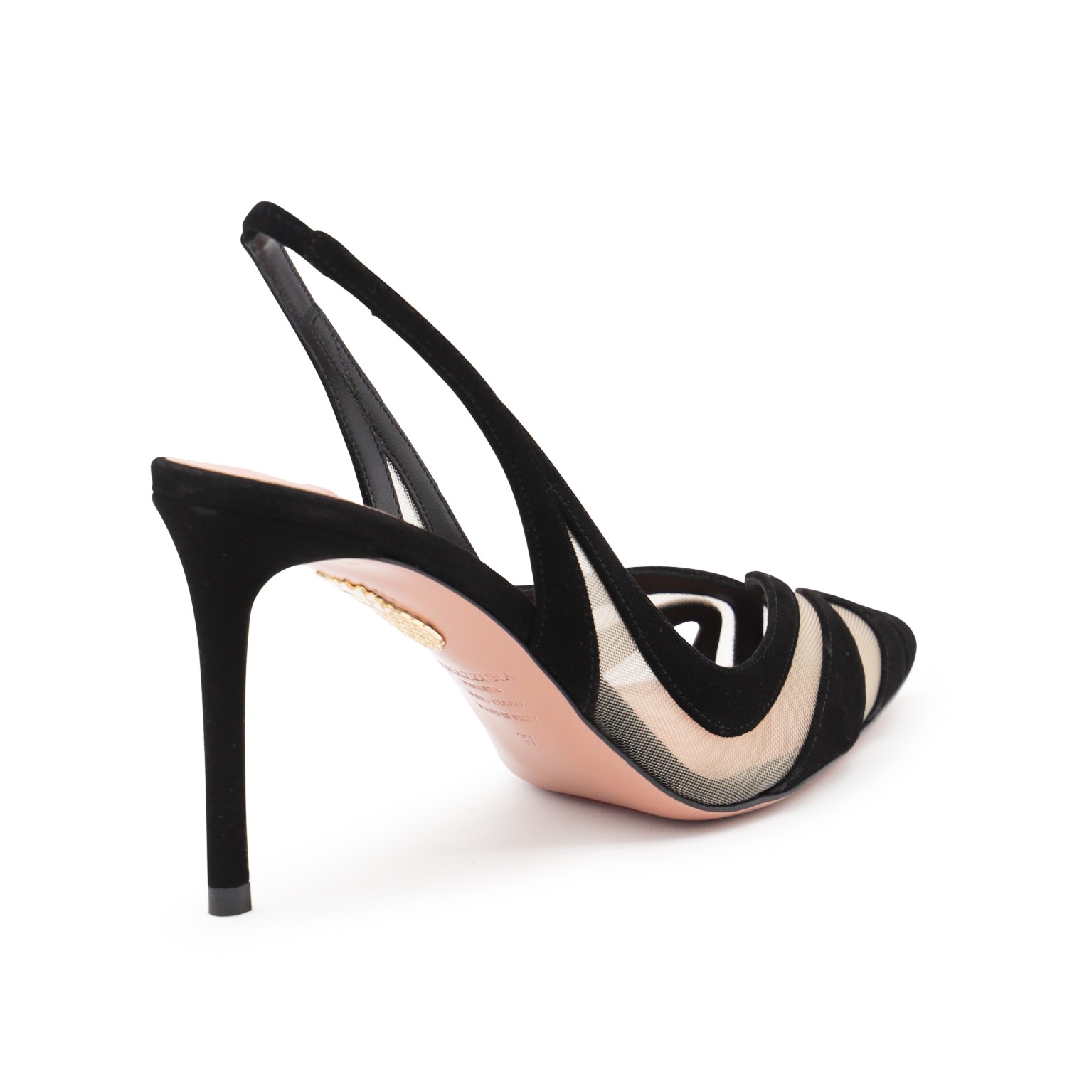 Black leather Lune Sling 85 pumps from Aquazzurra featuring pointed toe, open back, trasparence, leather sole, branded insole, ankle strap and stiletto heel.