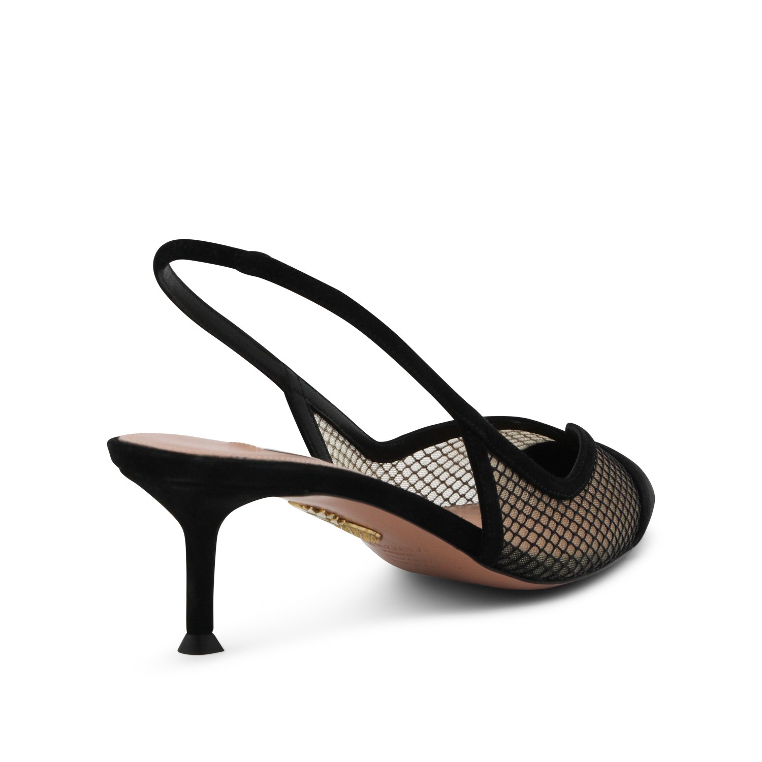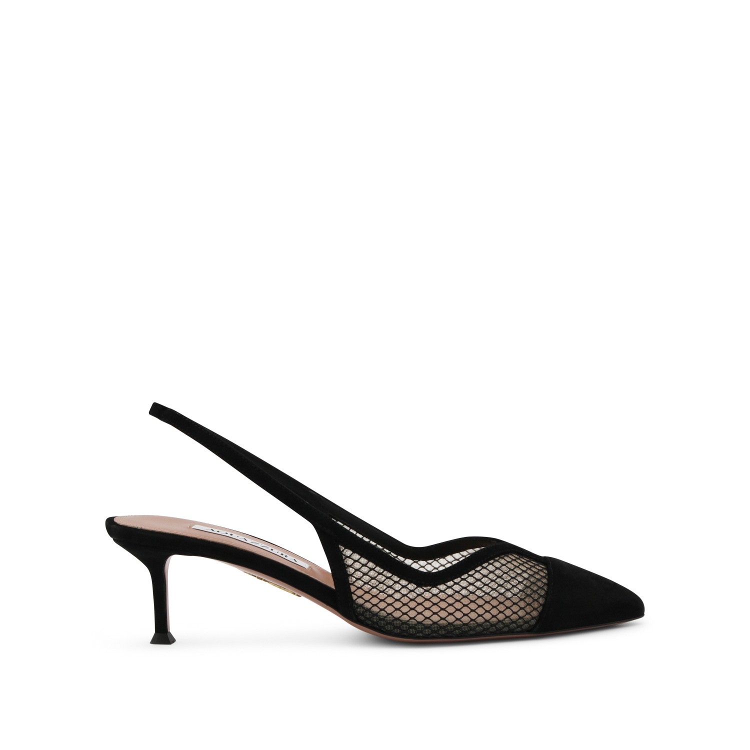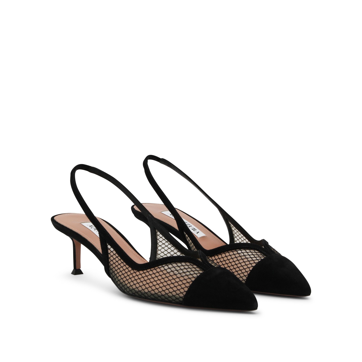 Black leather pumps from Aquazzura featuring pointed toe, open back, stiletto heel and trasparence.