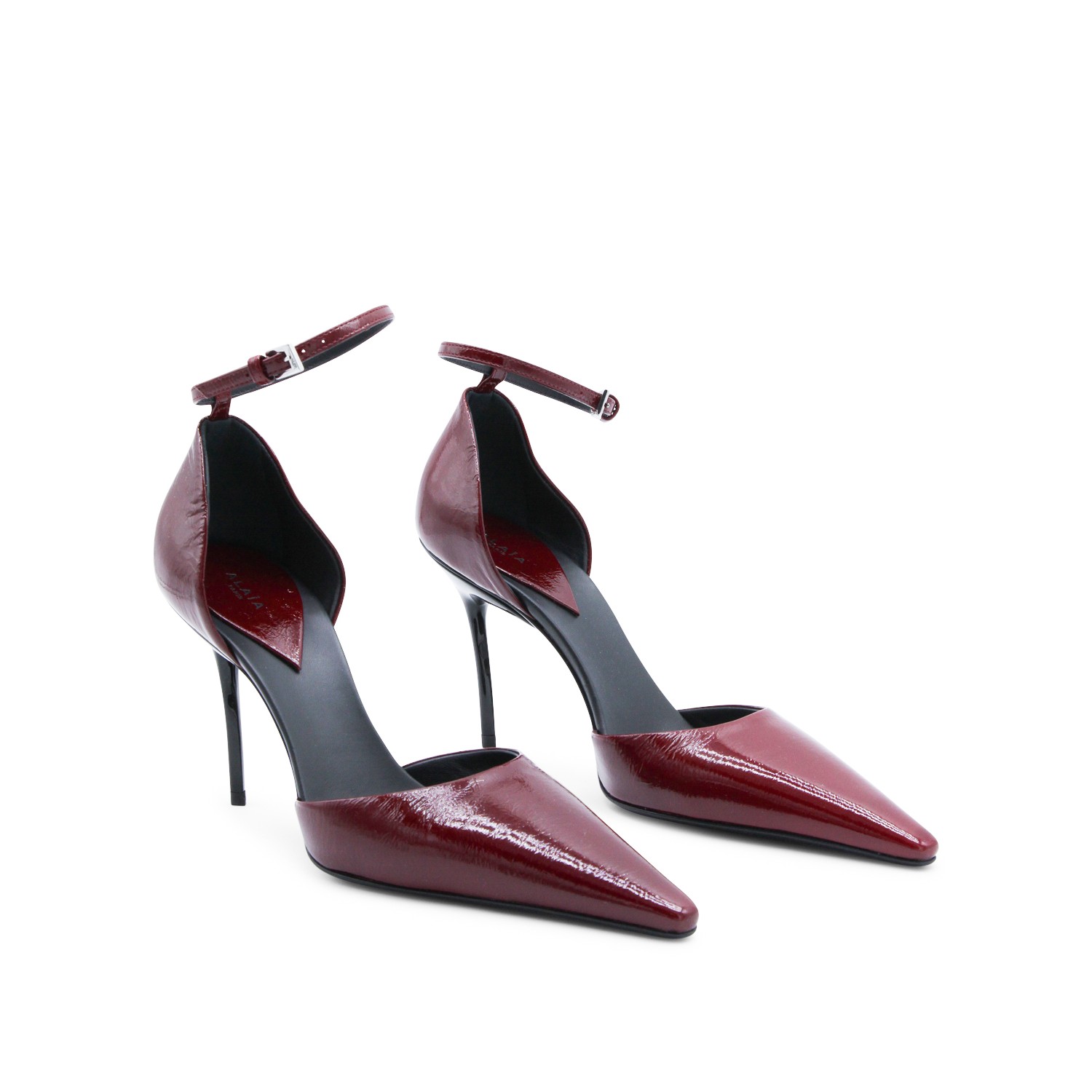 Bordeaux leather D'Orsay 90 pumps from Alaia featuring pointed toe, thin ankle strap, drop shaped heel base, sghtly crinkled shiny leather and laquered stiletto heel.