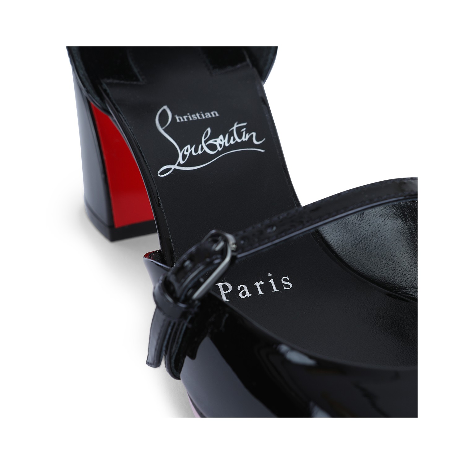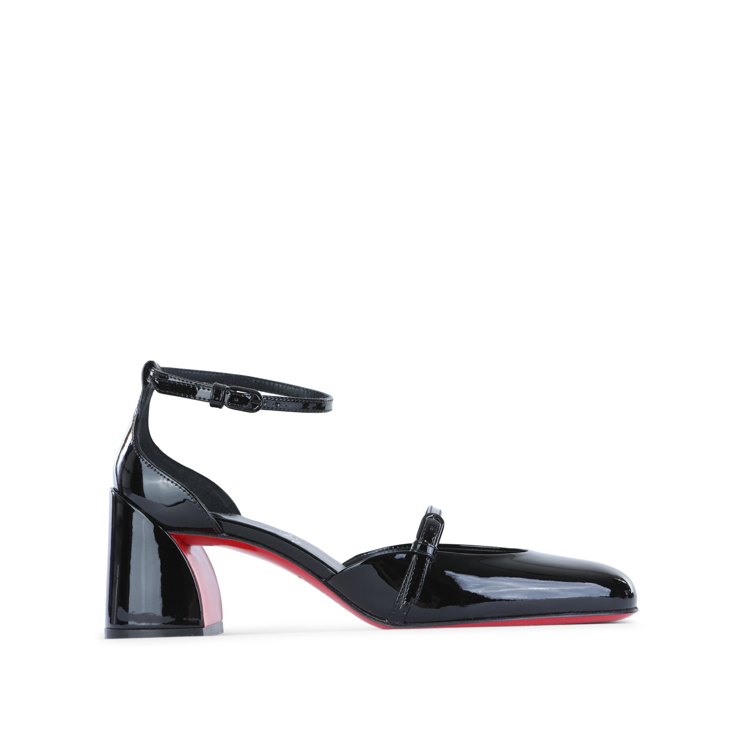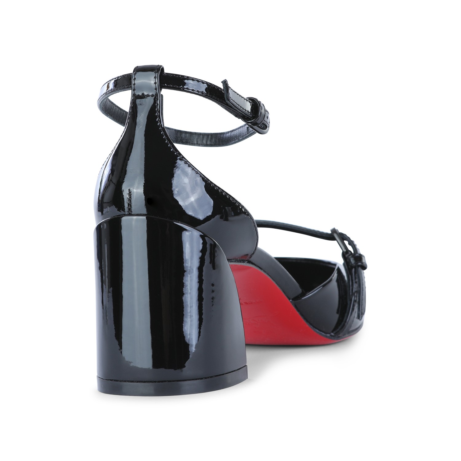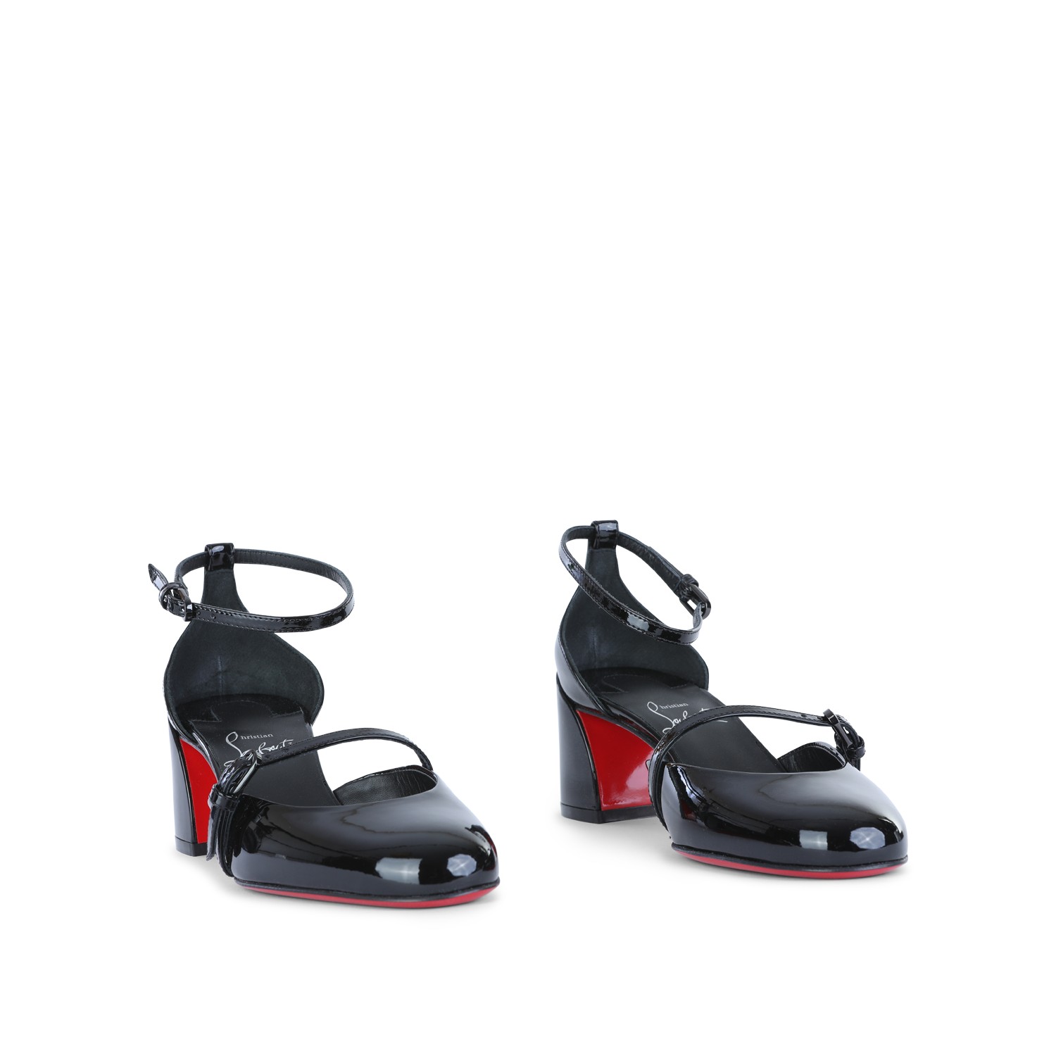 Black O Jane 55 pumps from Christian Louboutin featuring round toe, adjustable ankle strap, ,etal buckles, branded insole and leather sole.