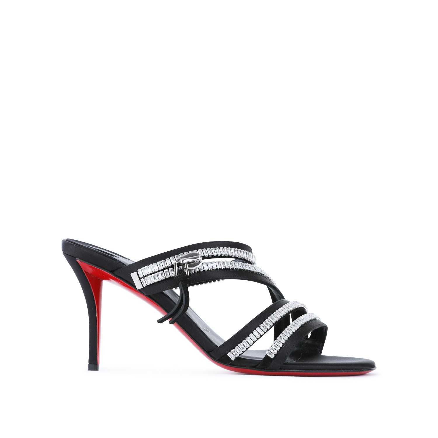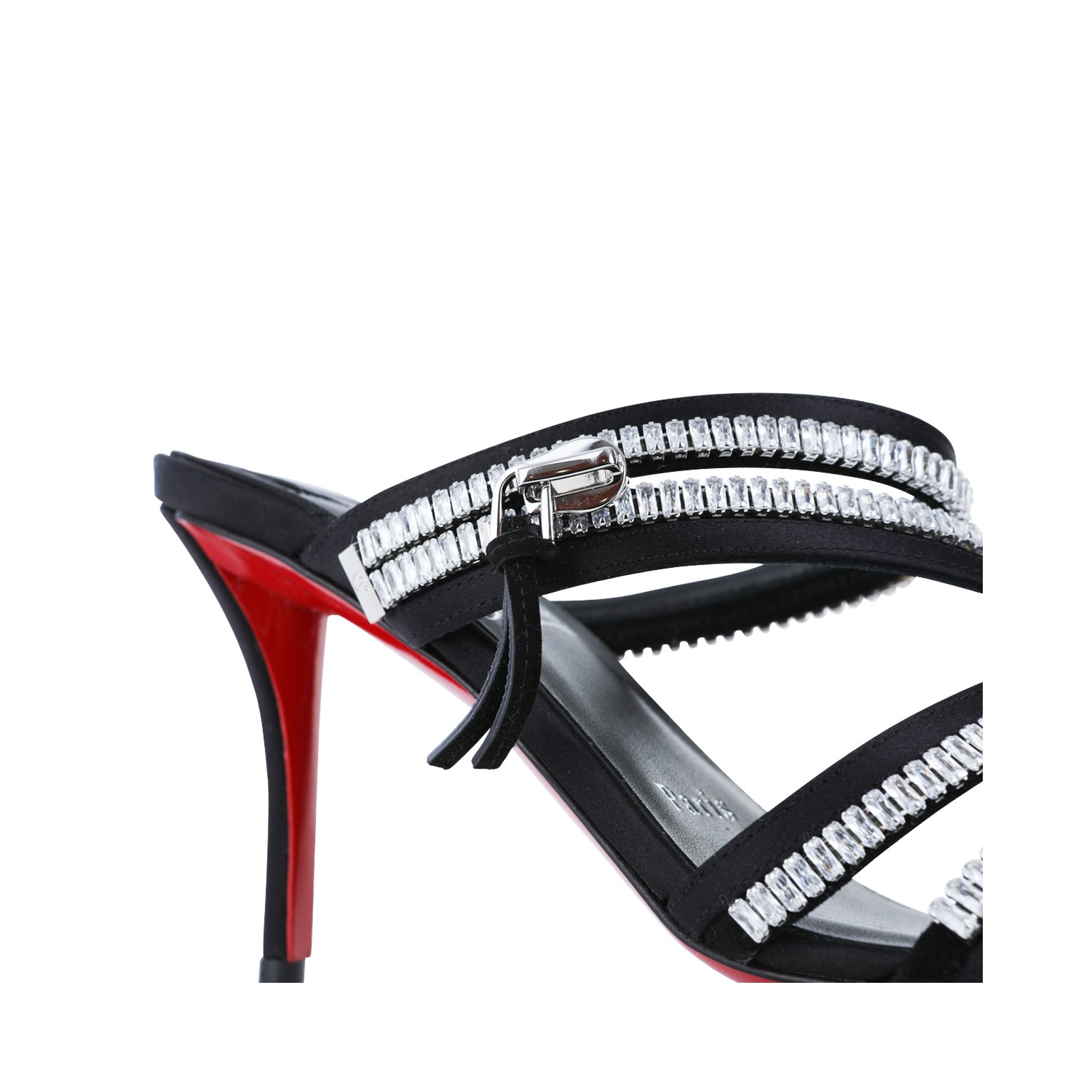 Black Merylzip strass sandals from Christian Louboutin featuring round open toe, slip-on style, strass, embellishments and red leather sole.
