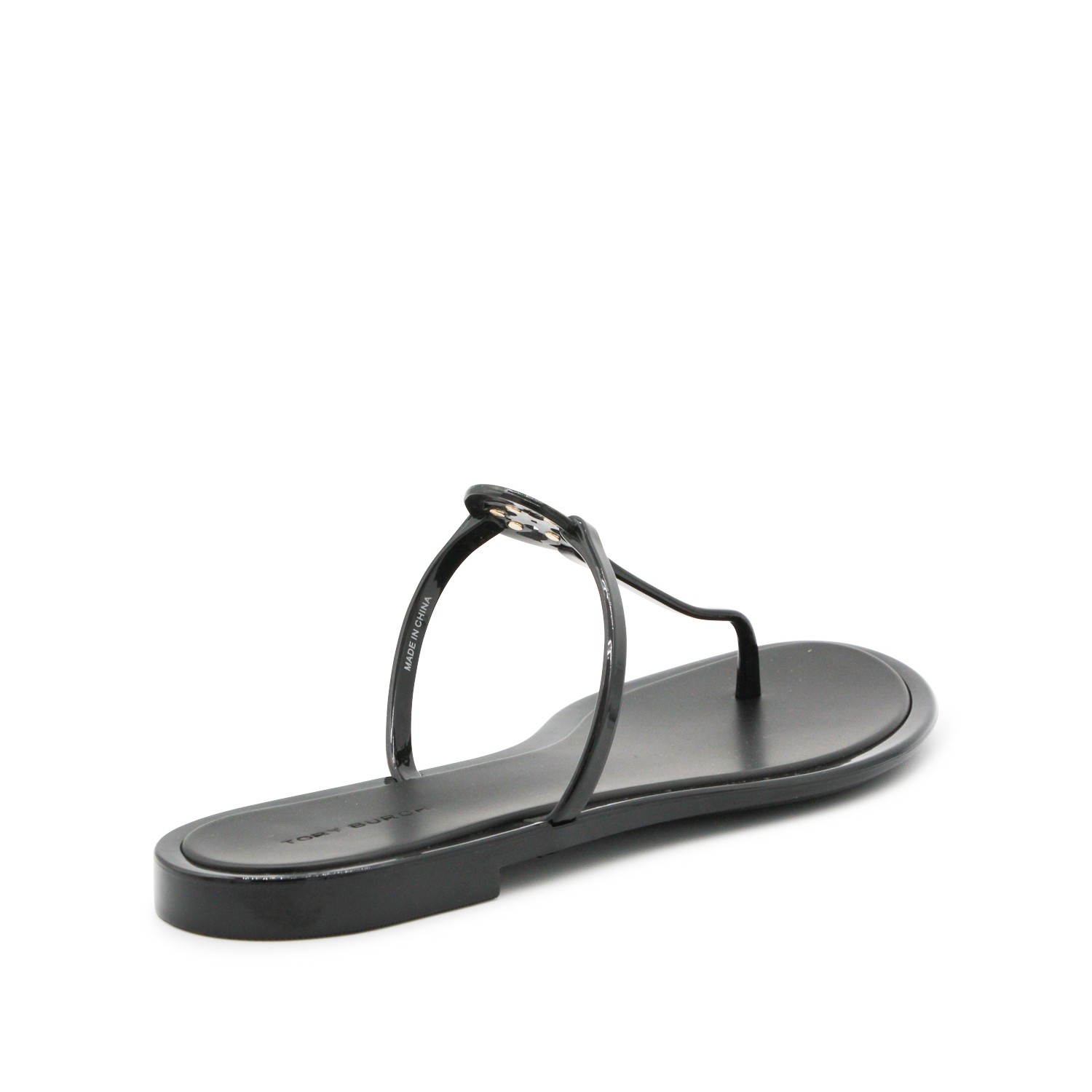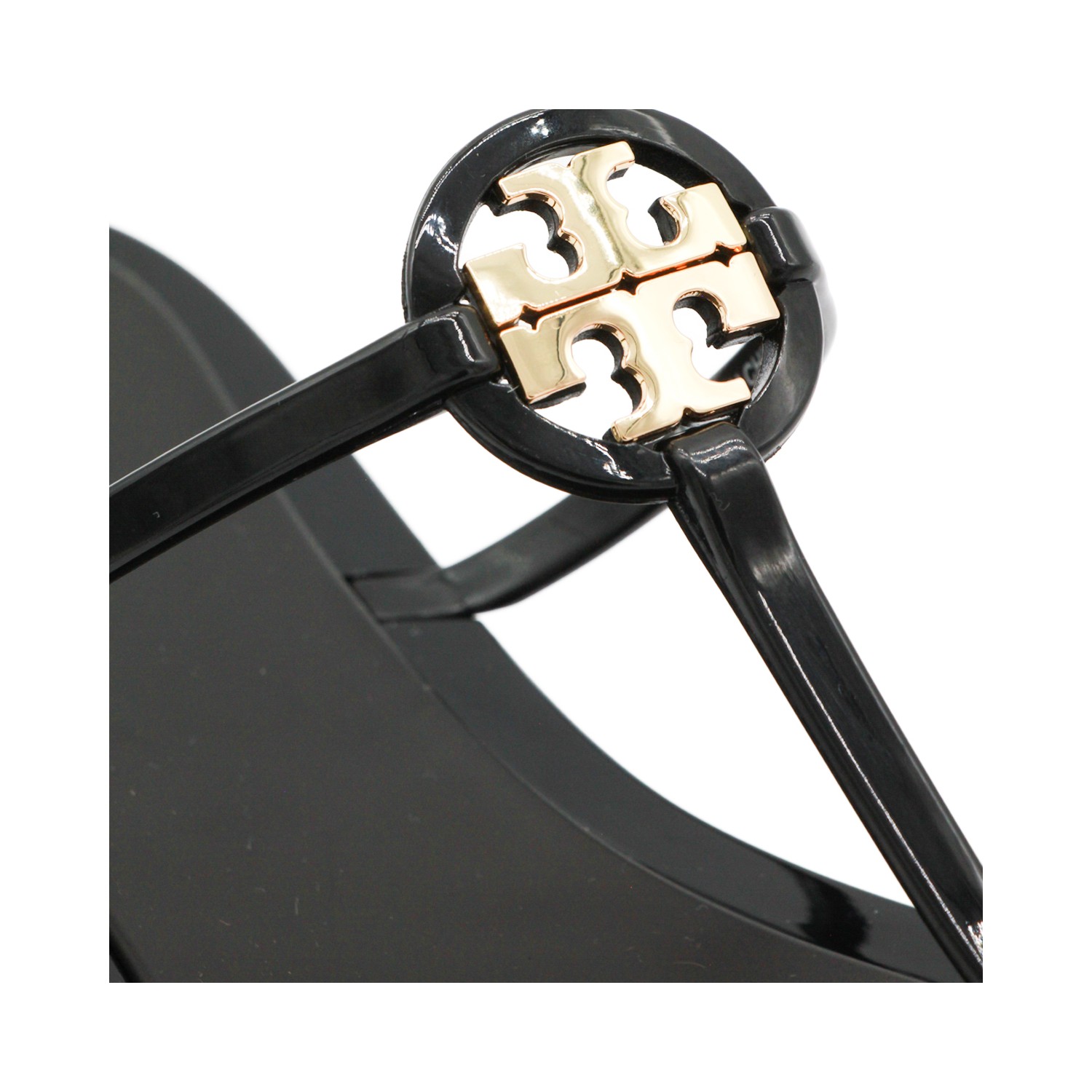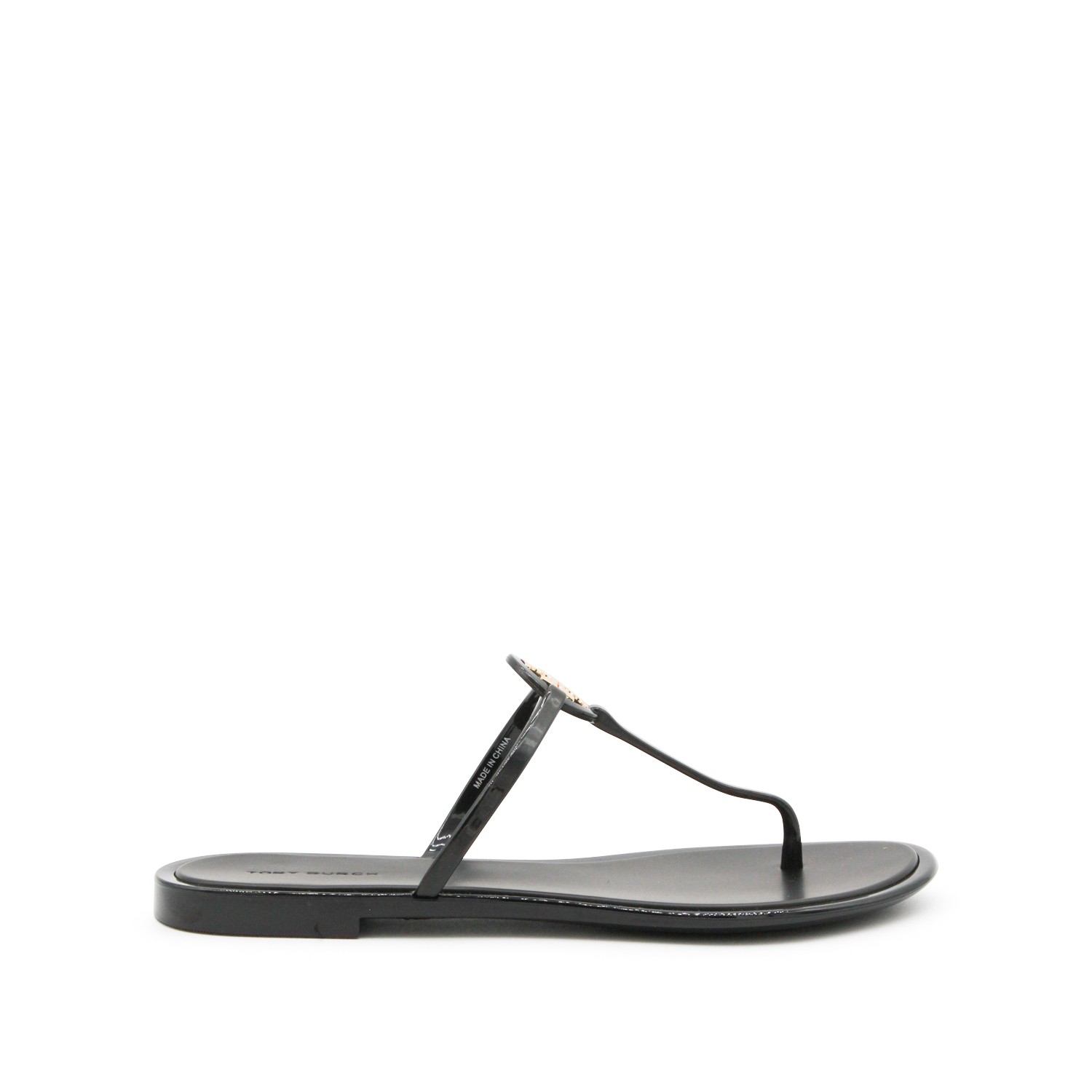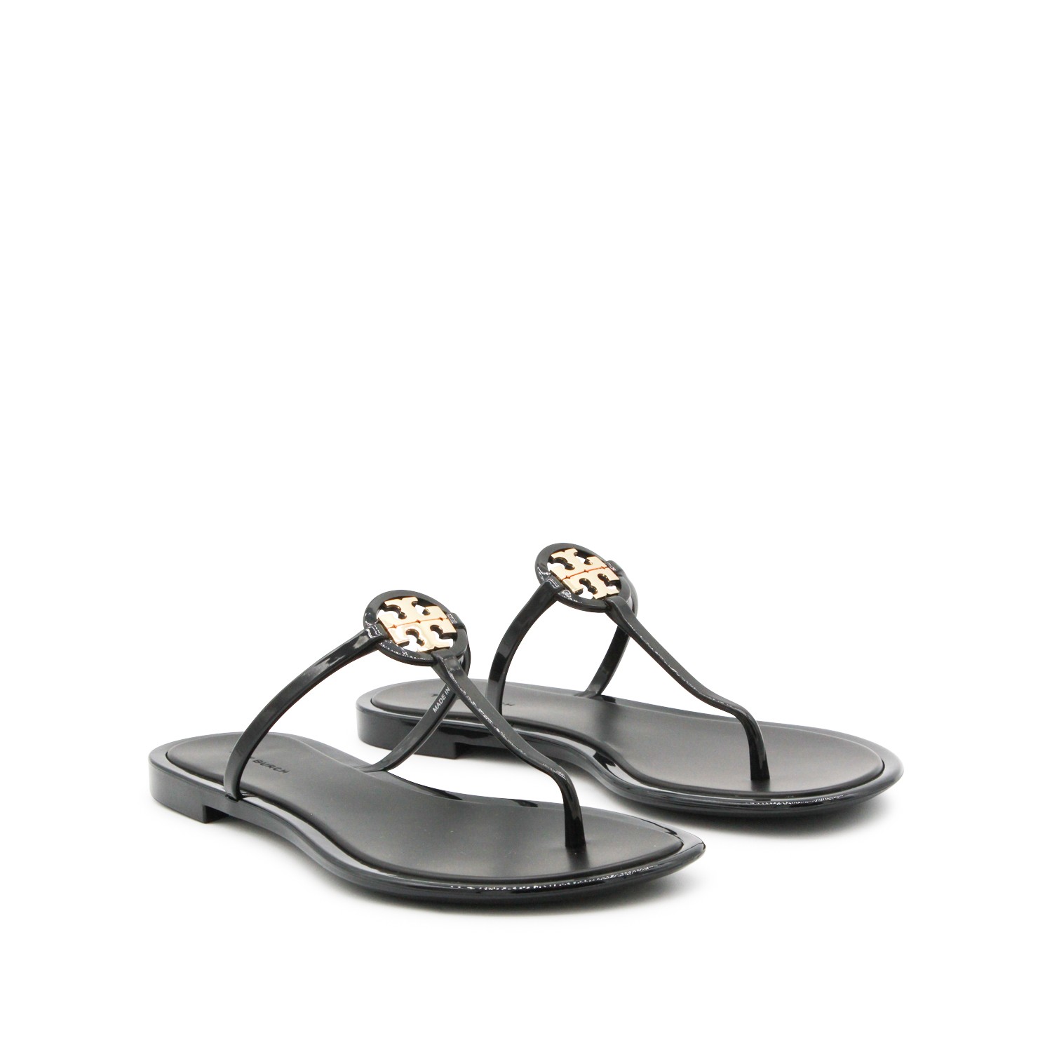 Black sandals from Tory Burch featuring round toe, gold tone logo and open back.