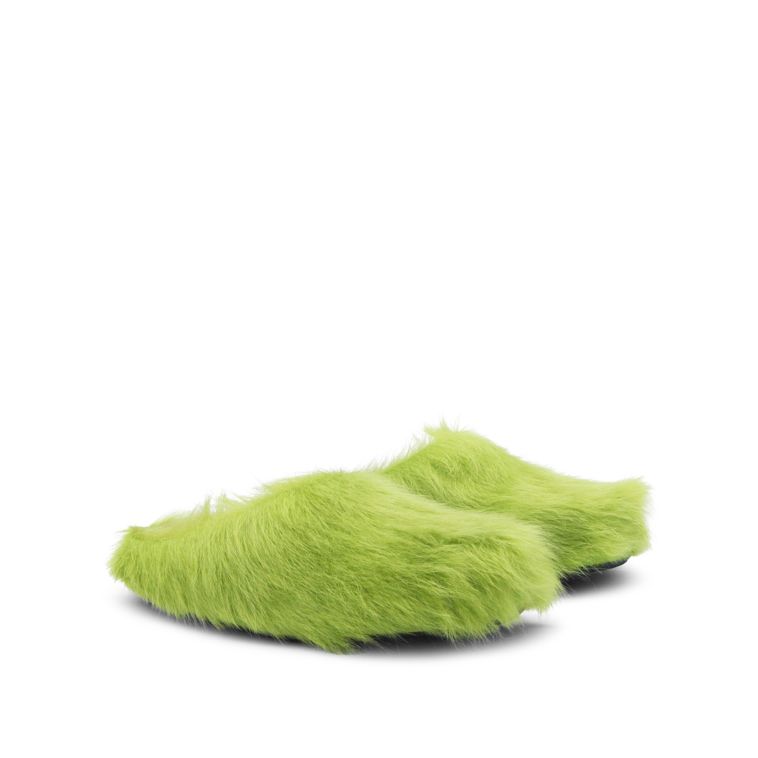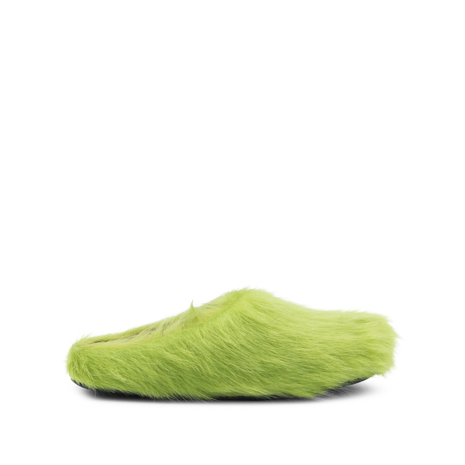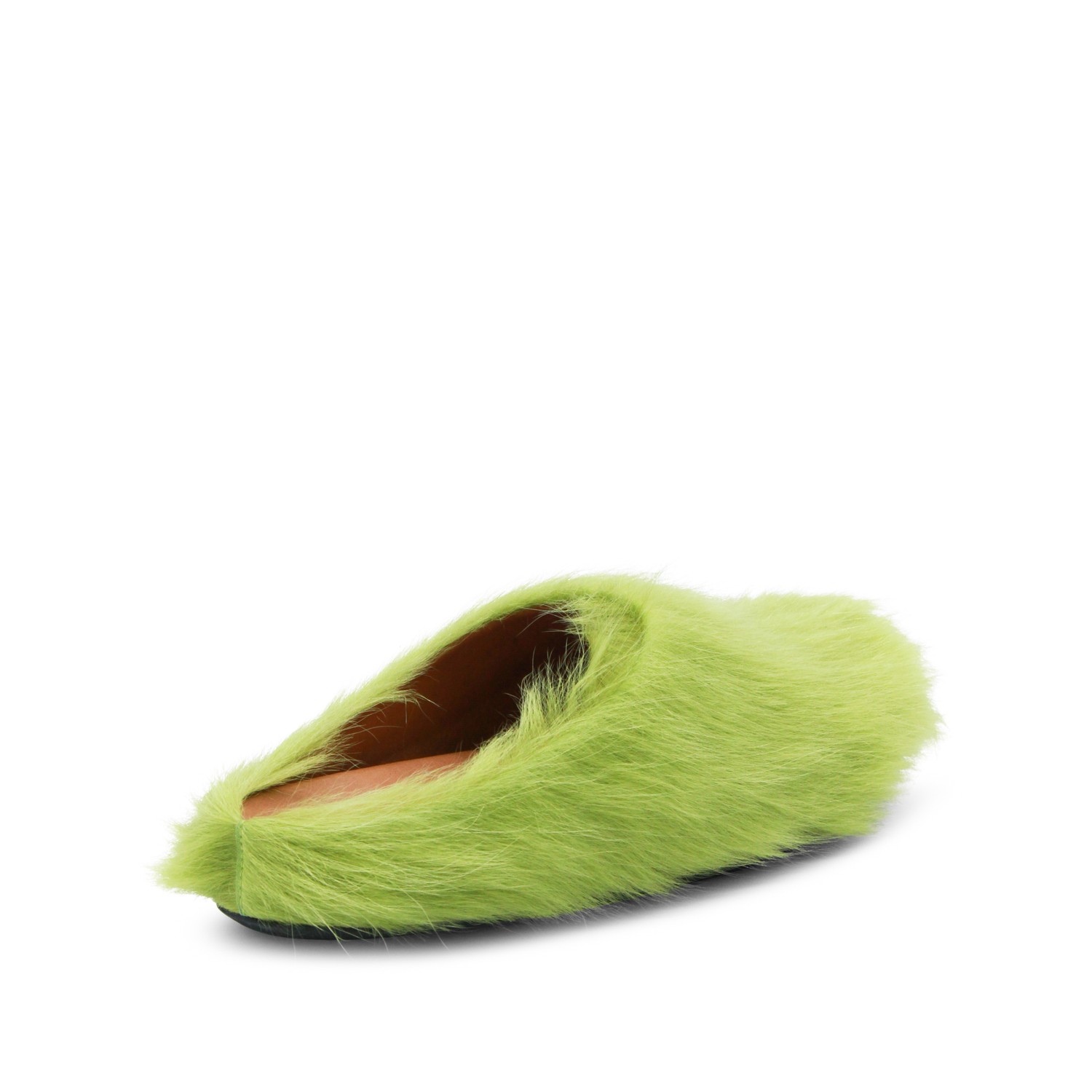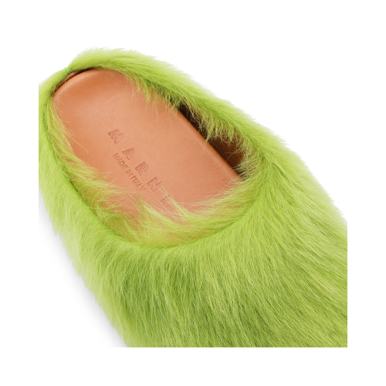 Acid green leather sandals from Marni featuring round toe, open back, slip-on style, calf hair upper and rubber sole.