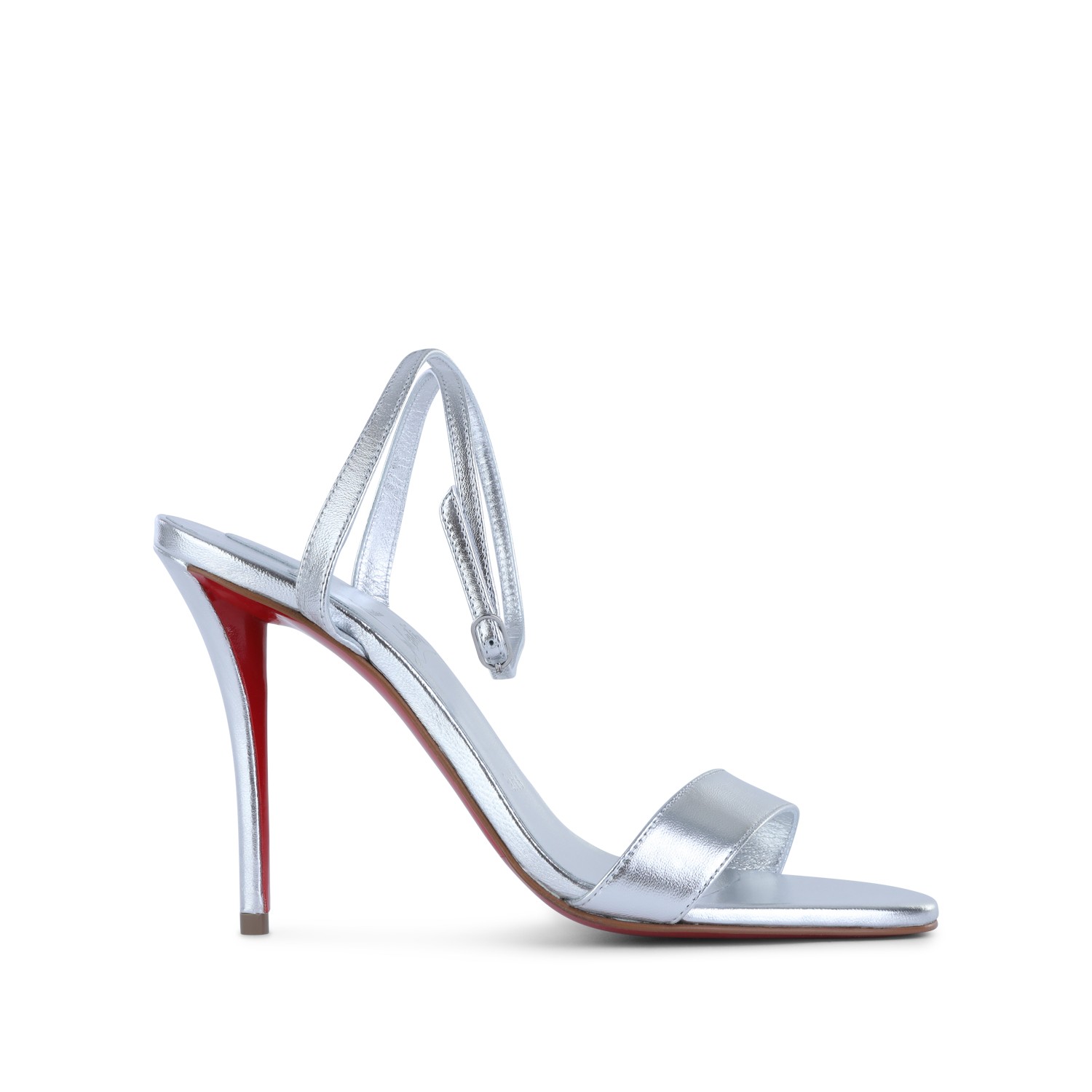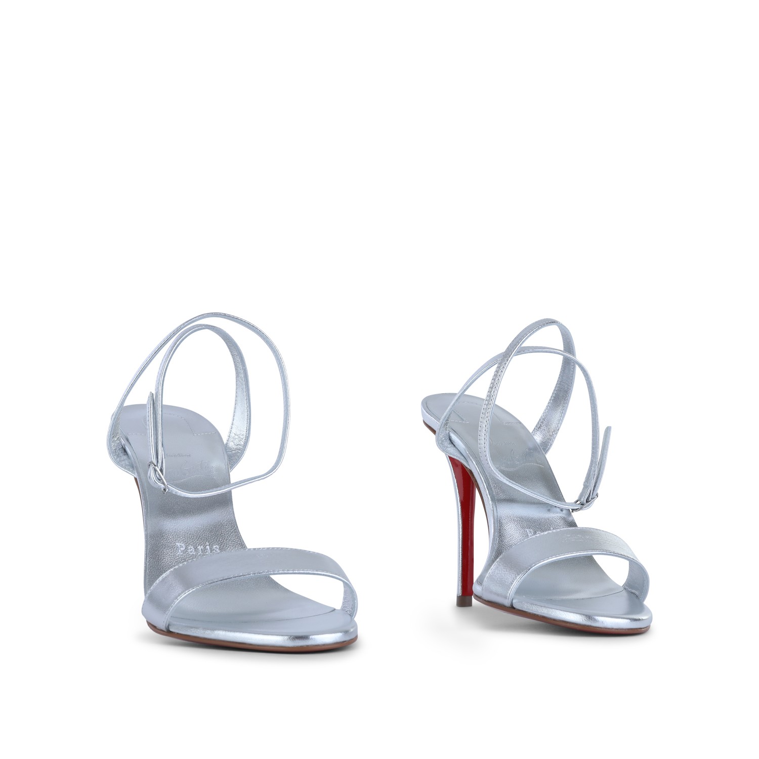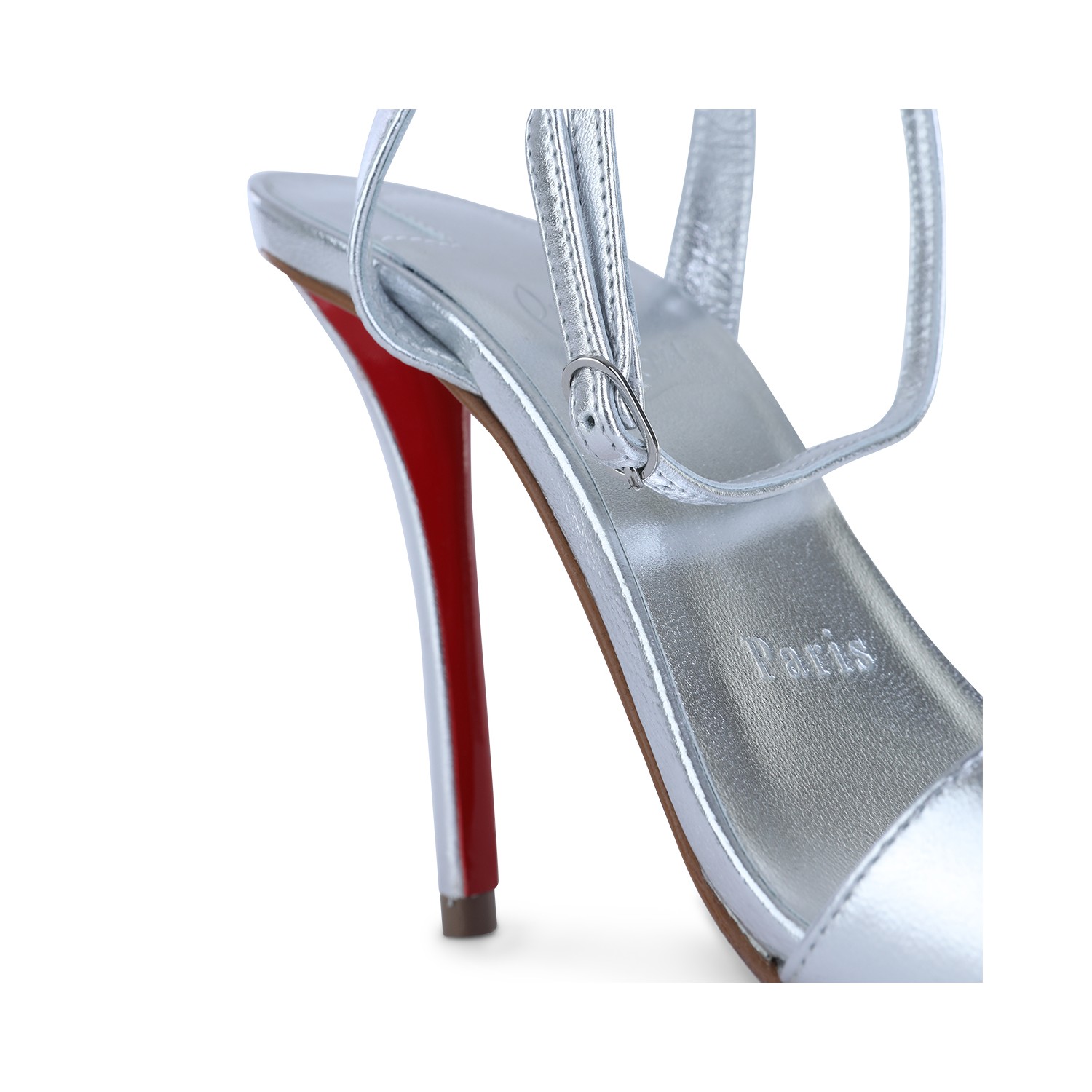 Silver leather sandals from Christian Louboutin featuring patent finish, round open toe, buckle fastening ankle strap, branded insole and high sculpted heel.