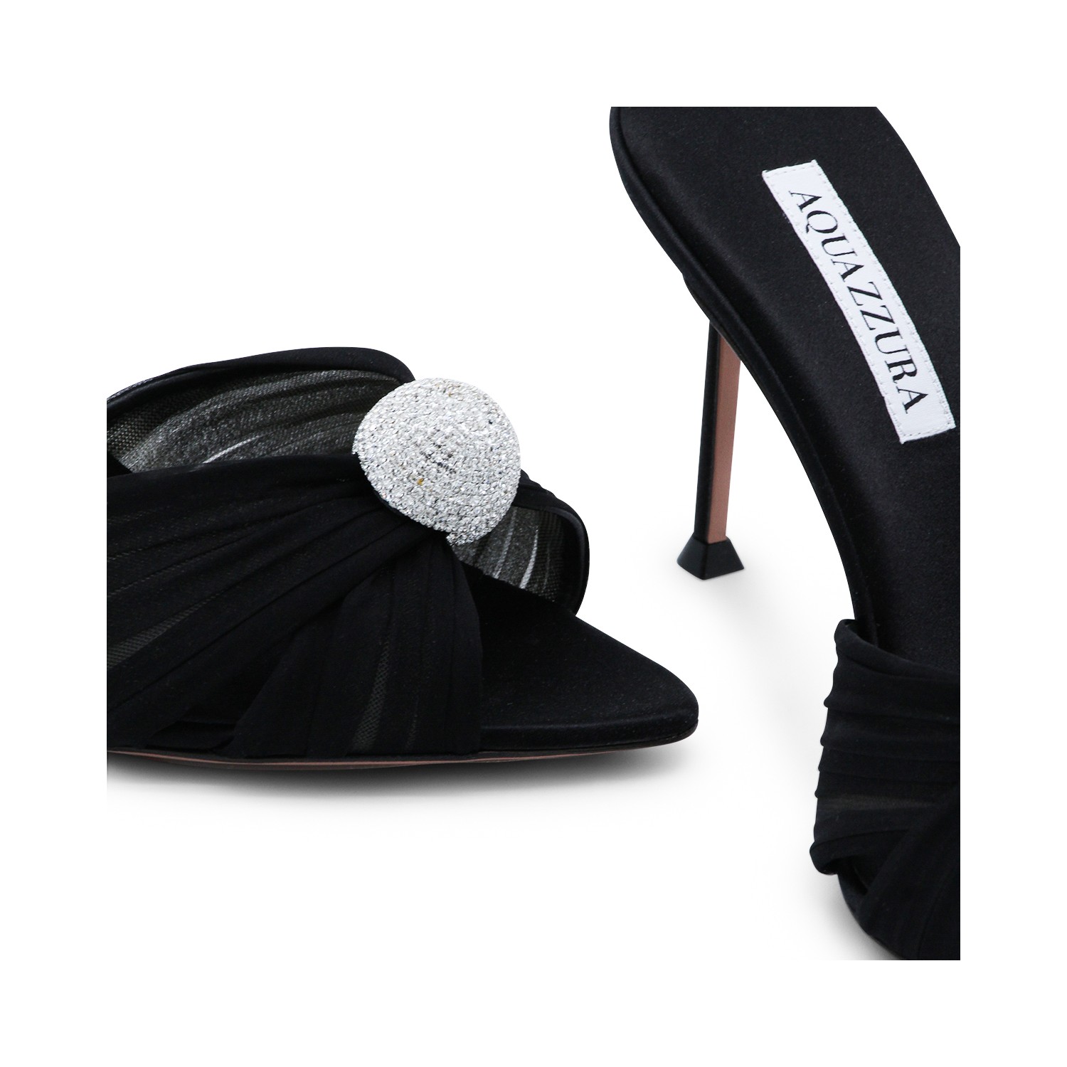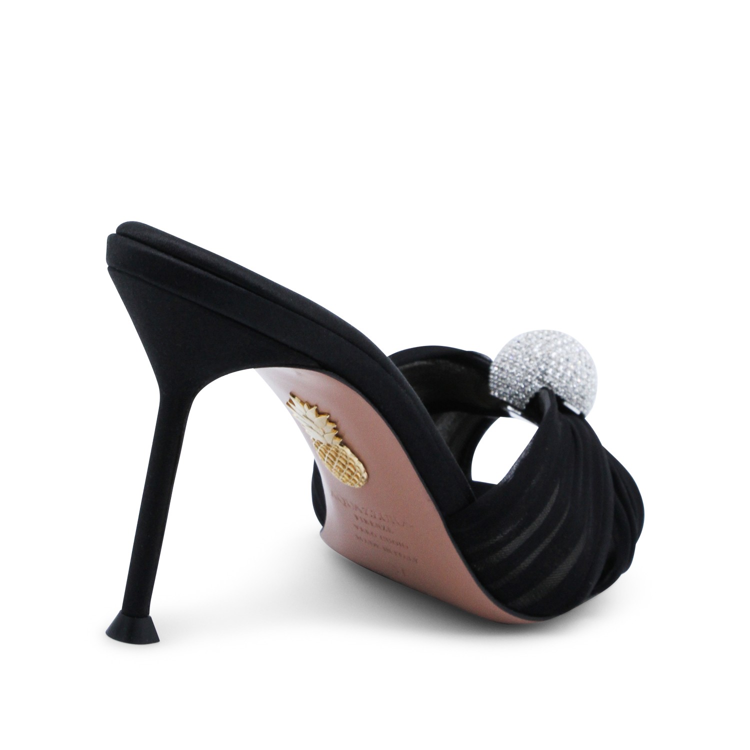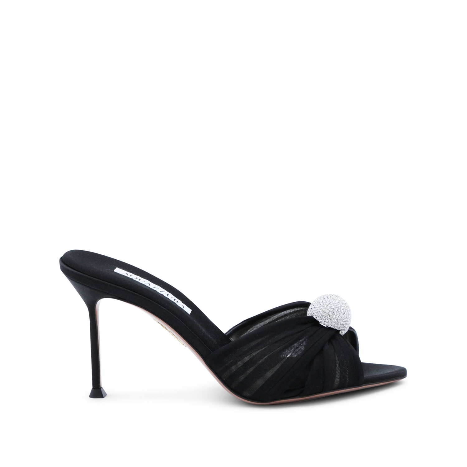 Black Mistery Mule 85 sandals from Aquazzura featuring round open toe, slip-on style, crystal-studded sphere embellishment, stiletto heel and branded sole.