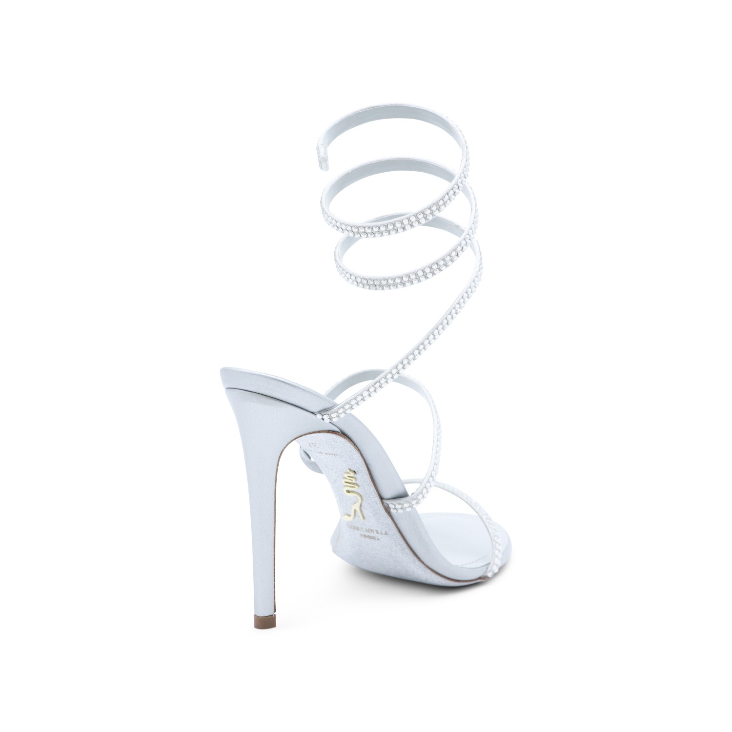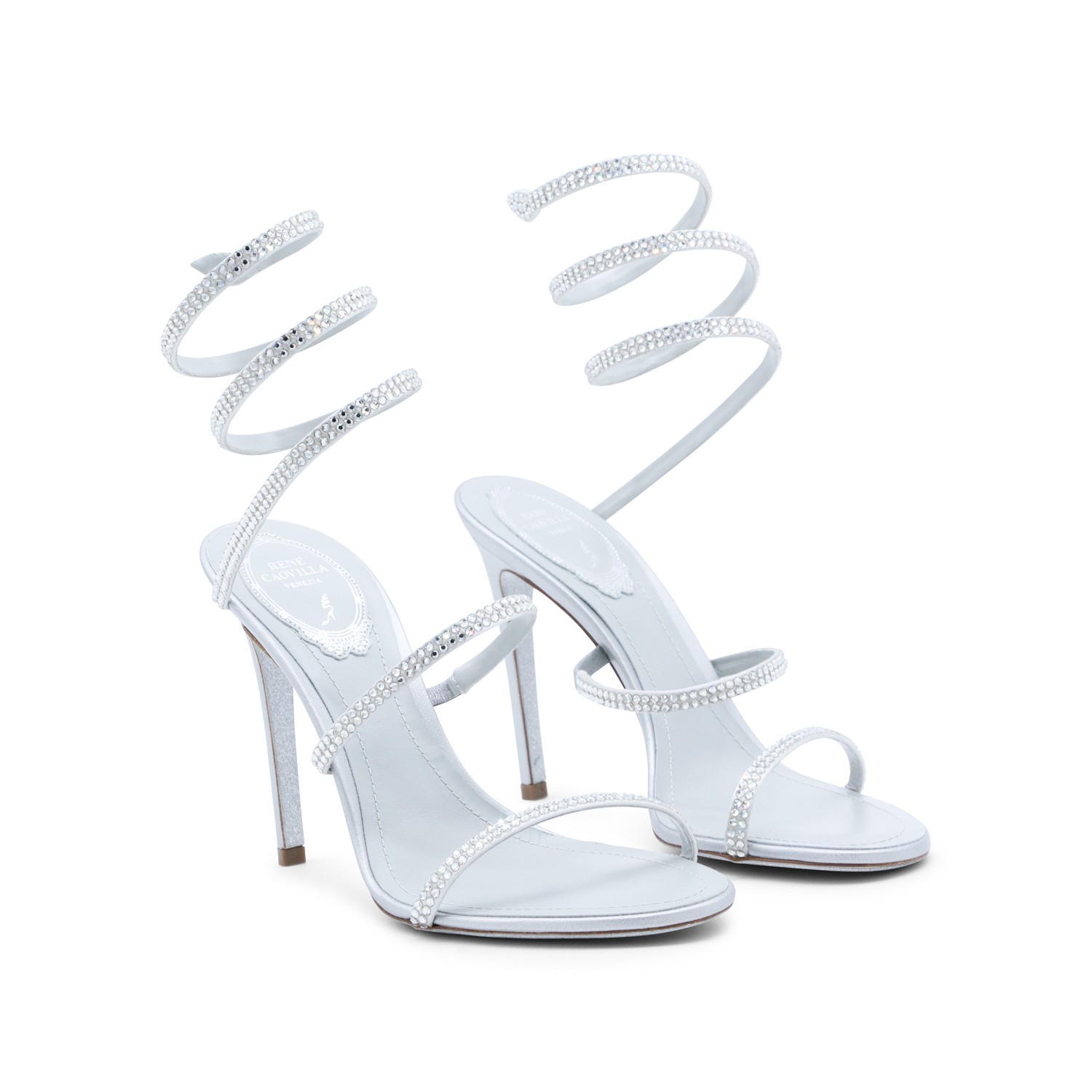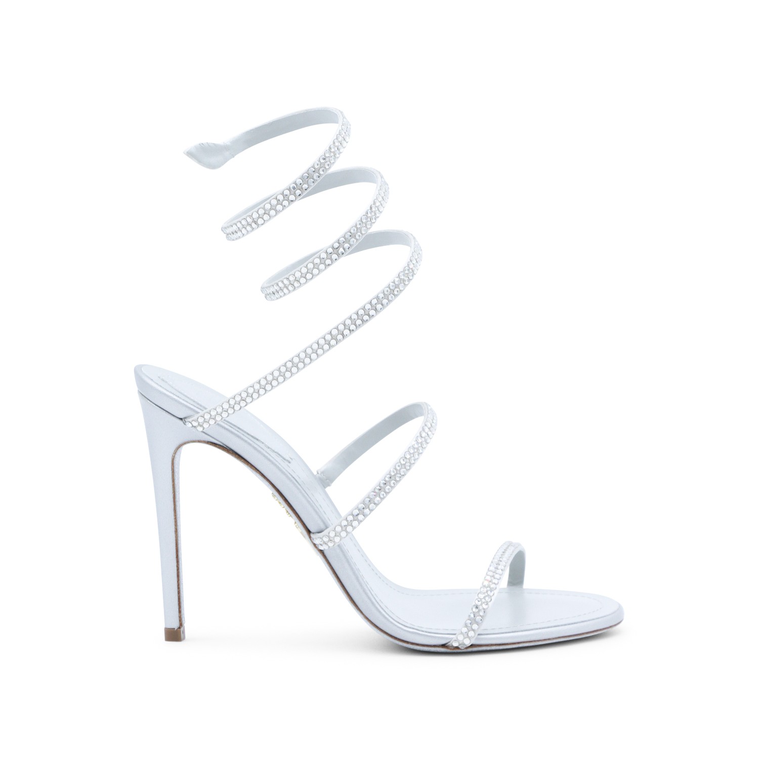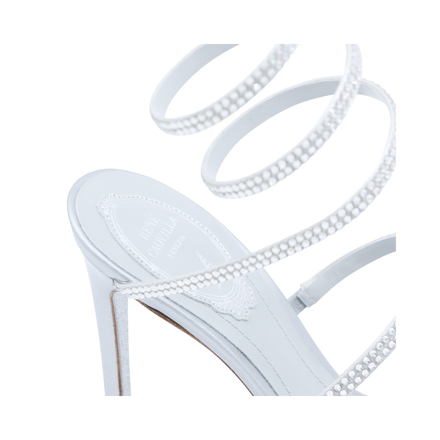 Silver leather Cleo sandals from René Caovilla featuring round open toe, frontal thin strap, stiletto heel, snake ankle strap, all-over crystals and stardust sole.