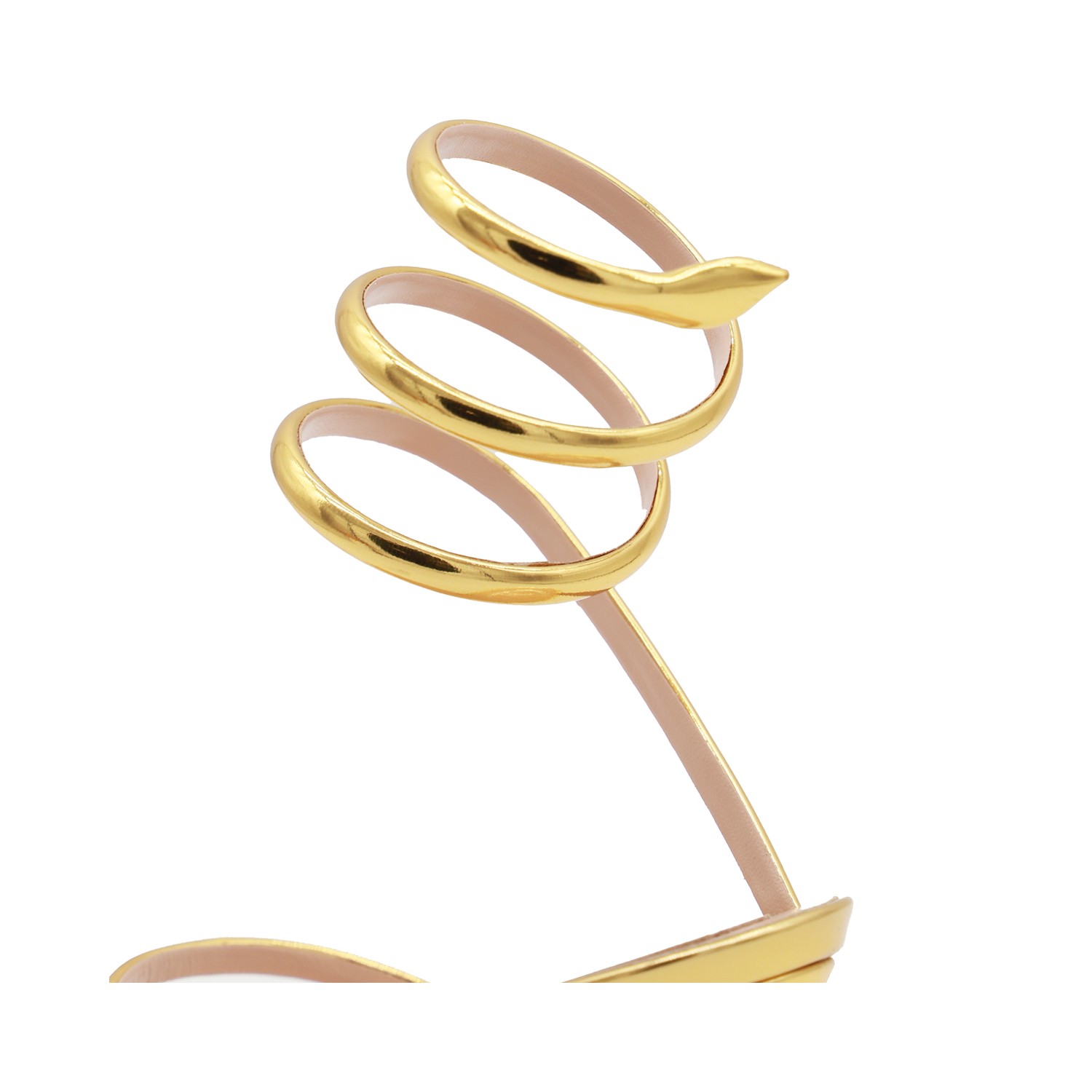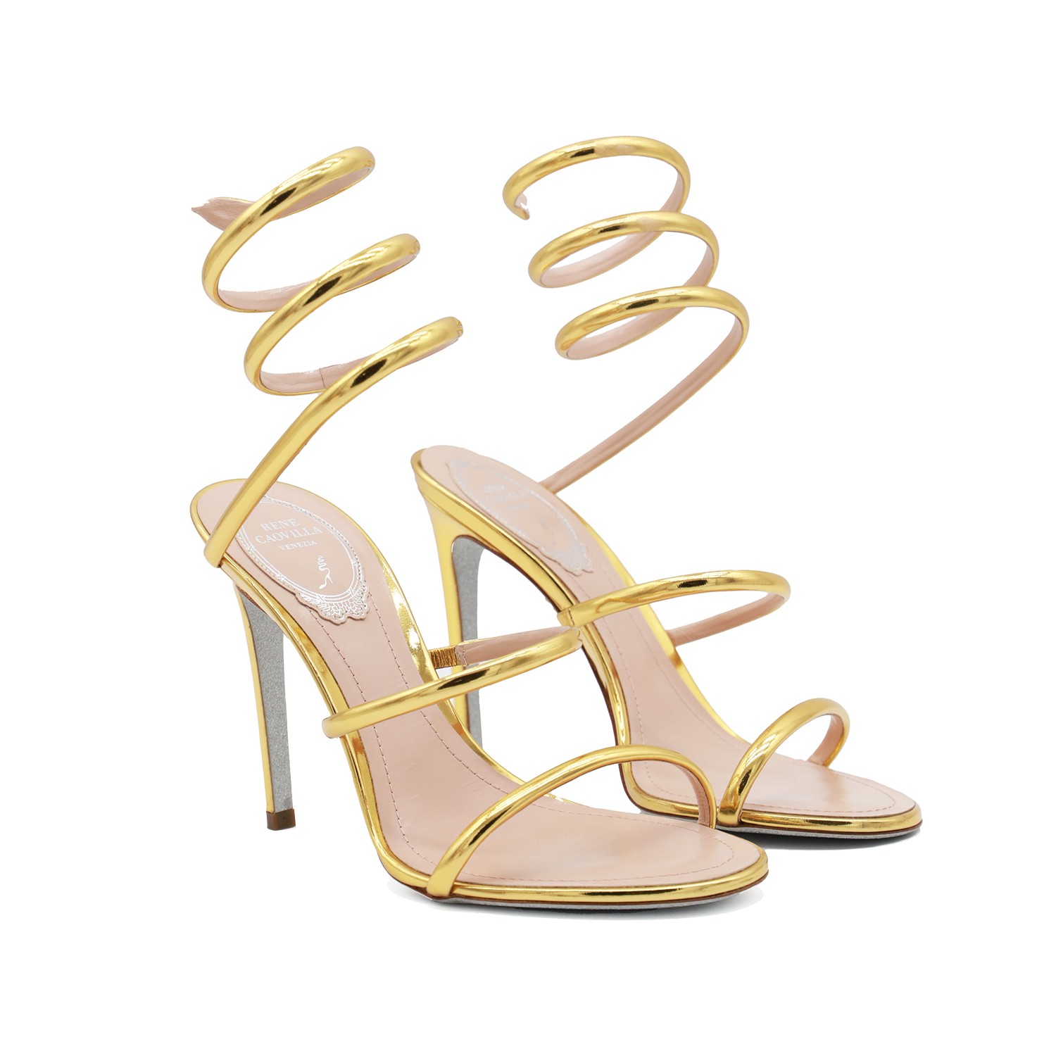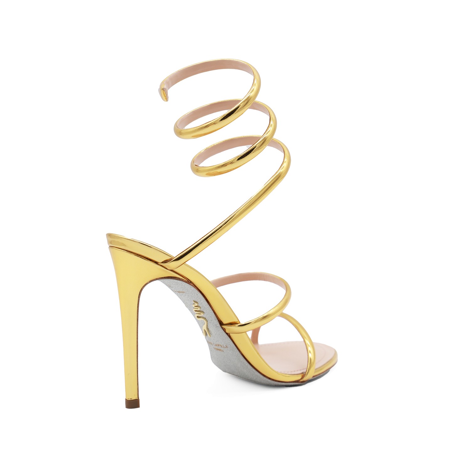 Gold tone leather sandals from Rene Caovilla featuring round toe, ankle detail, stiletto heel and open back.