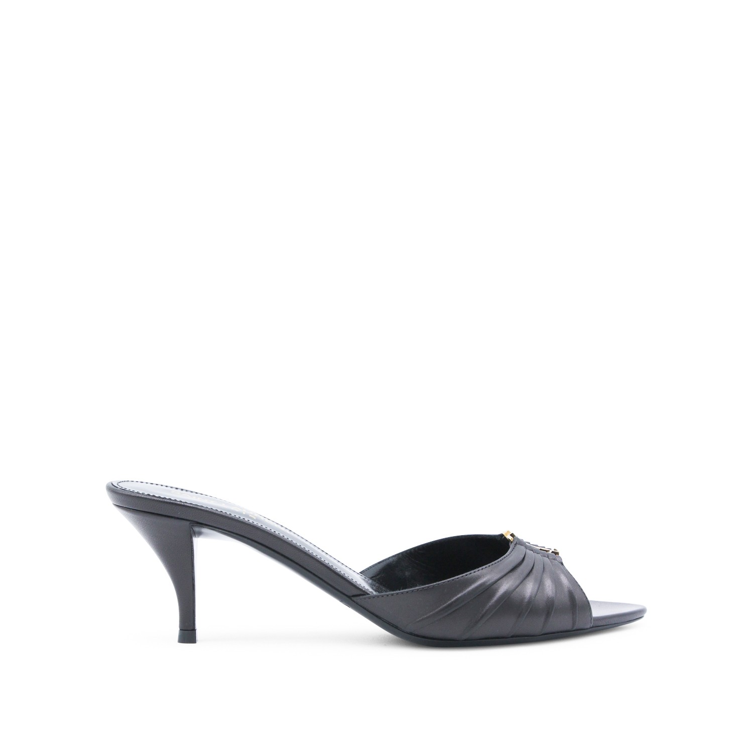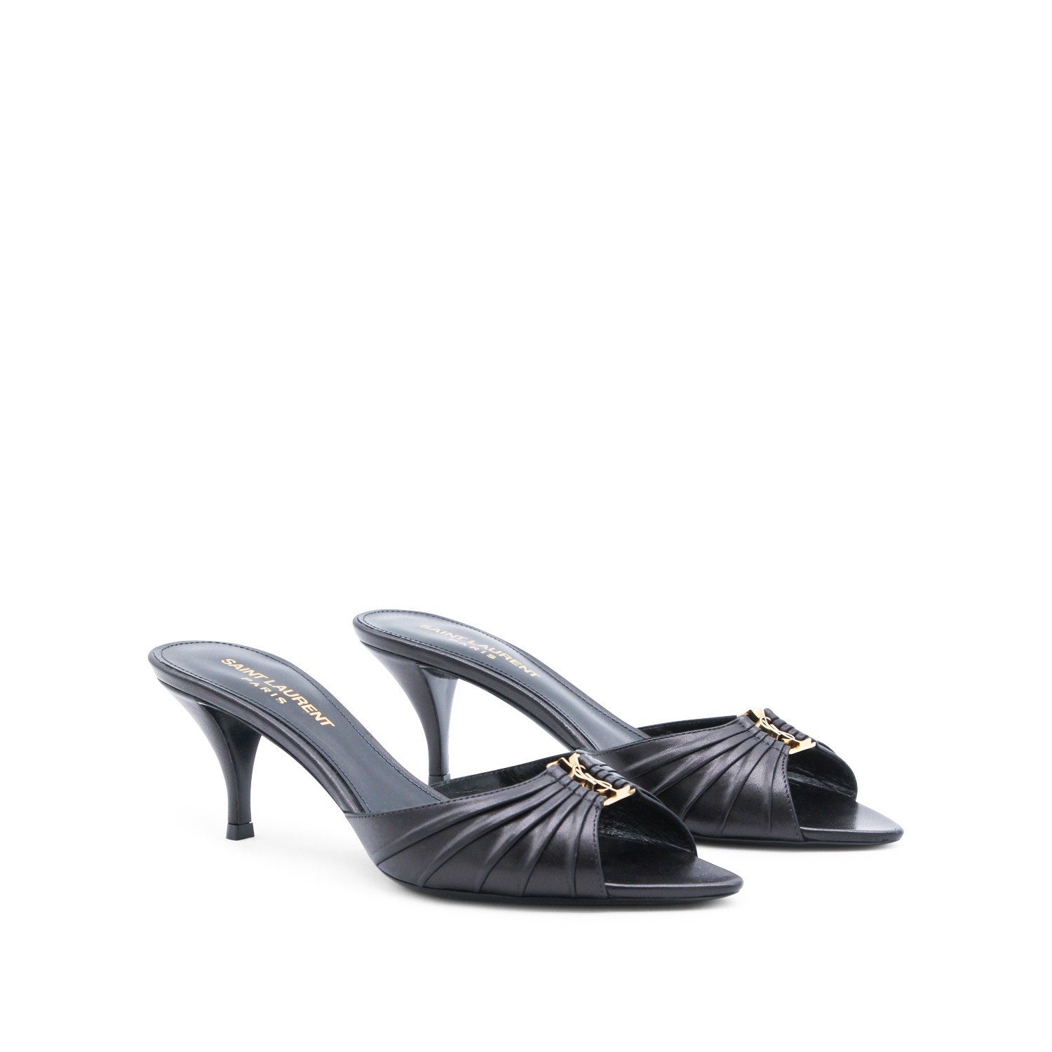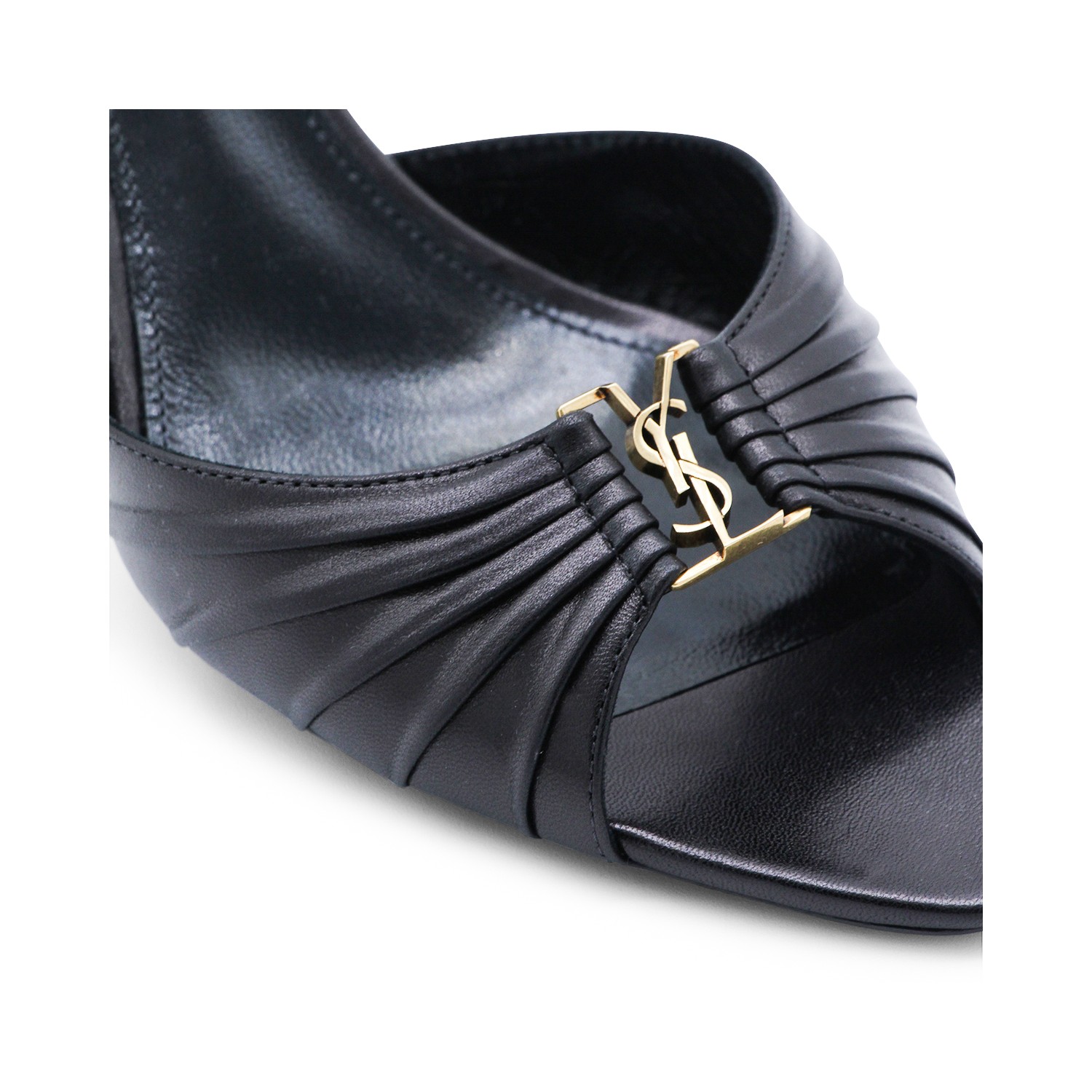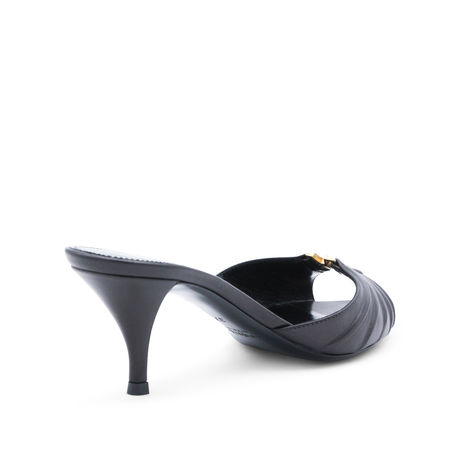Black Babilone 70 sandals from Saint Laurent featuring open back, stiletto heel and frontal logo patch.