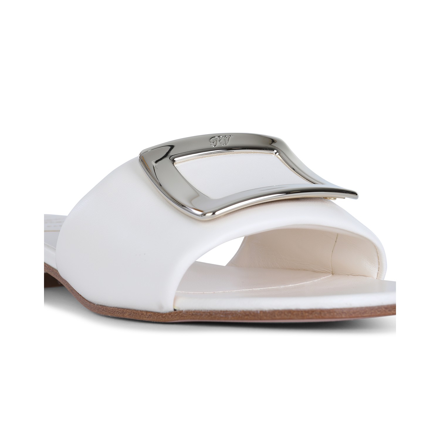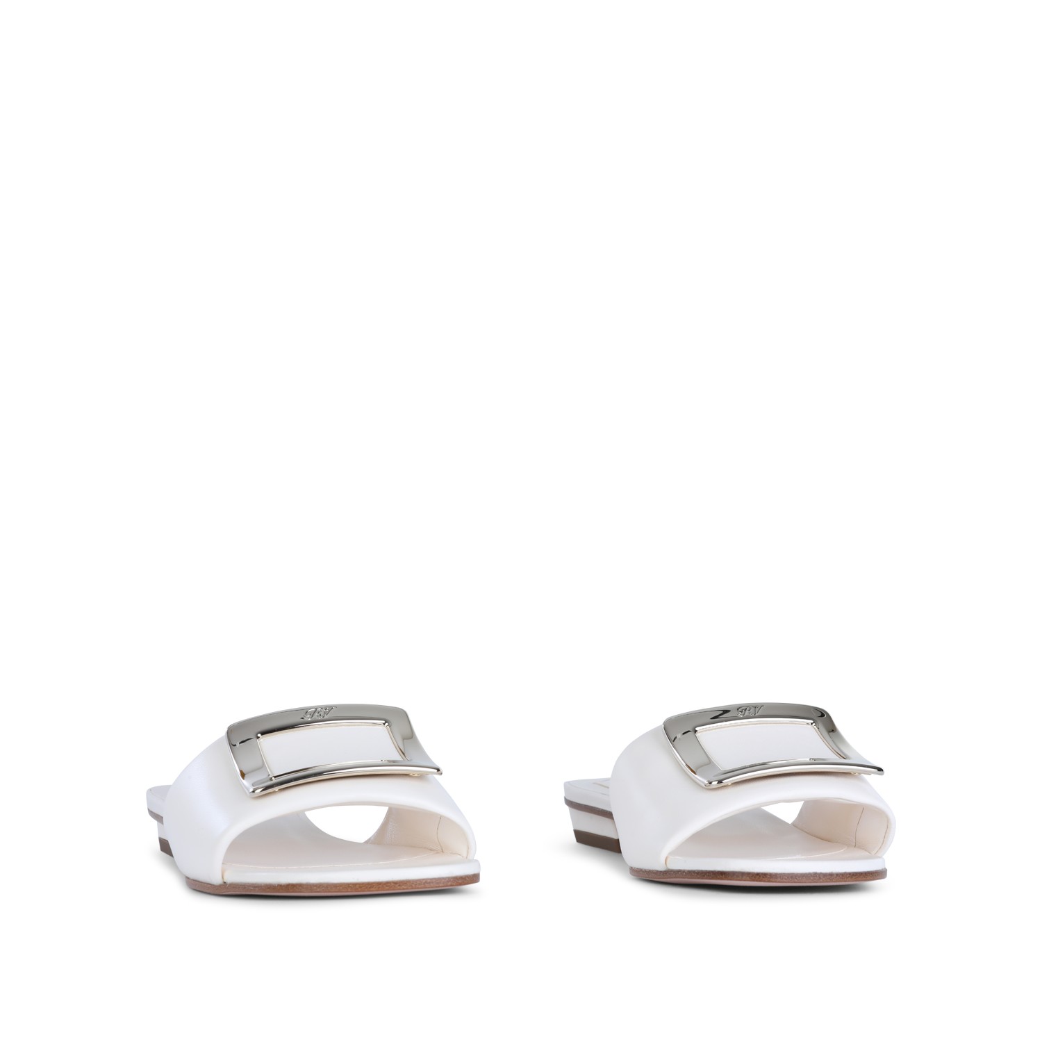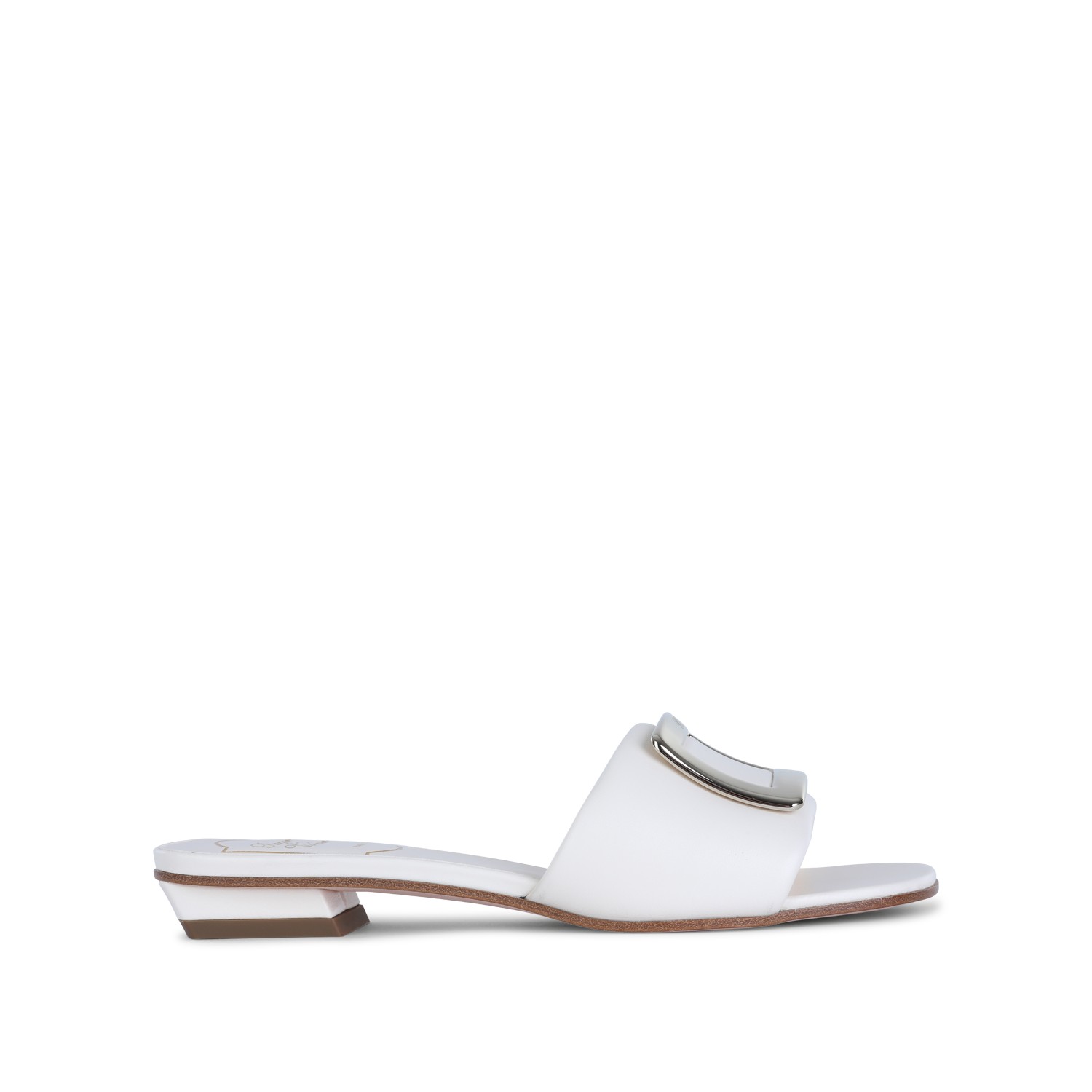 White leather sandals from Roger Vivier featuring round open toe, square heel, open back, silver tone logo hardware, leather sole and regular fit.