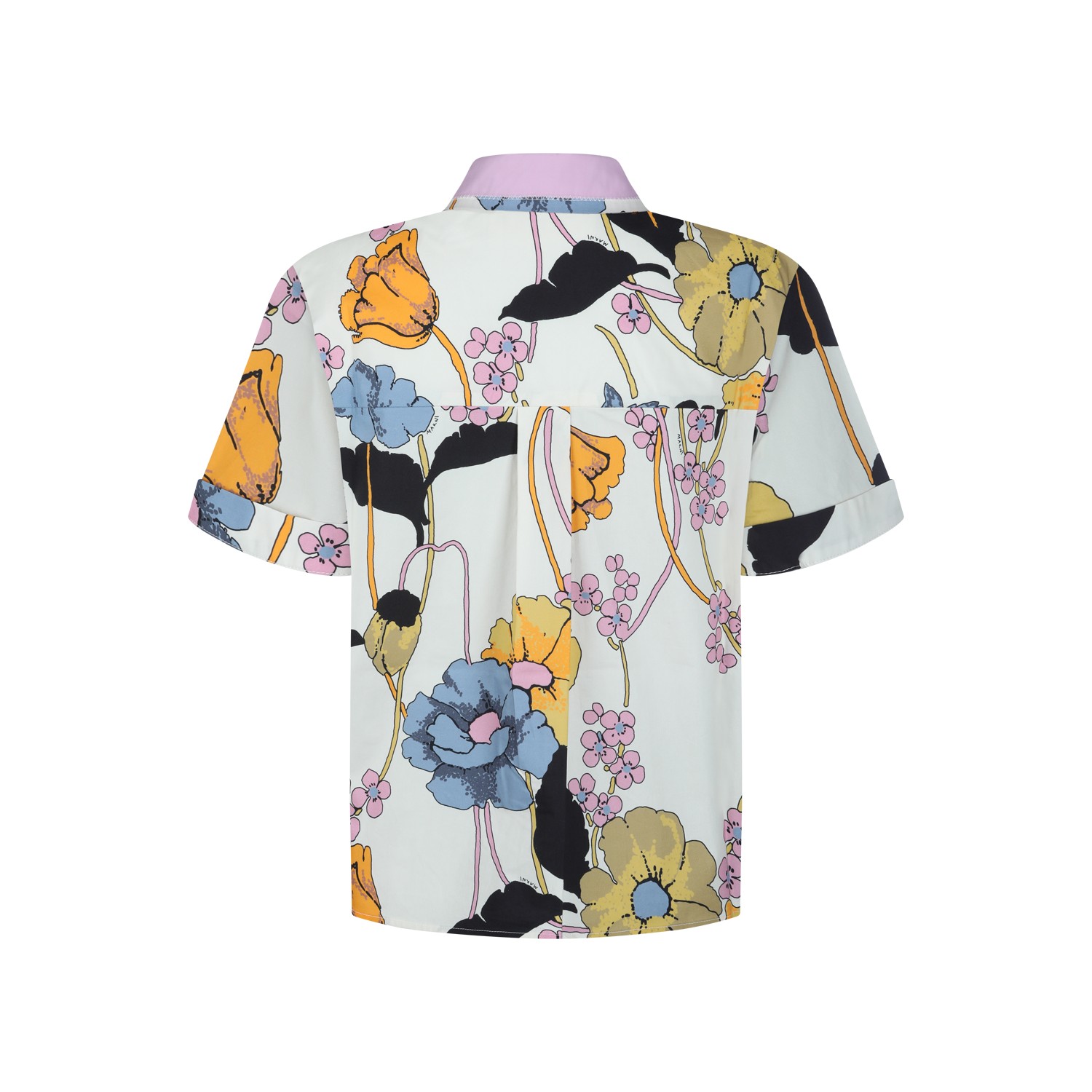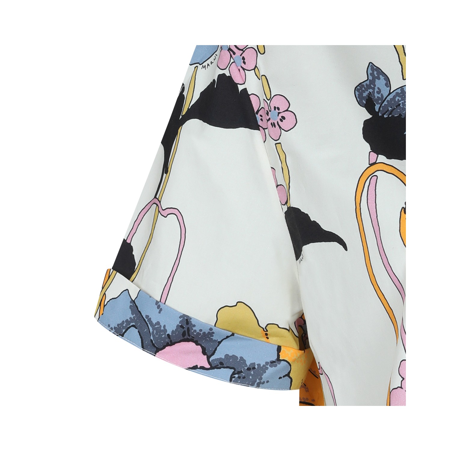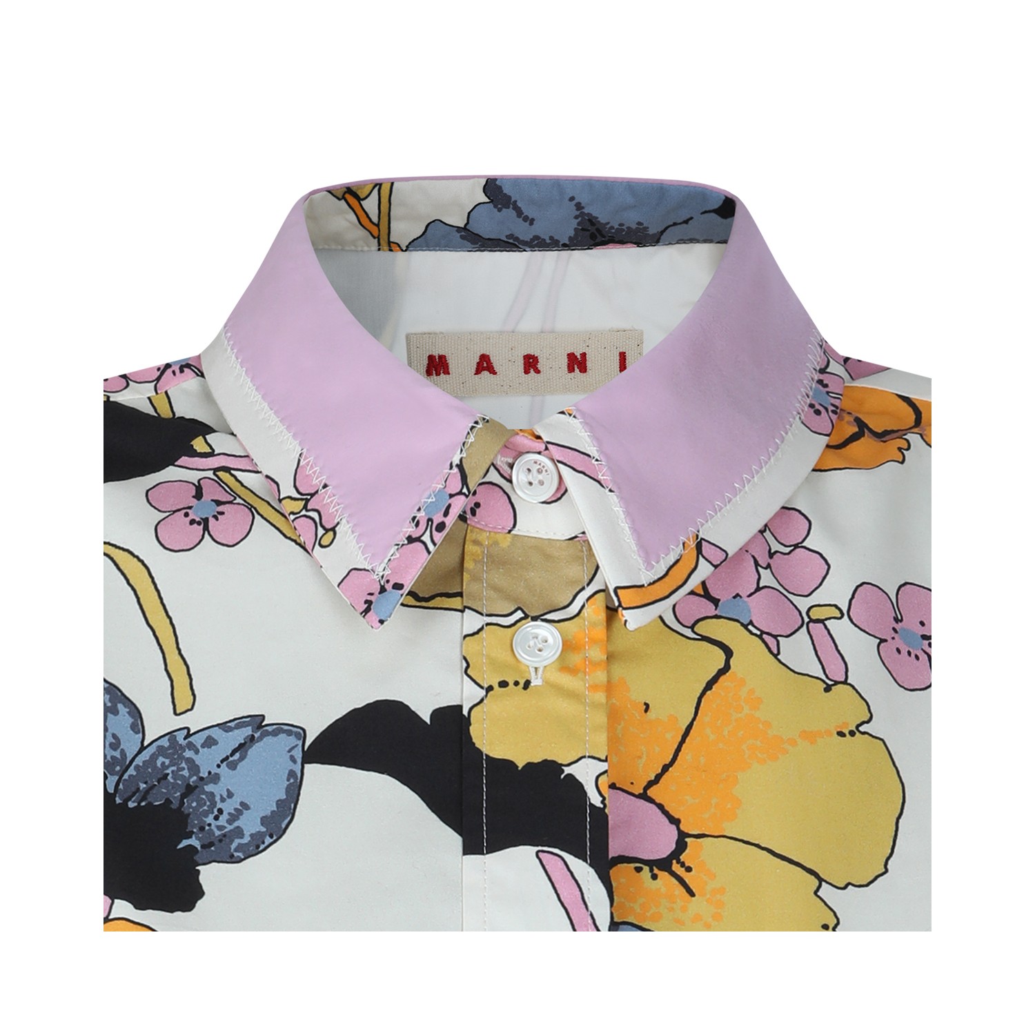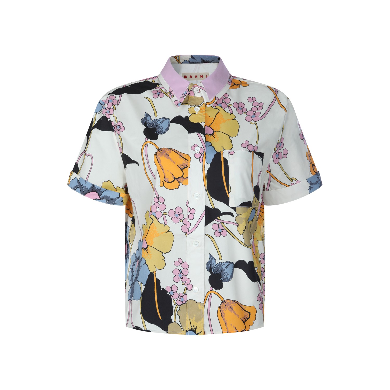White cotton shirt from Marni featuring regular collar, buttons fastening, short sleeves and all over print.