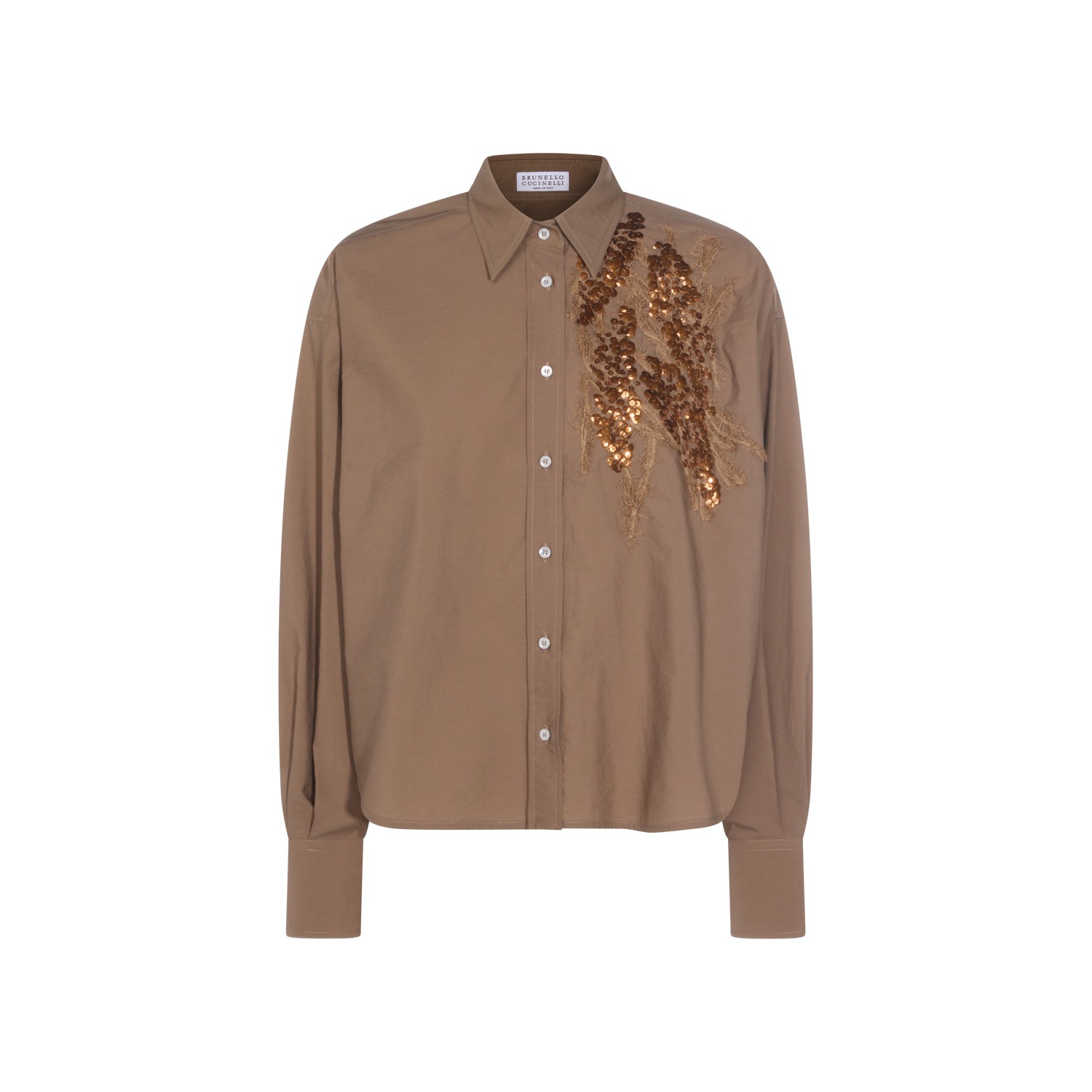 Brown cotton shirt from Brunello Cucinelli featuring long sleeves, frontal buttons fastening, shirt collar, embroidered detail and regular vestibility.