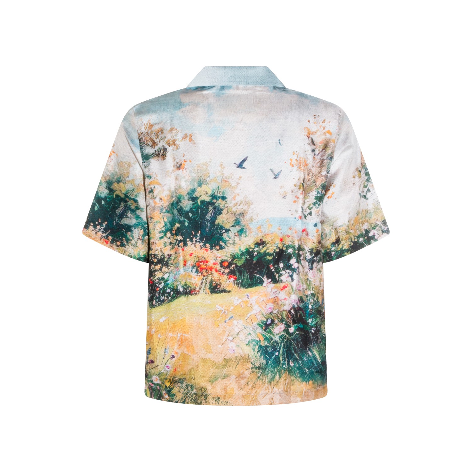 Multi silk shirt from Amiri featuring short sleeves, shirt collar, buttons fastening, all over stamp, frontal logo at chest and regular vestibility.