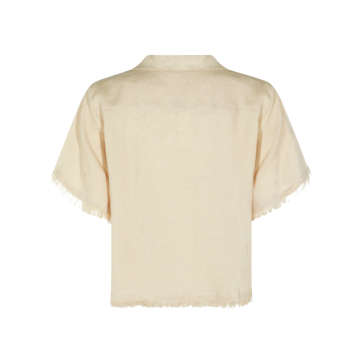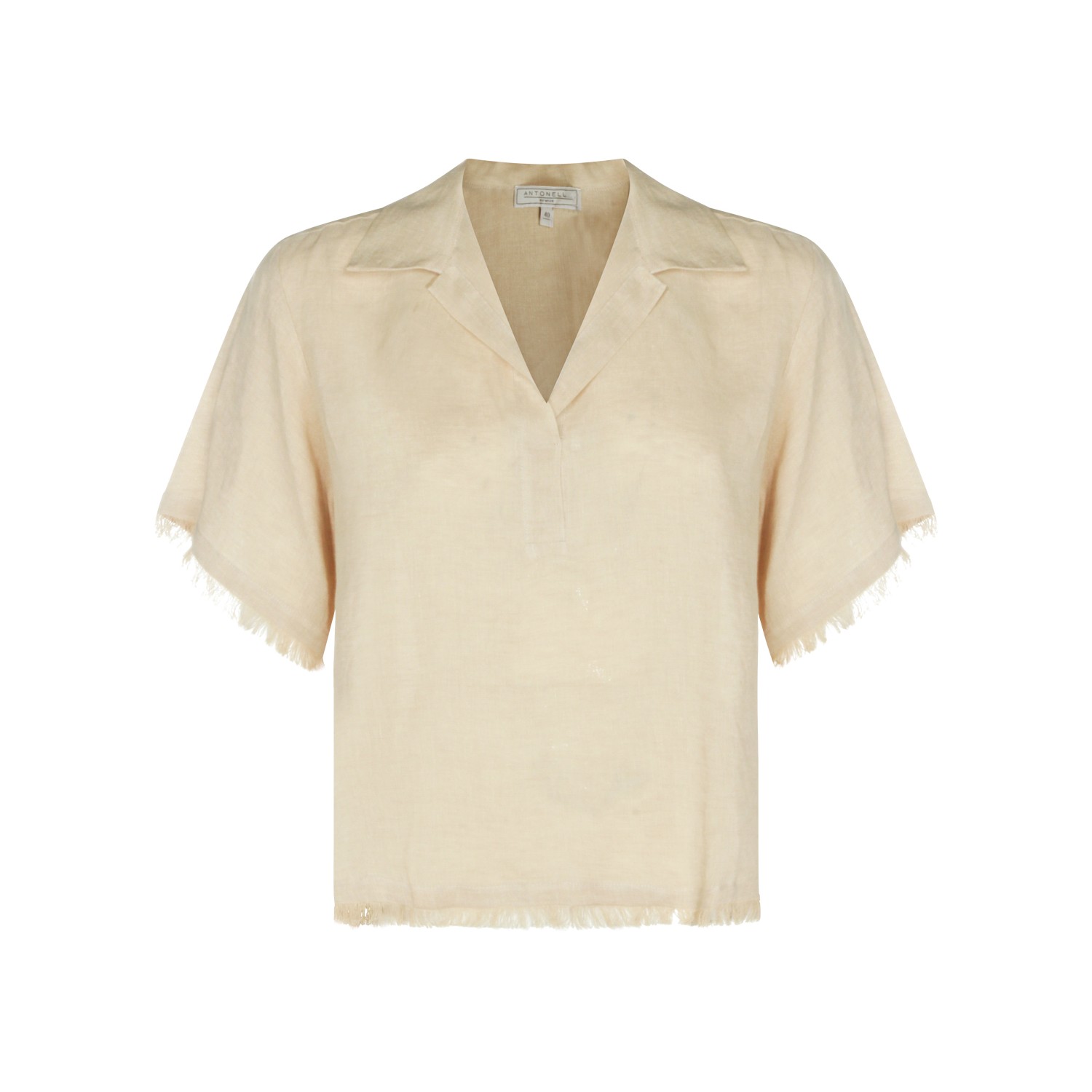 Beige linen shirt from Antonelli Firenze featuring v neckline, short sleeves, fringed hem and regular fit.