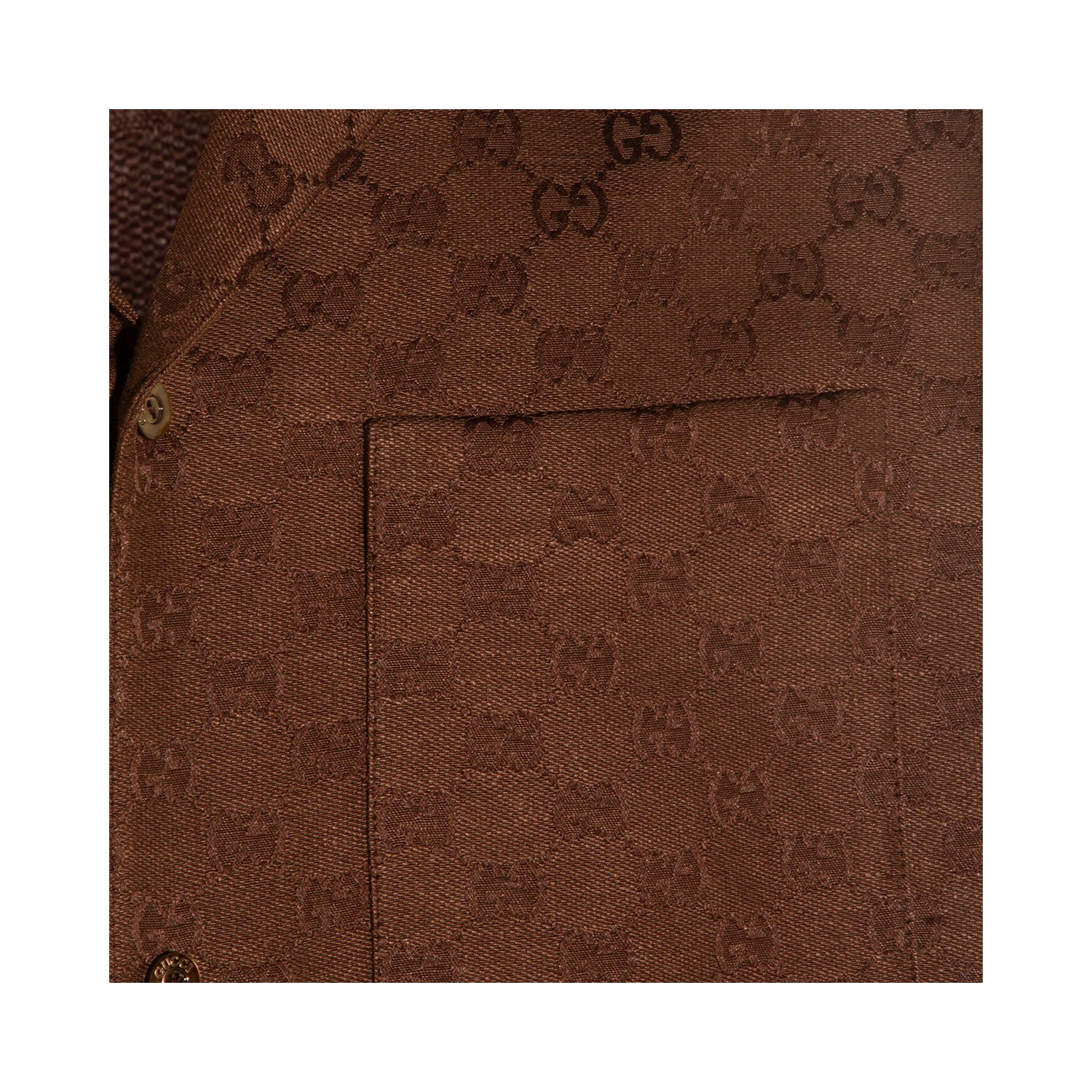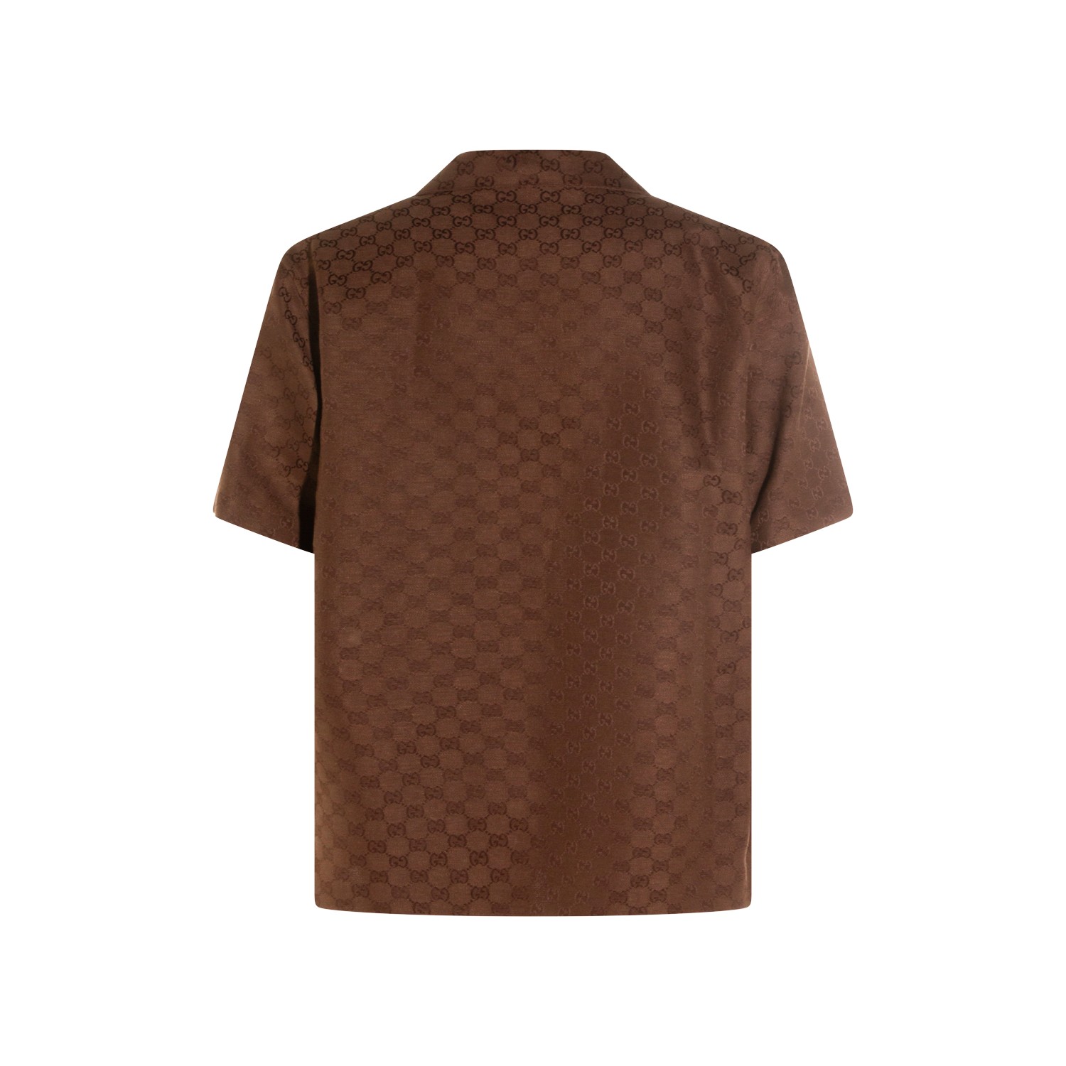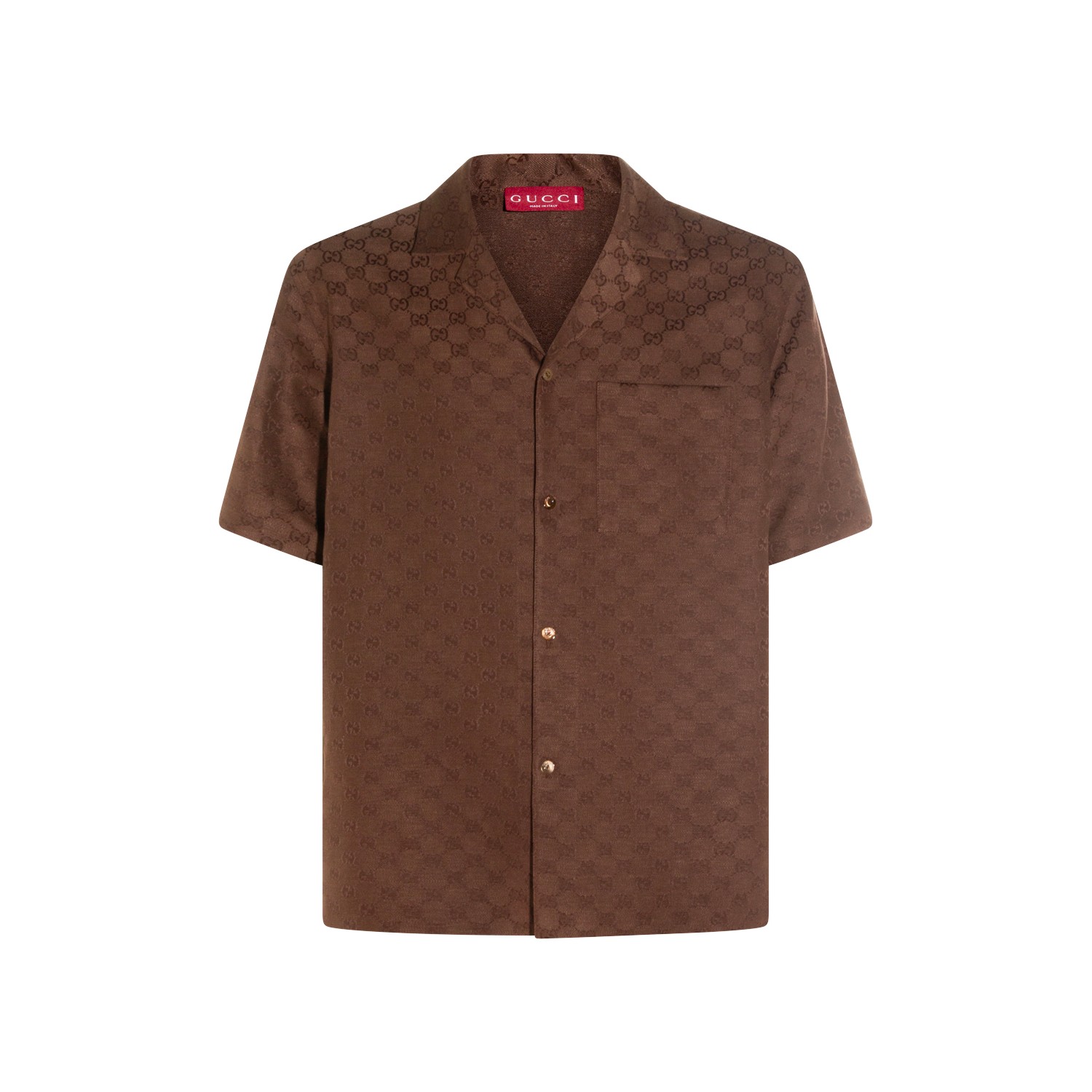 Brown shirt from Gucci featuring short sleeves, shirt collar, buttons fastening, frontal pocket, all over iconic GG stamp and regular vestibility.