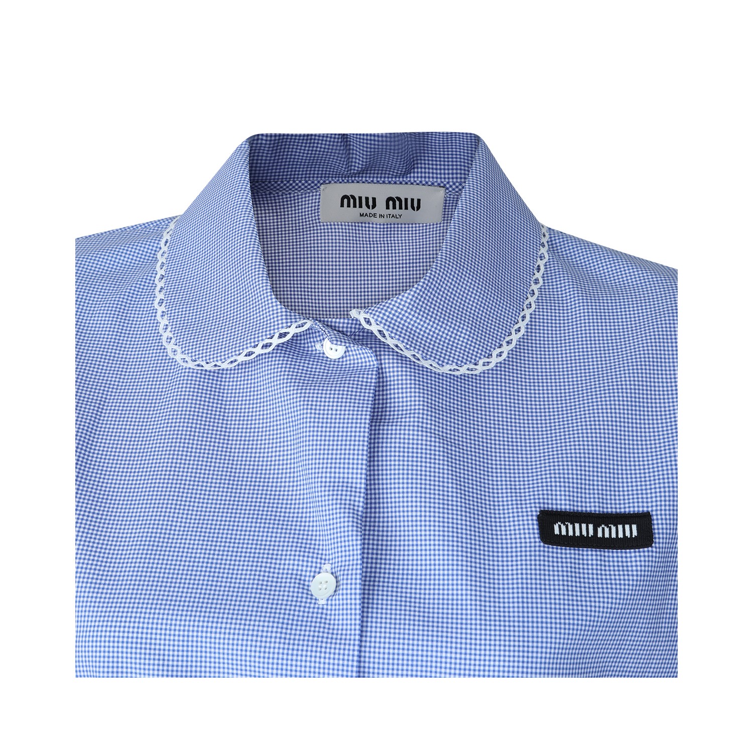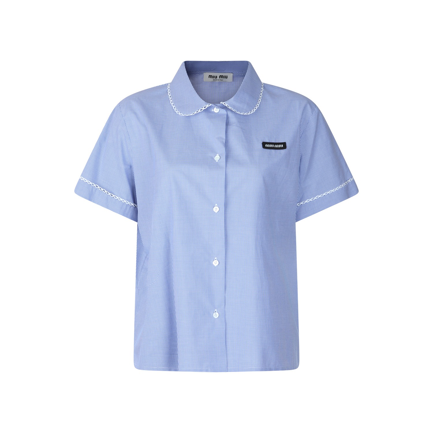 Light blue cotton shirt from Miu Miu featuring short sleeves, button closure, logo label and contrasted profiles.