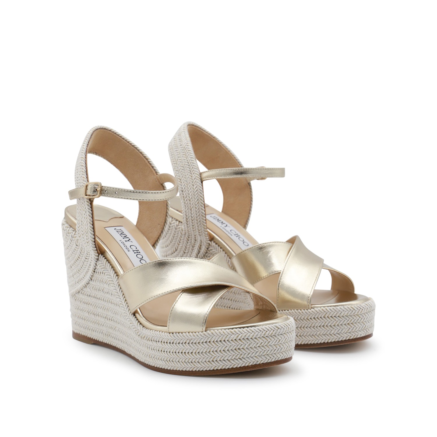 White leather espadrillas from Jimmy Choo featuring open toe, rope wedge, upper band, adjustable buckle fastening and leather sole.