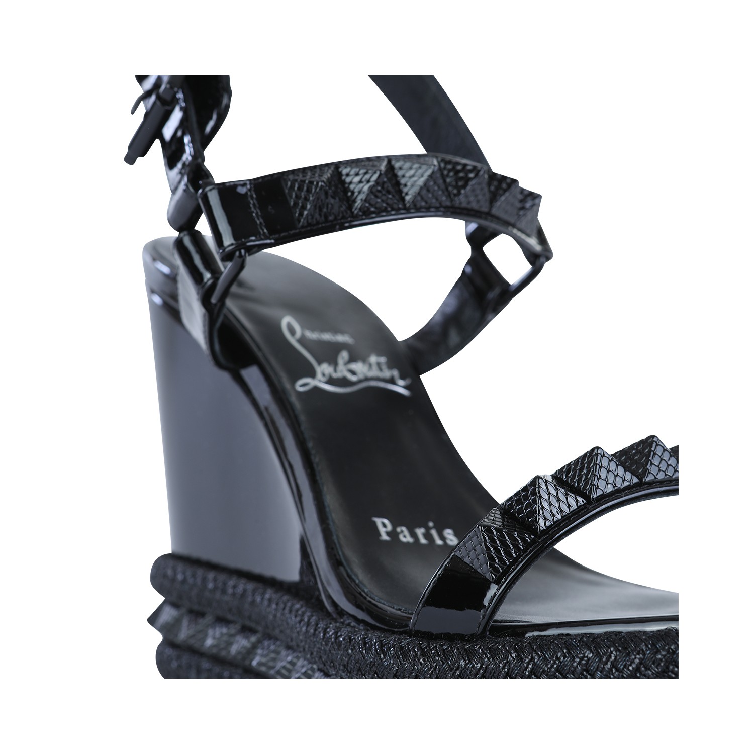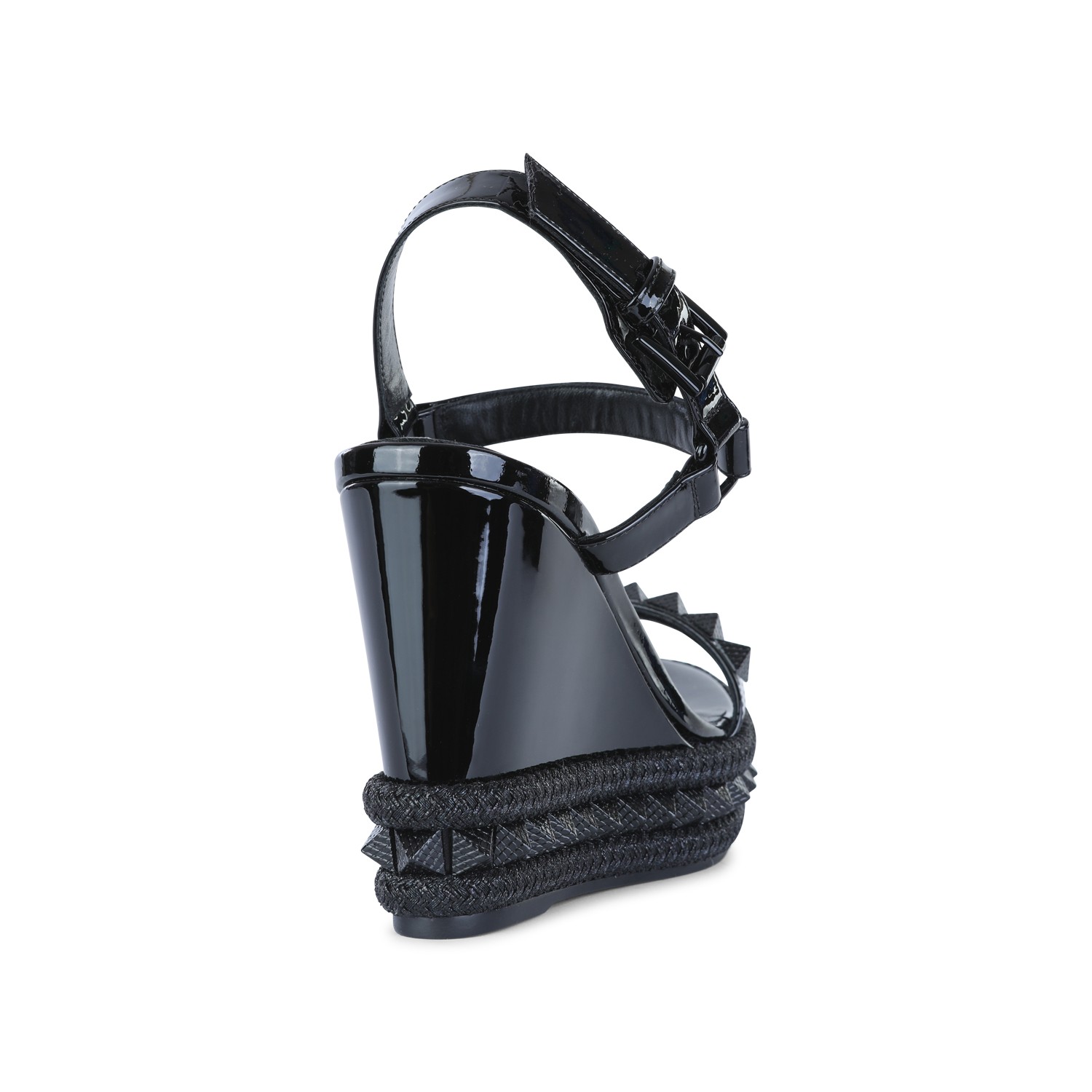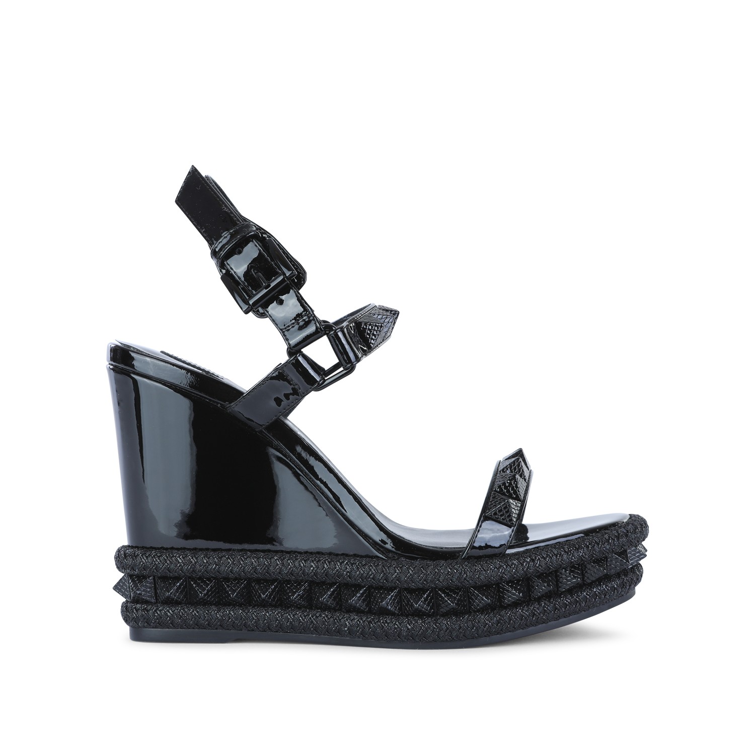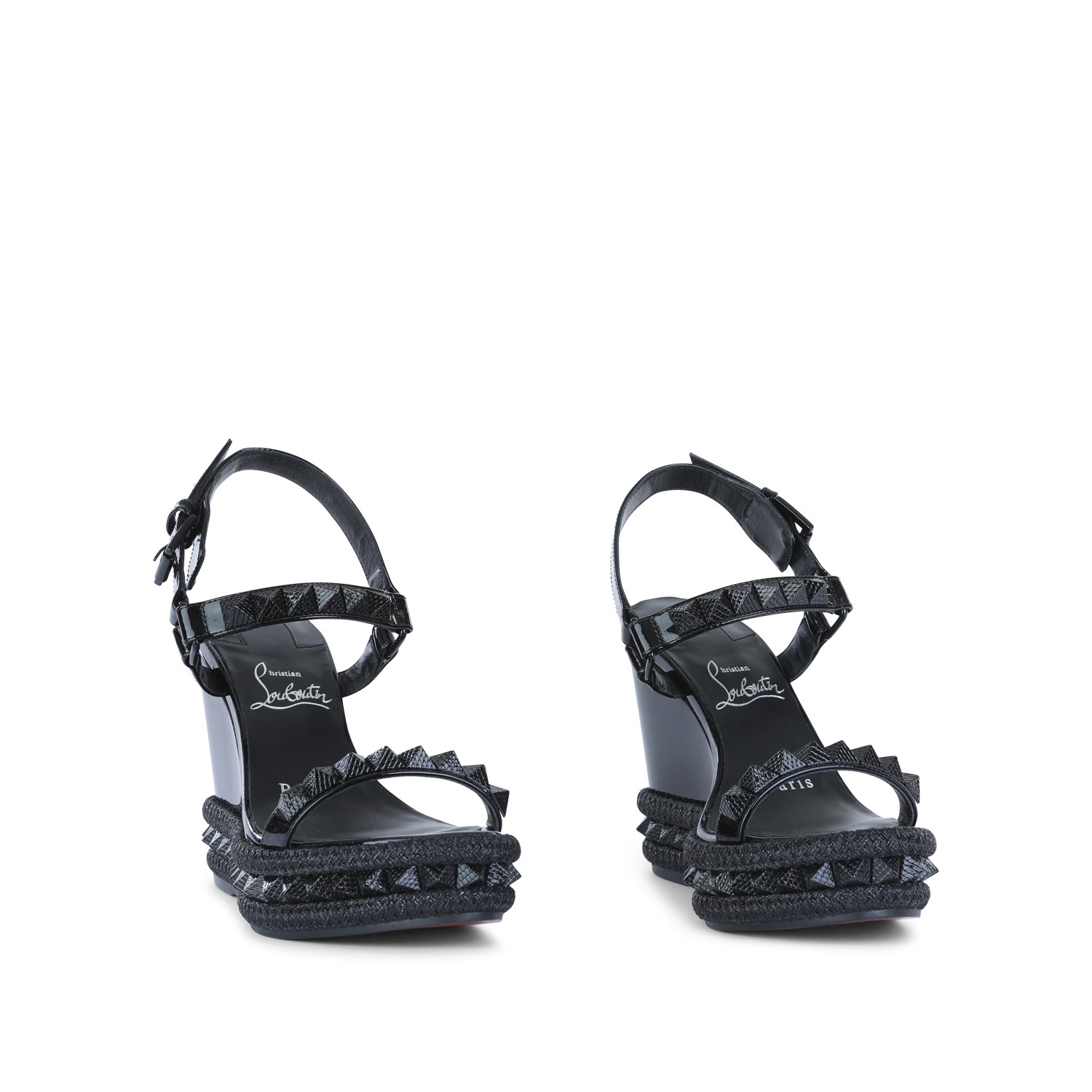 Black leather espadrillas from Christian Louboutin featuring round open toe, studs, buckle fastening, wedge heel and platform sole.