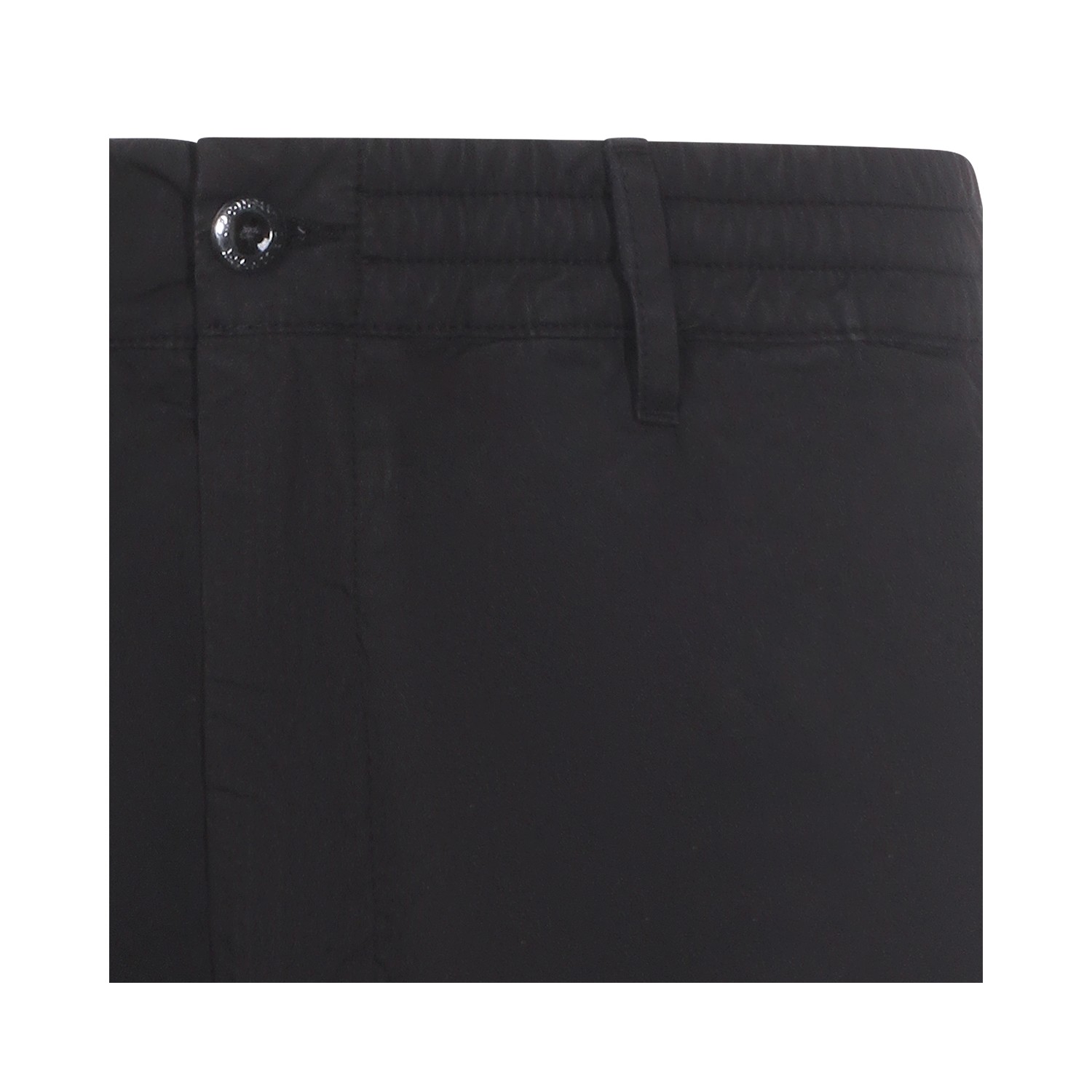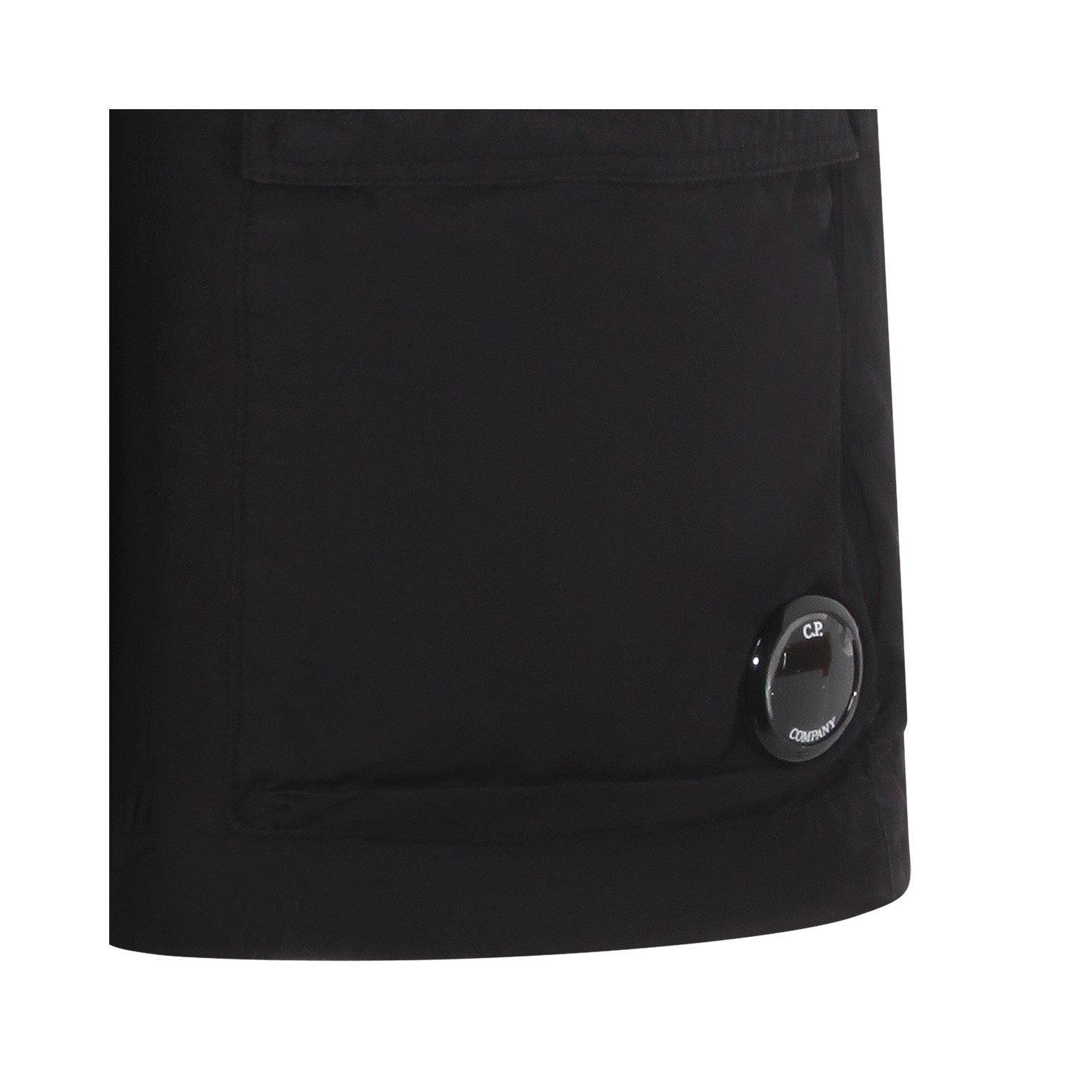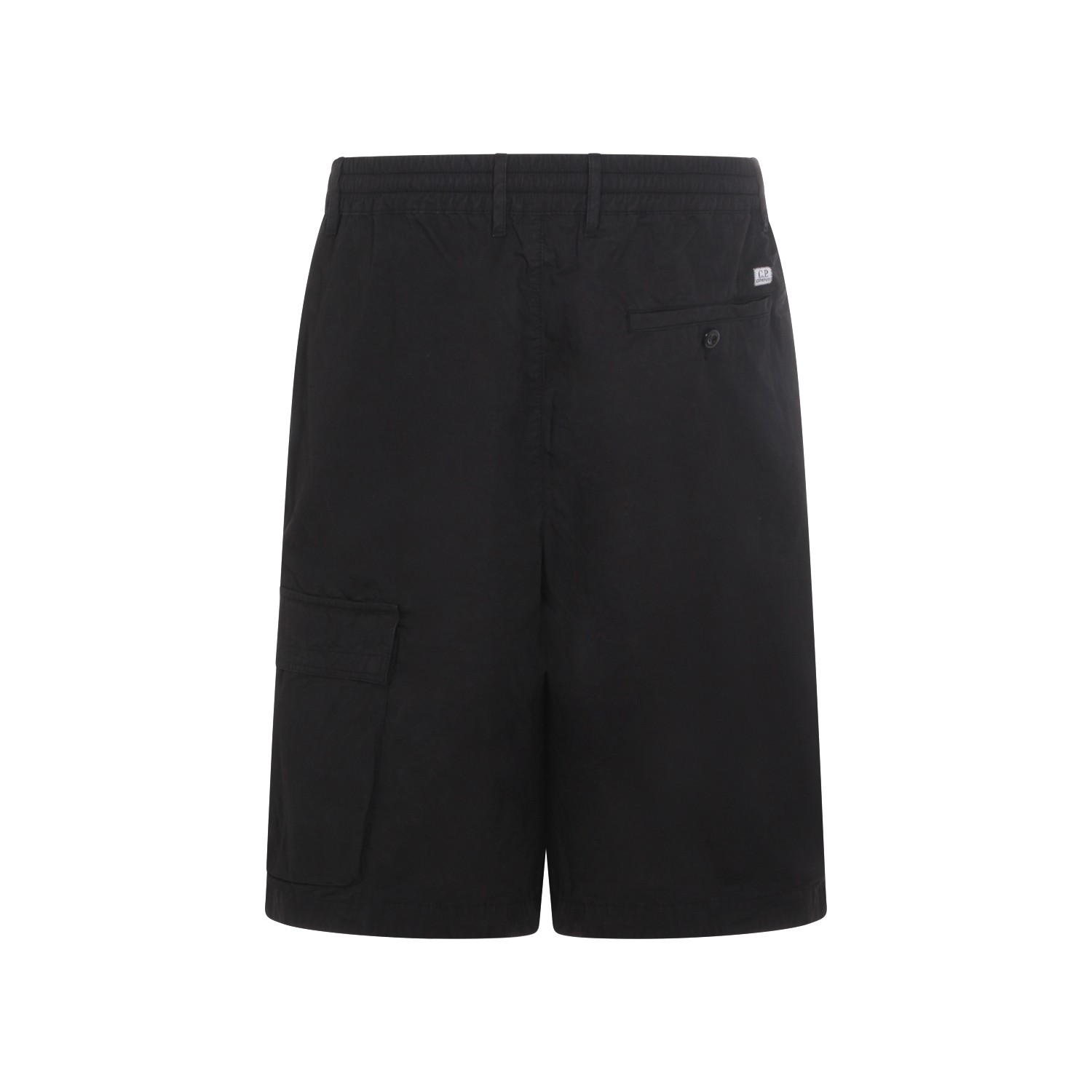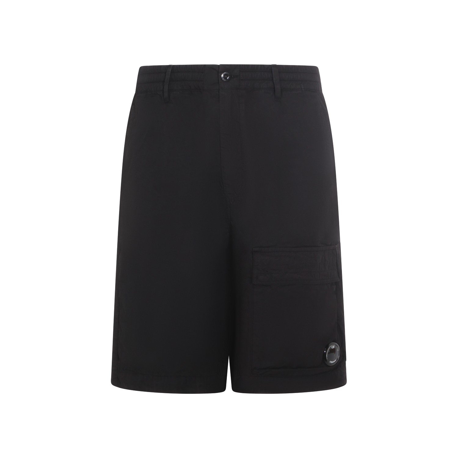 Black cotton short from CP Company featuring elastic waistband, belt loops, button and zip fastening and logo.