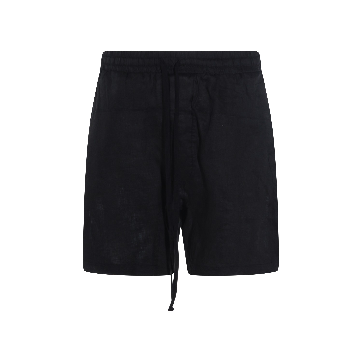 Black linen shorts from Thom Krom featuring mid length, elasticated waistband, drawstring line and side pockets.