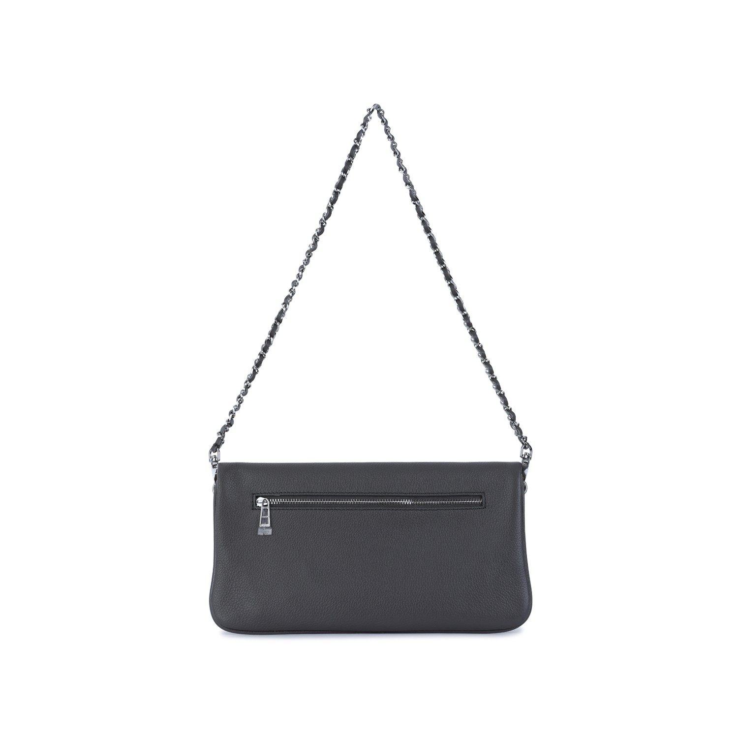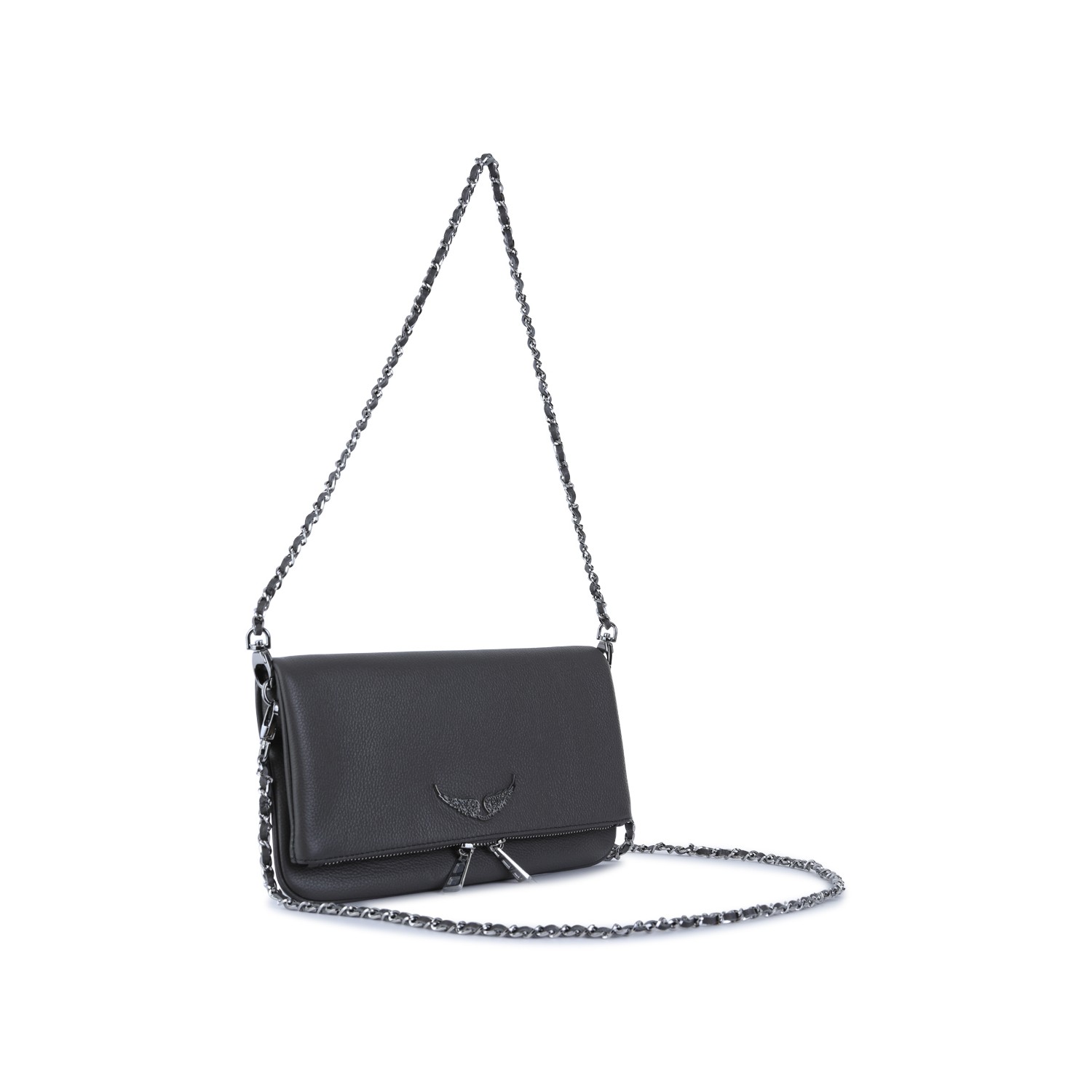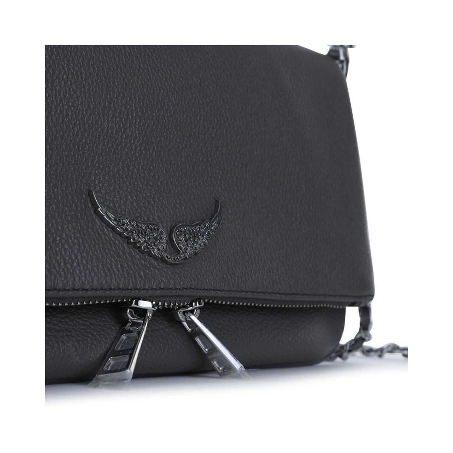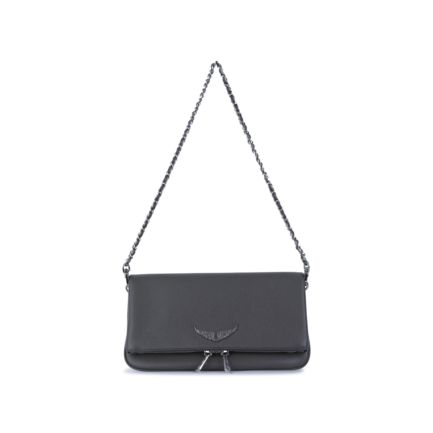 Dark grey leather Rock shoulder bag from Zadig & Voltaire featuring chain-link shoulder strap, frontal metal logo, zip fastening and main compartment.