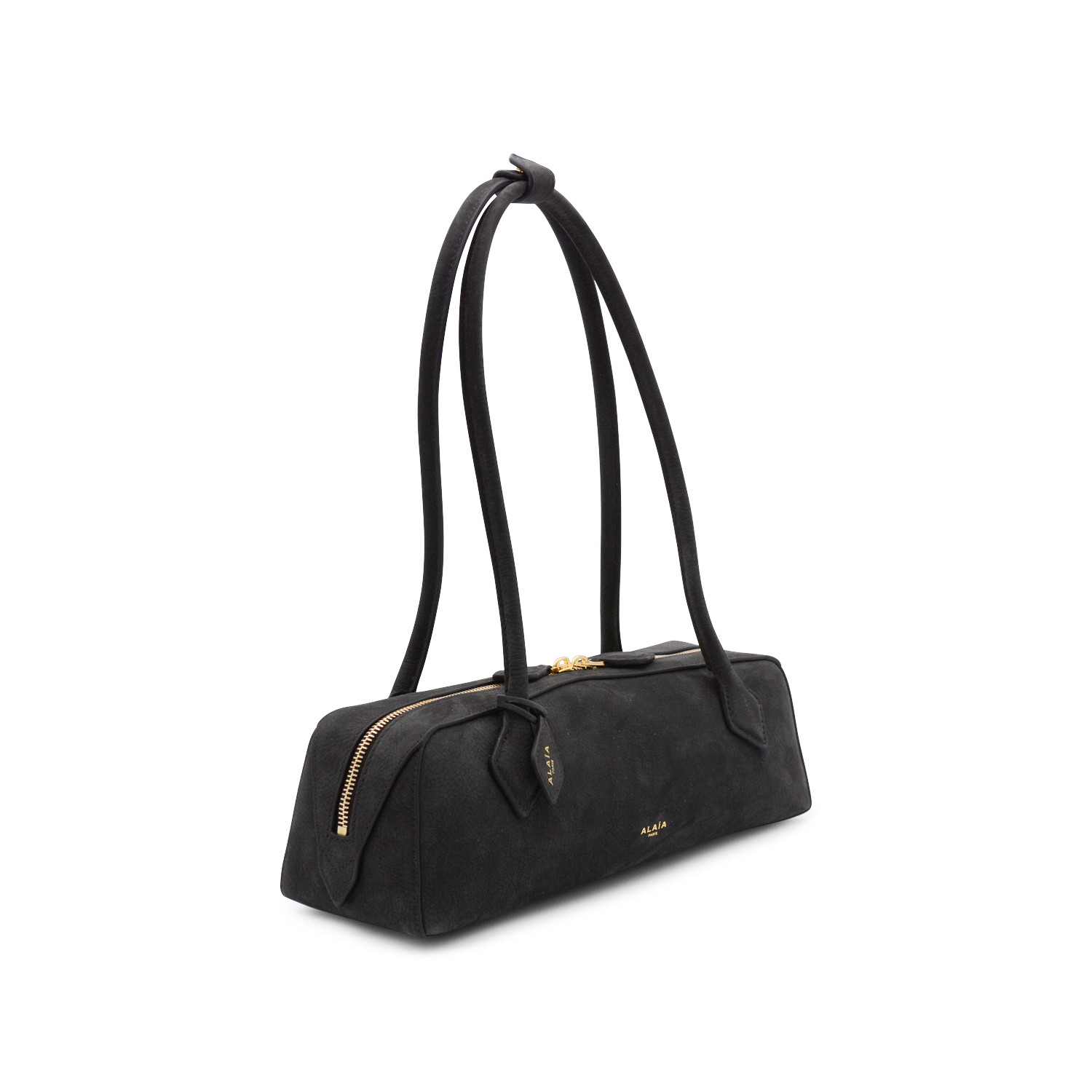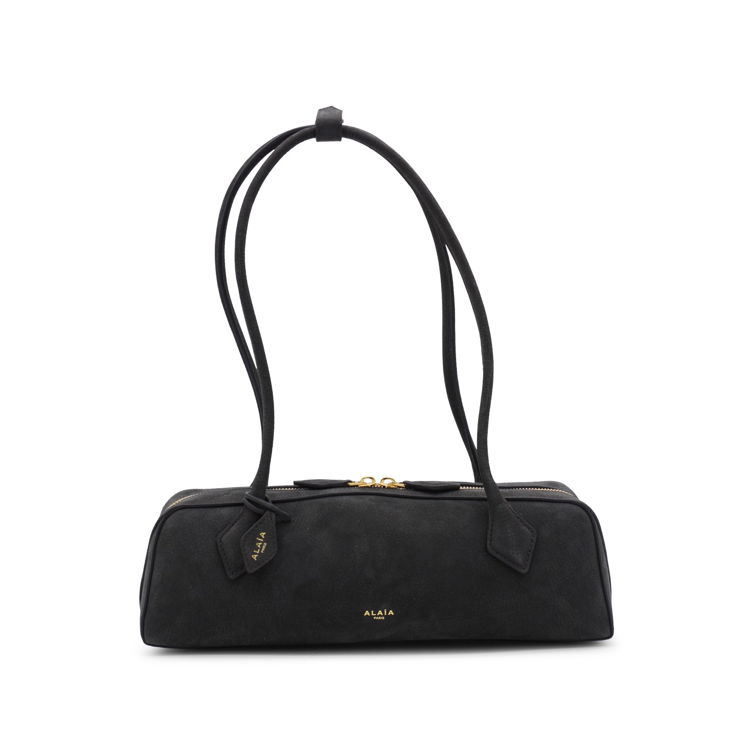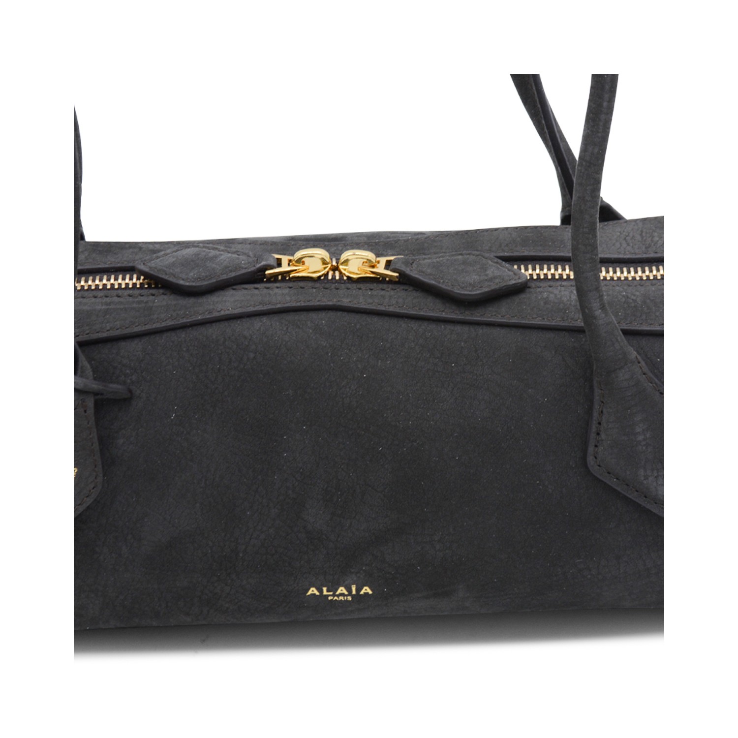 Black leather Teckel medium shoulder bag from Alaia featuring top handles, frontal logo print, suede, double zip fastenig, main compartment and internal pocket.
