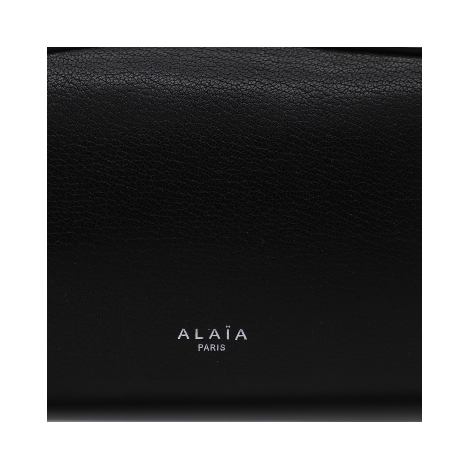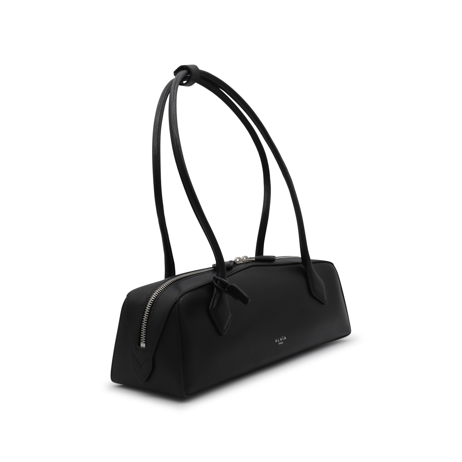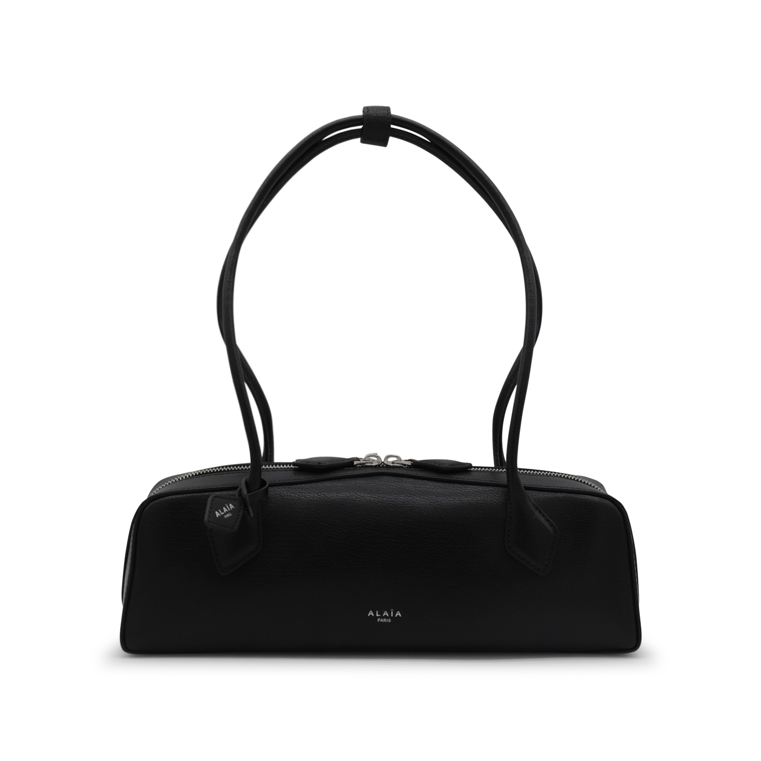 Black leather Teckel Medium shoulder bag from Alaia featuring tubolar handles, rectangular shape, double zip closure, frontal logo and main compartment.