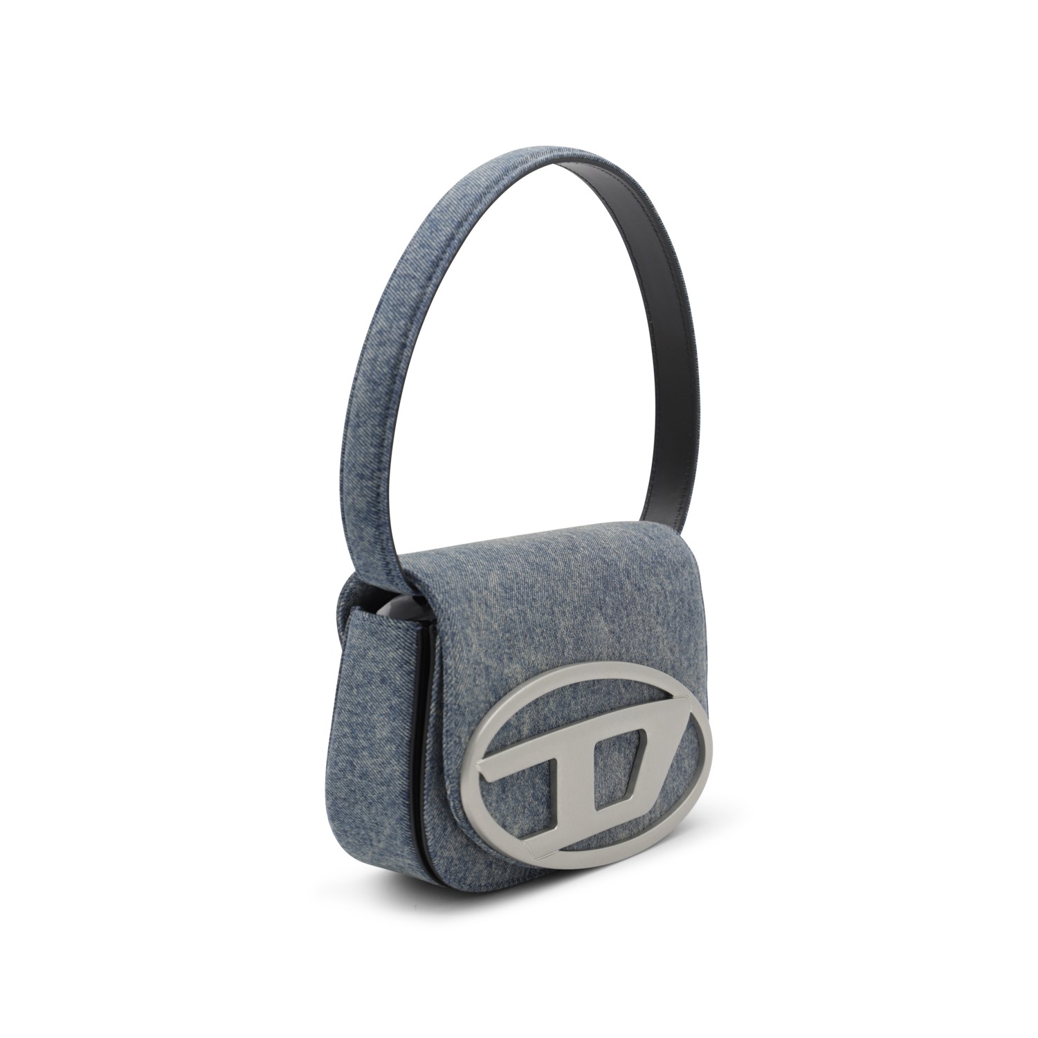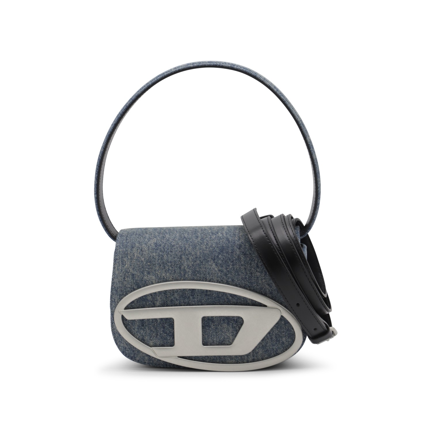 Denim 1DR shoulder bag from Diesel featuring single top handle, bleached effect, foldover top with magnetic fastening, adjustable detachable shoulder strap, logo plaque to the front, internal slip pocket, internal logo patch and main compartment.