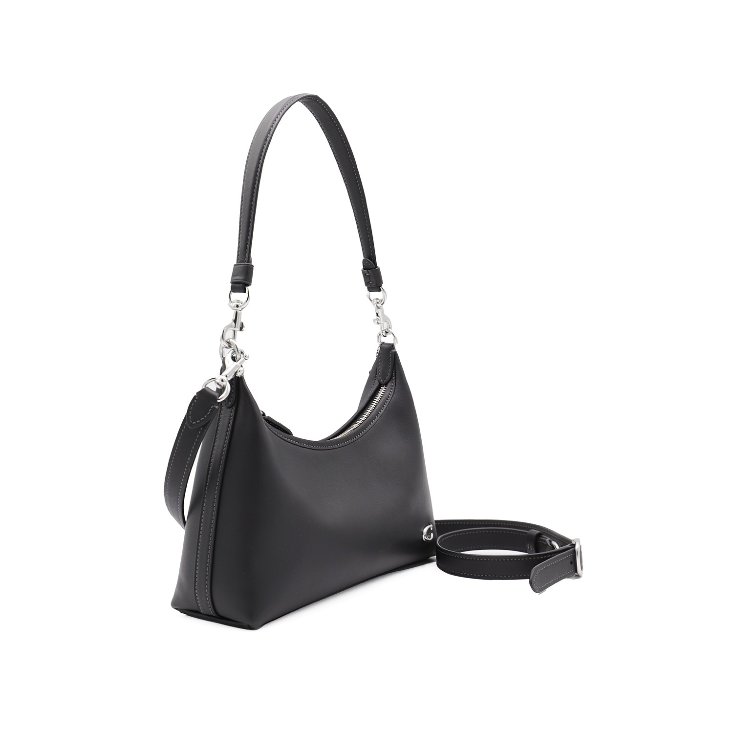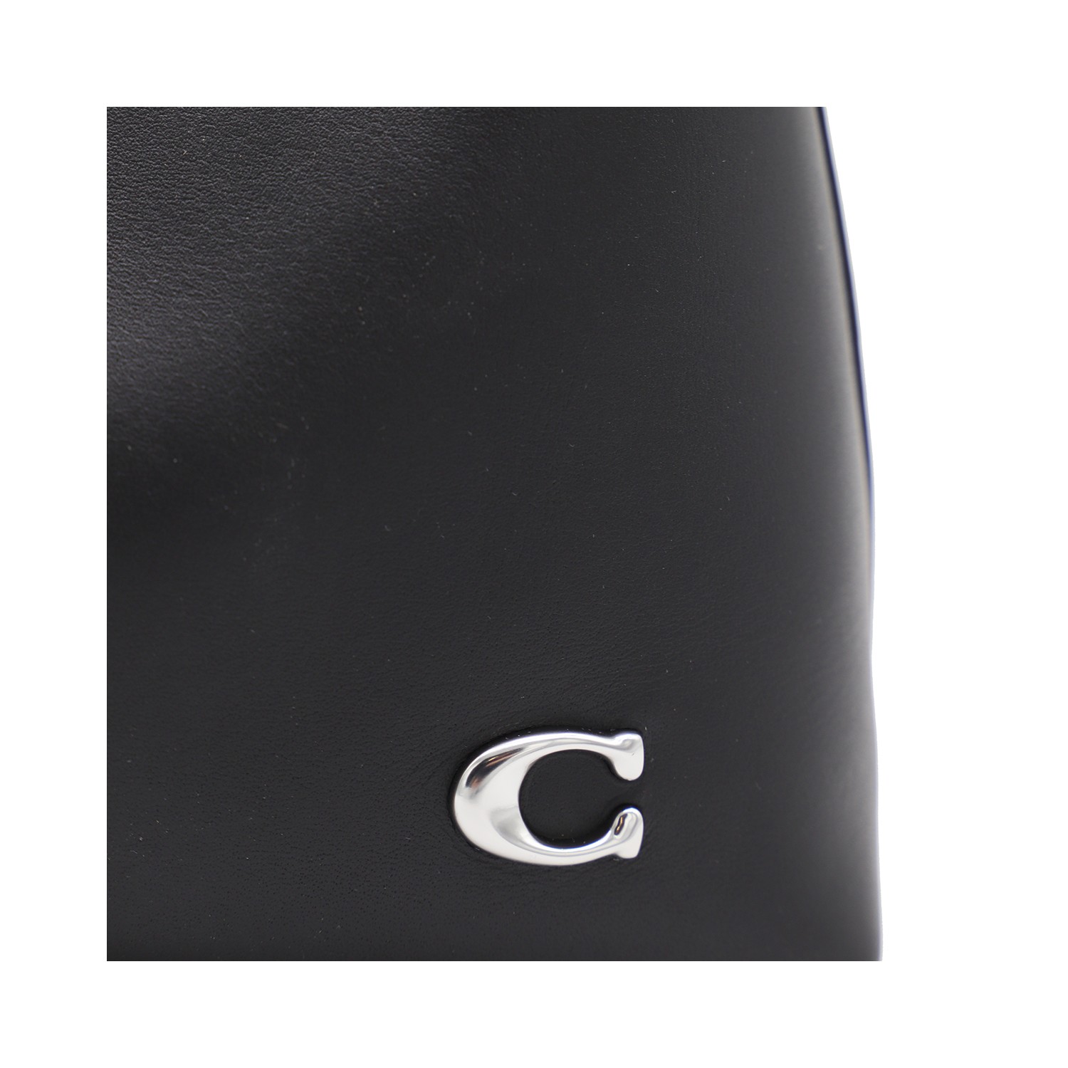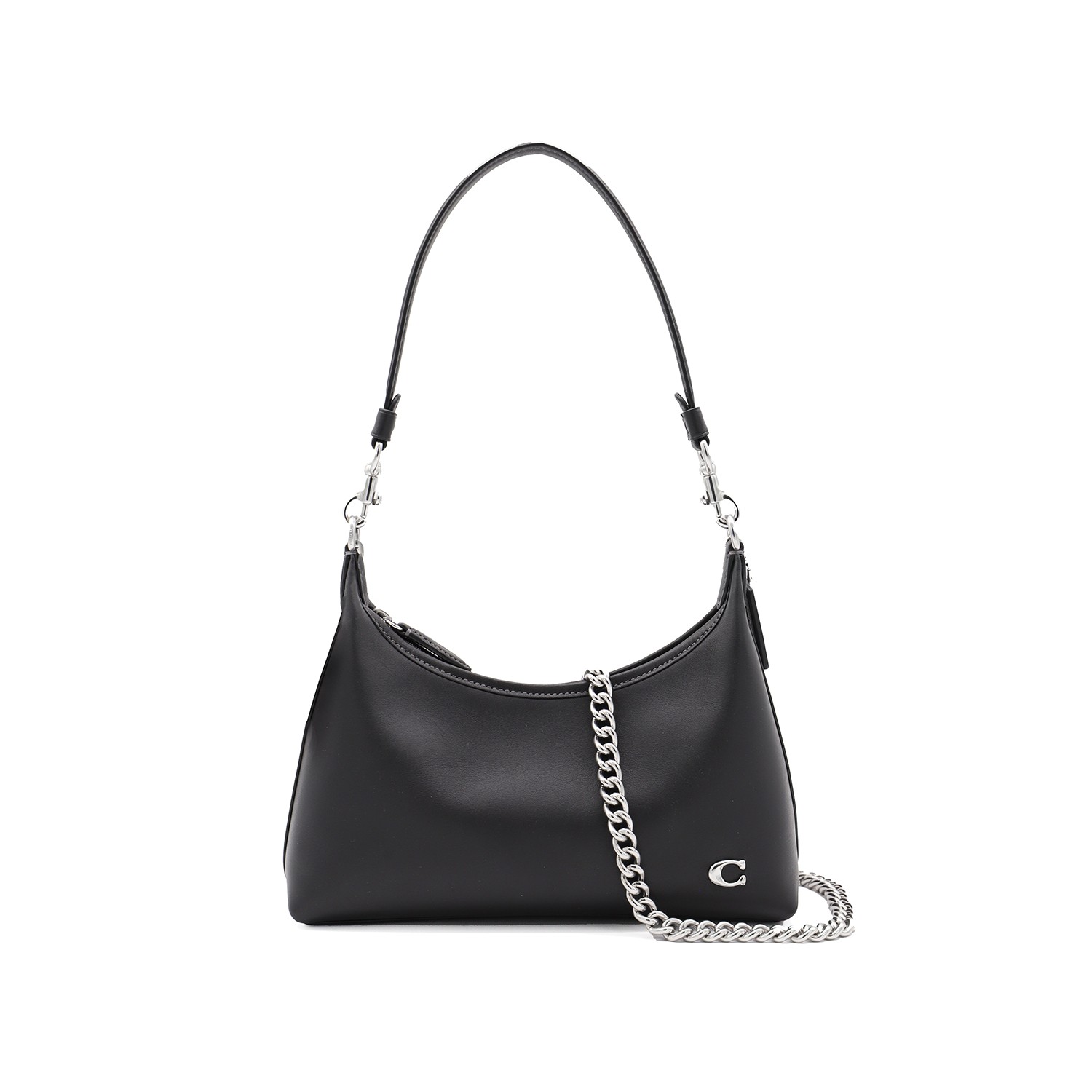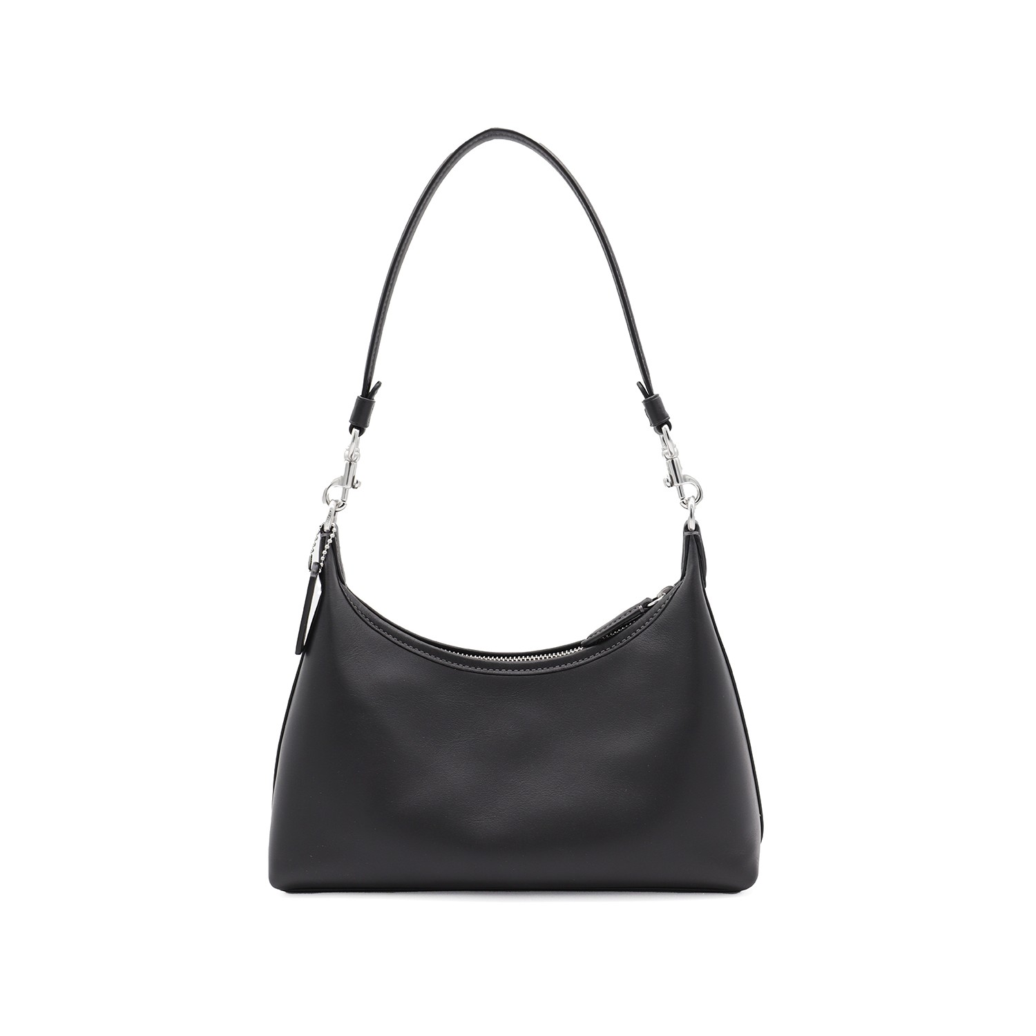 Black leather Juliet shoulder bag from Coach featuring top handle, chain, gold tone hardware, logo, inside pocket and details.