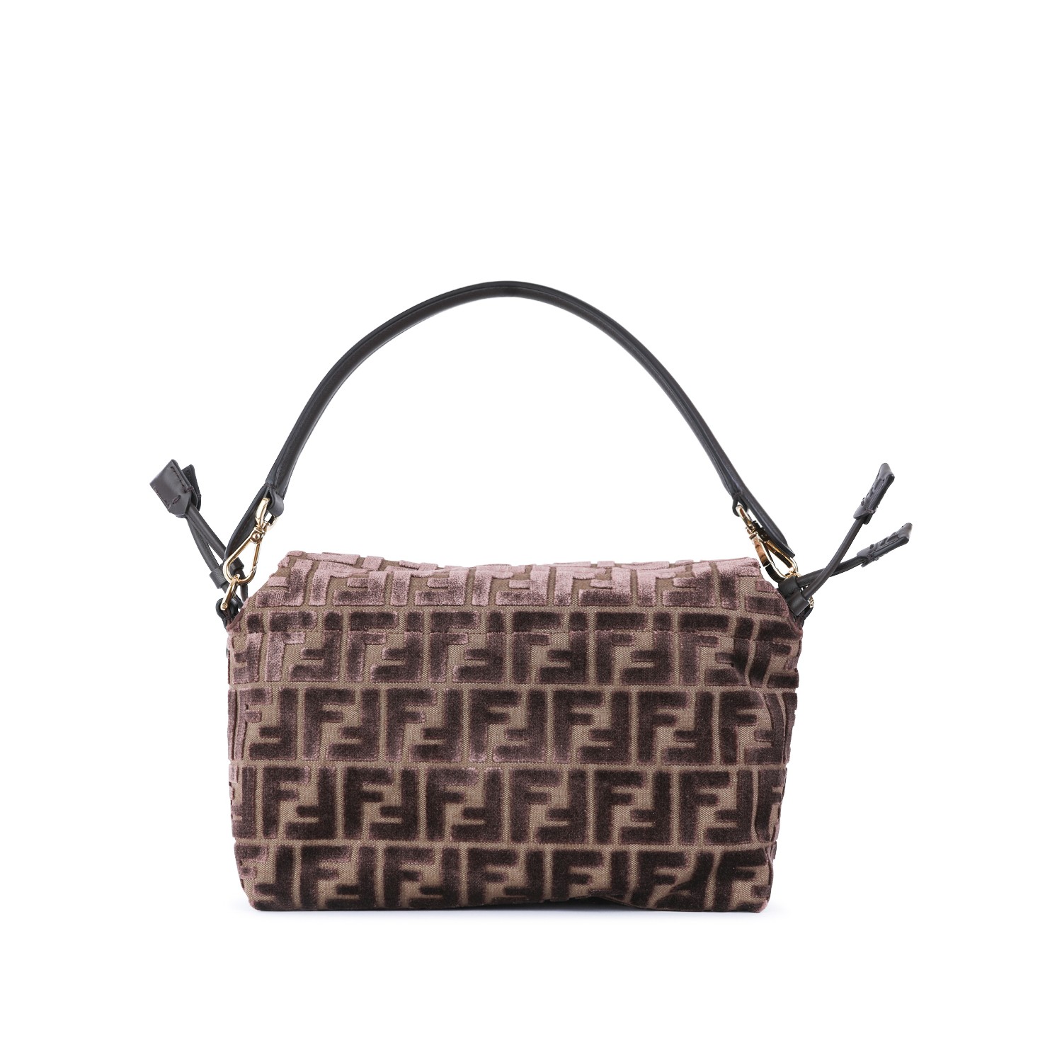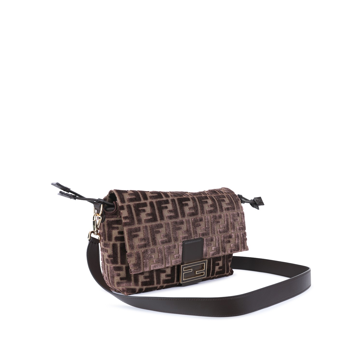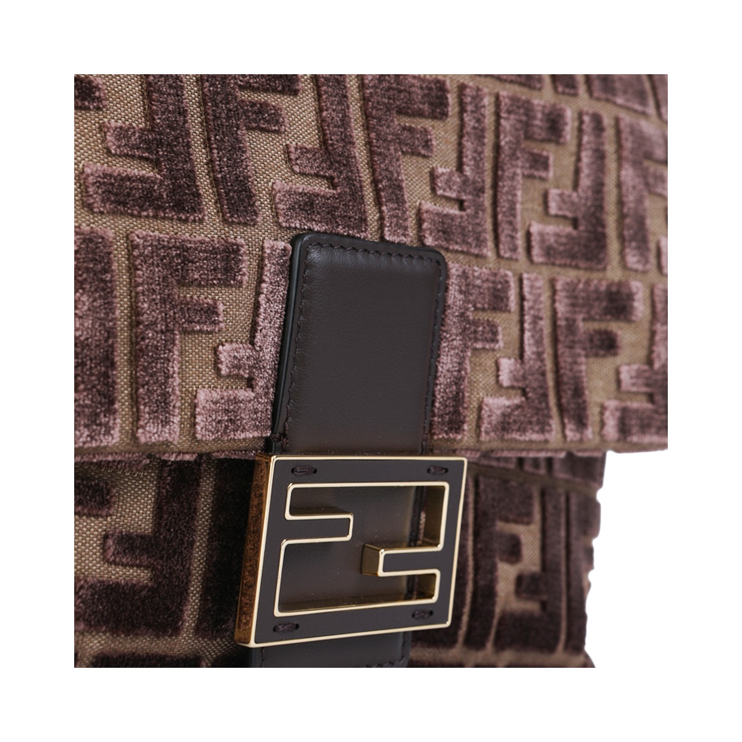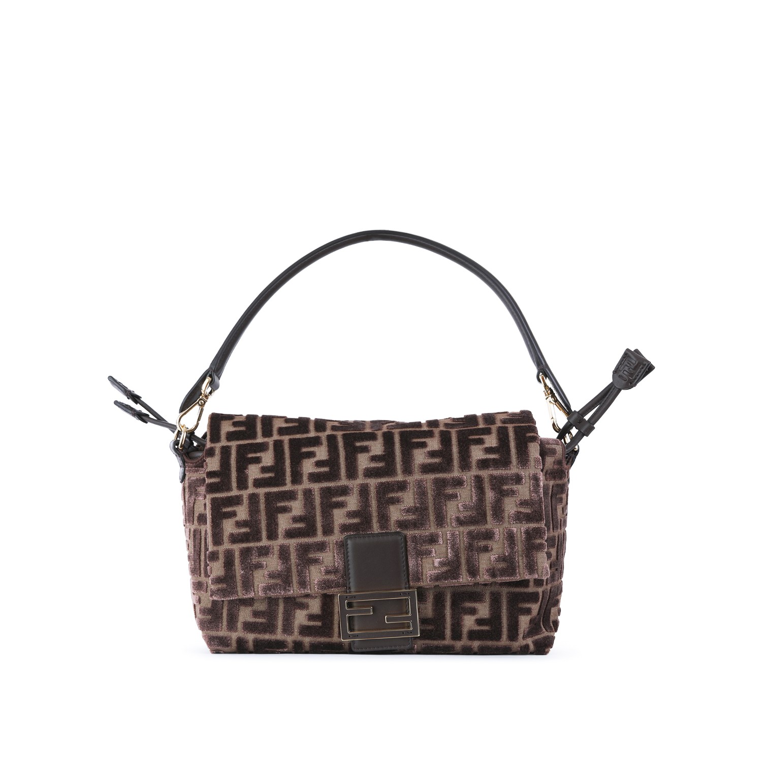 Brown leather Mamma Baguette shoulder bag from Fendi featuring single removable top handle, all-over FF velvet signature, drawstring closure, shoulder strap and main compartment.