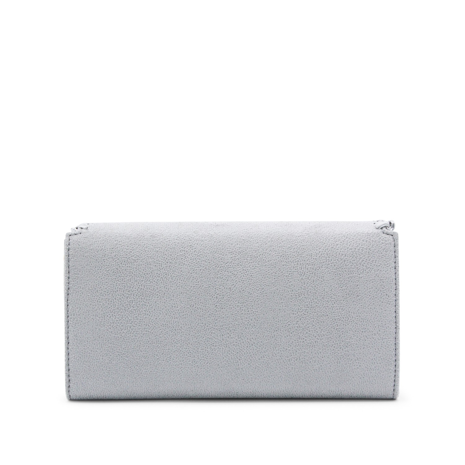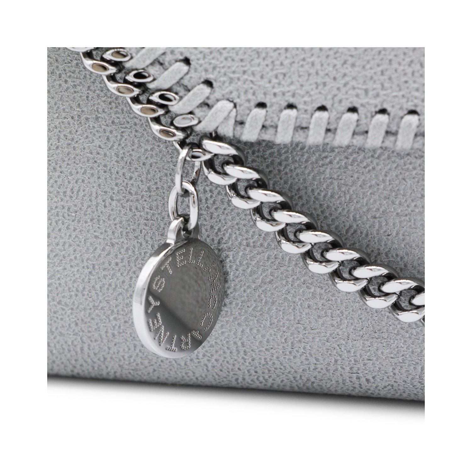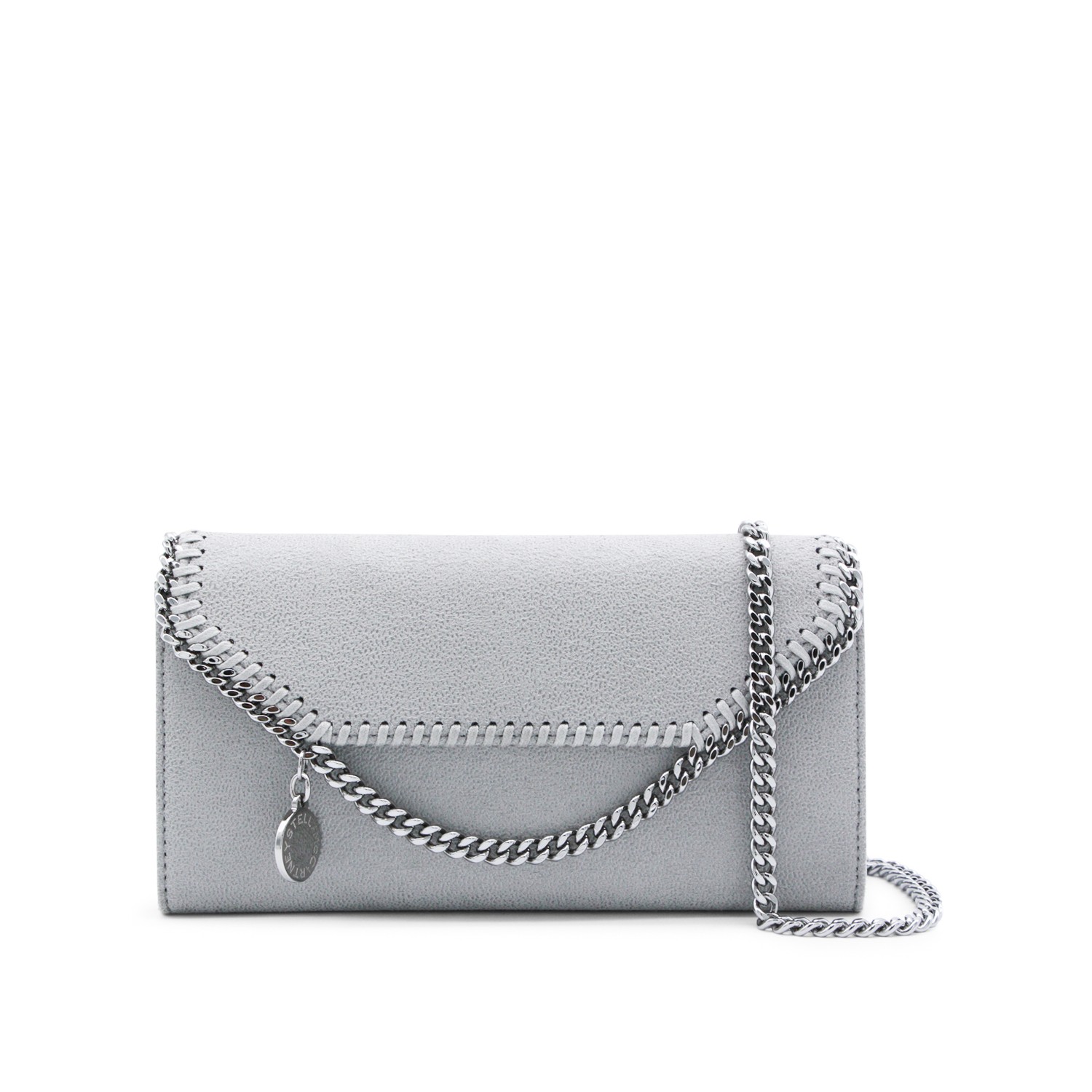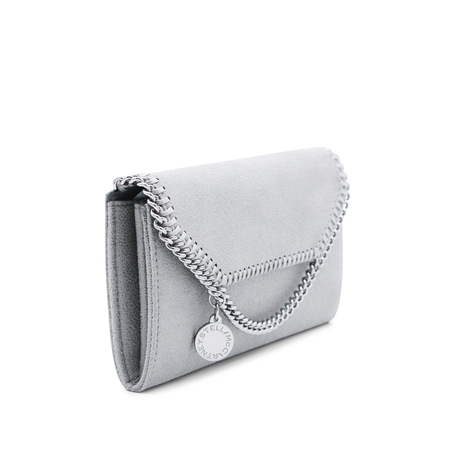 Light grey faux leather Continental wallet crossbody bag from Stella McCartney featuring sivler tone metal finishes, snap button closure, logo details, detachable chain shoulder strap, main compartment and lining.