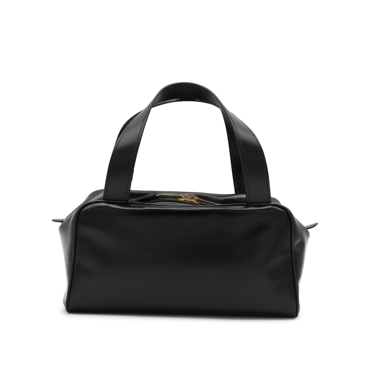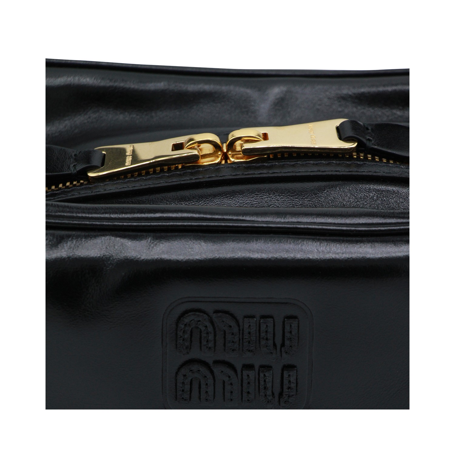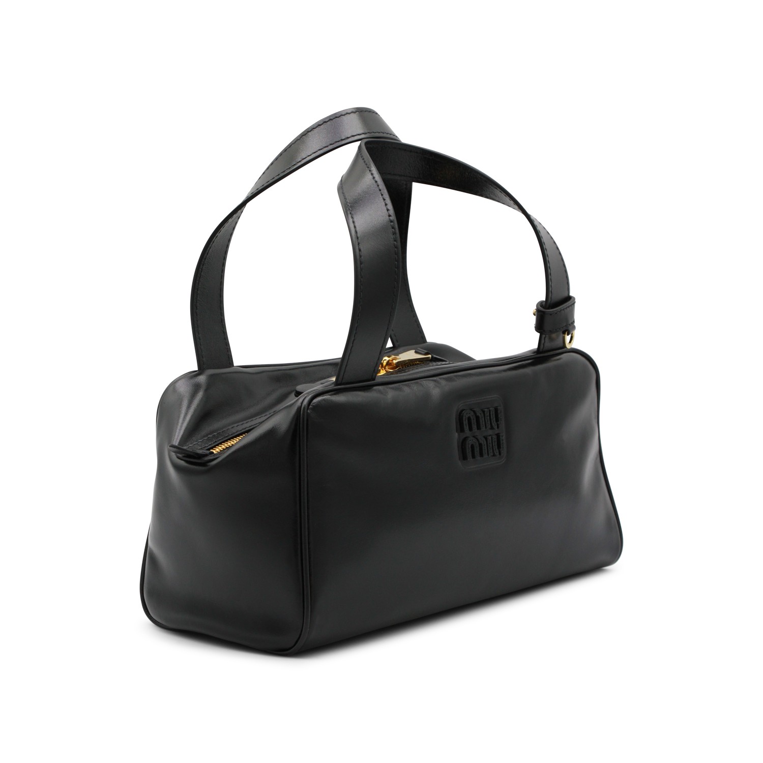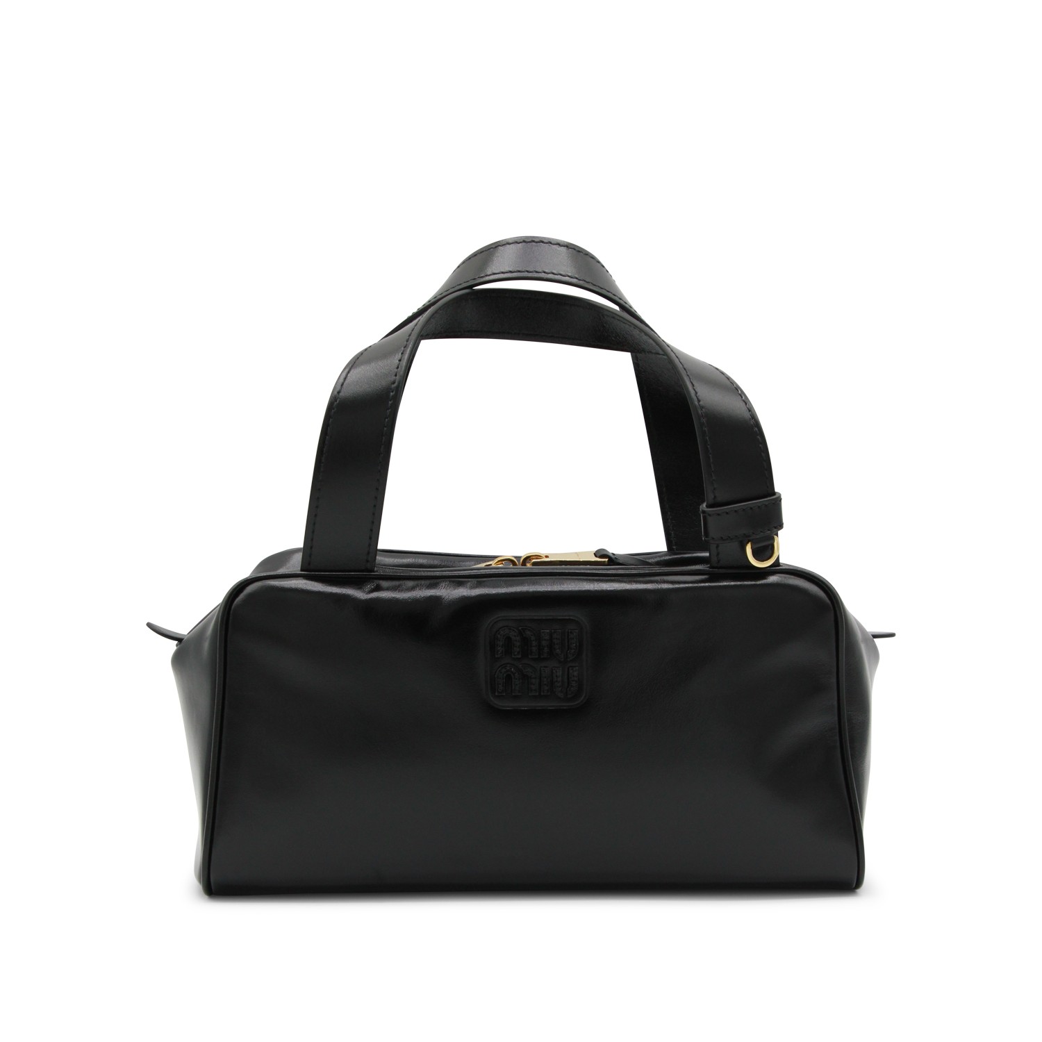 Black leather top handle bag from Miu Miu featuring top handles, zip fastening, main compartment, internal zip pocket and frontal logo detail.