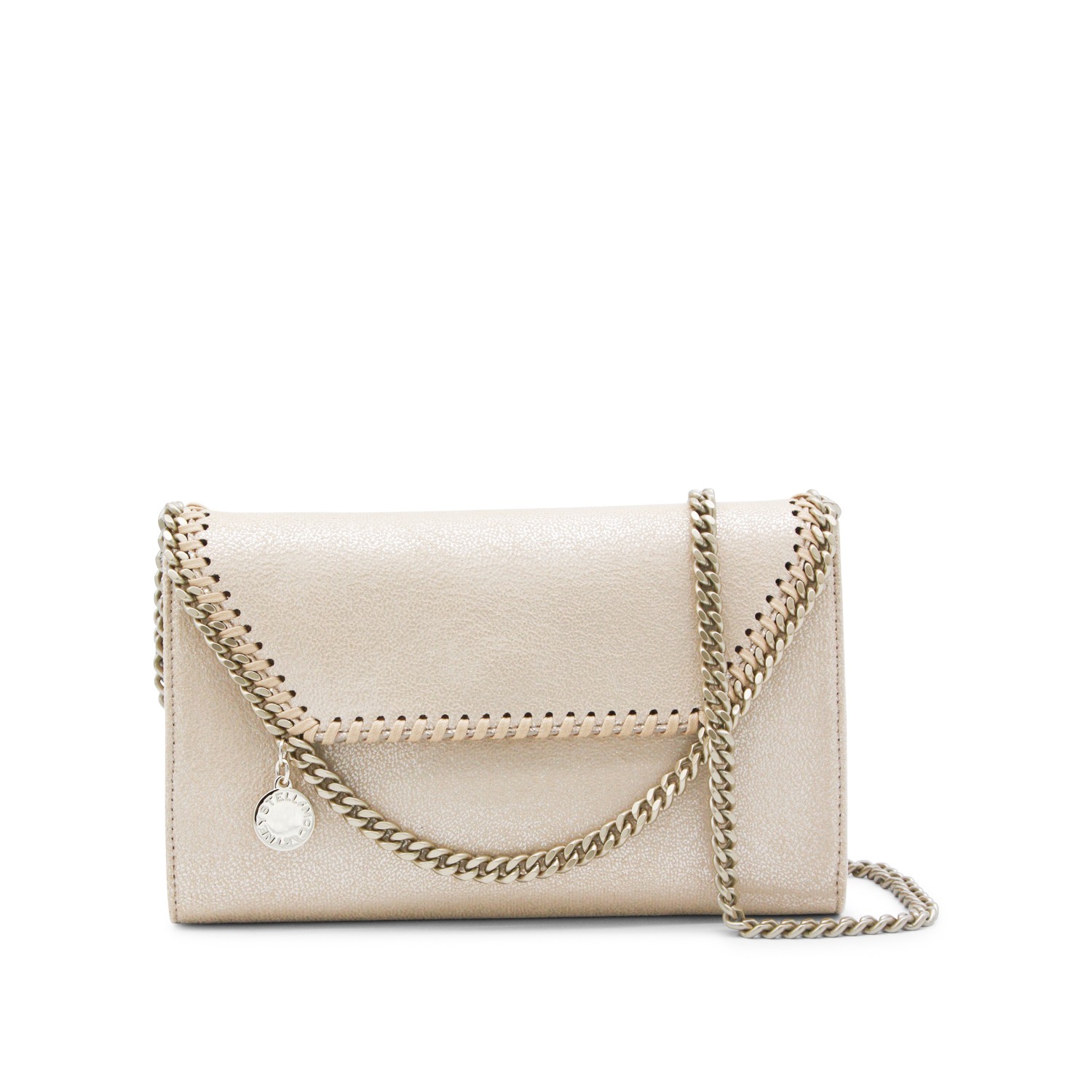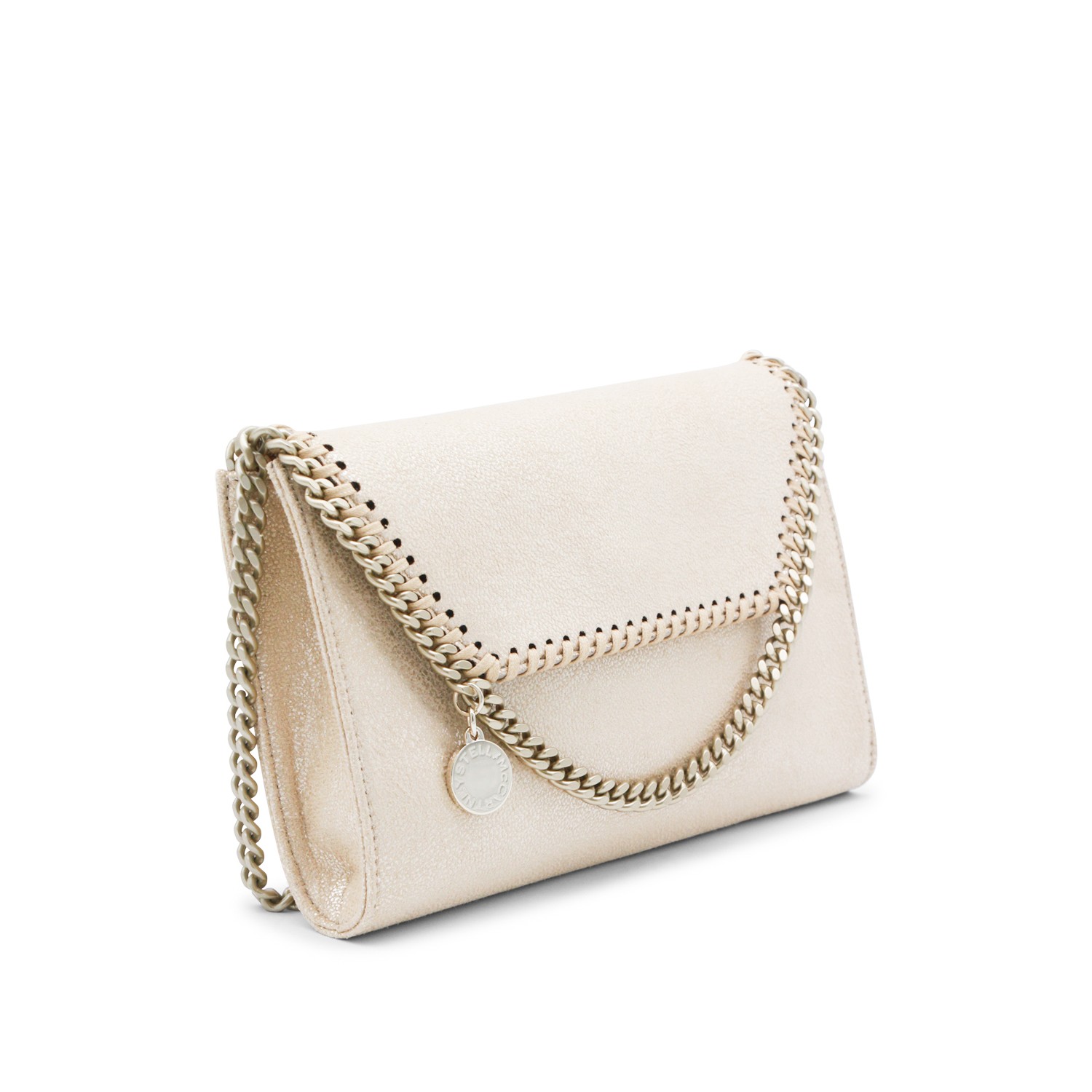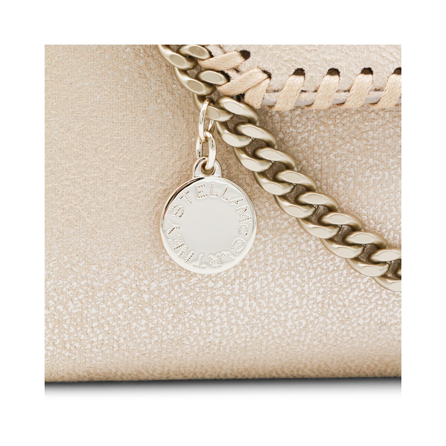 Gold faux leather Falabella Mini crossbody shoulder bag from Stella McCartney featuring gold tone metal finishes, snap button closure, logo details, detachable chain shoulder strap, main compartment and lining.