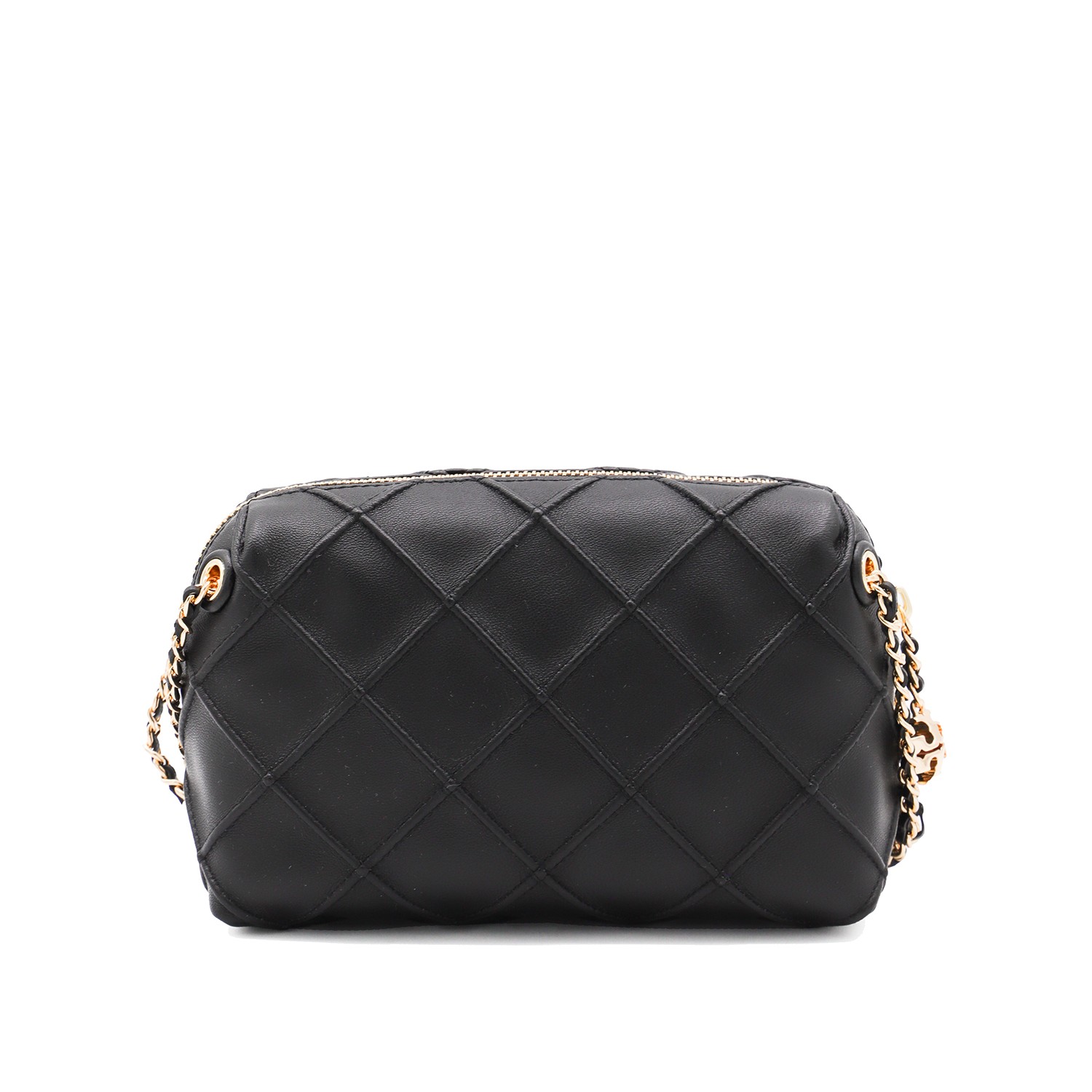 Black leather Fleming crossbody bag from Tory Burch featuring removable shoulder strap, quilty pattern, logo charms, main compartment and internal card slot.