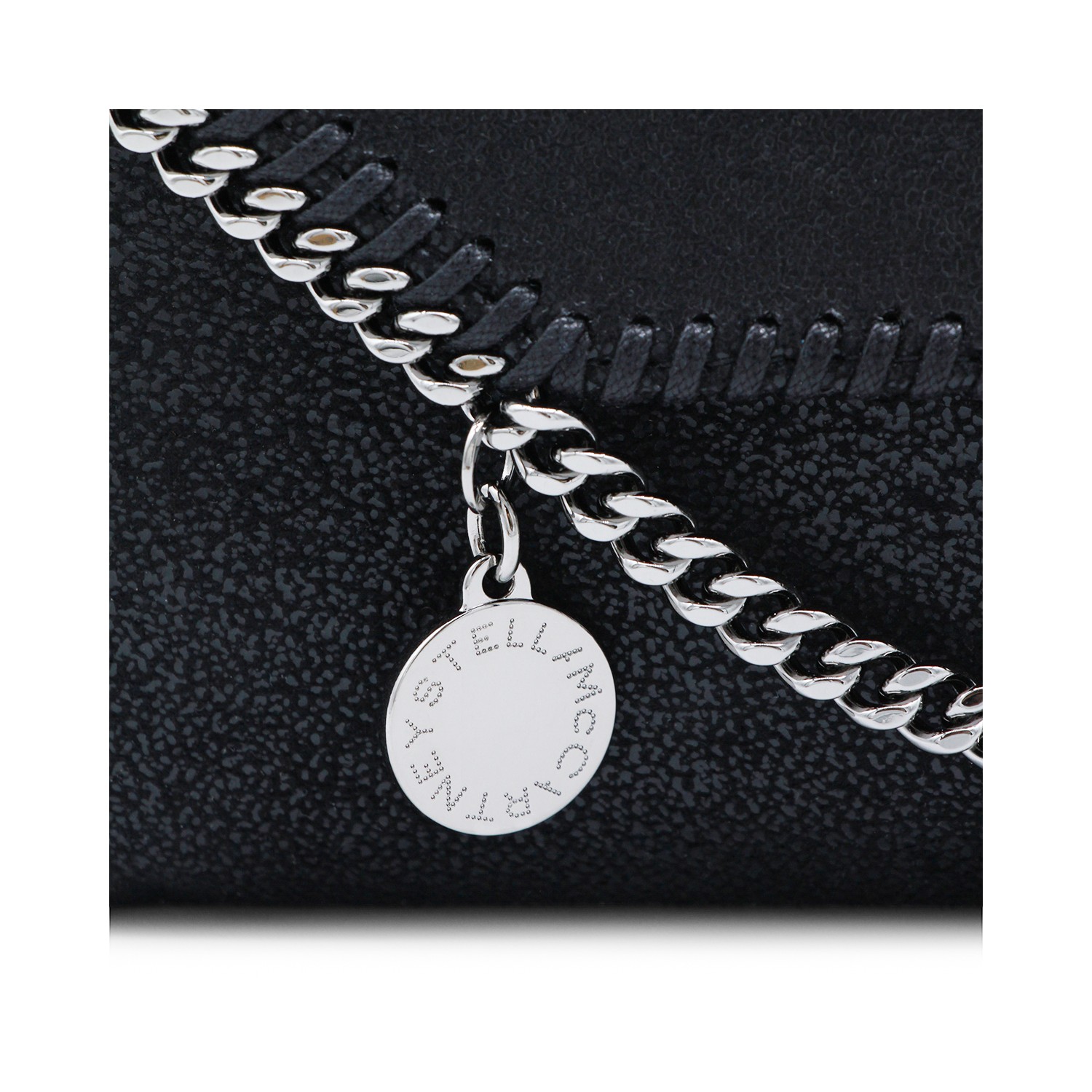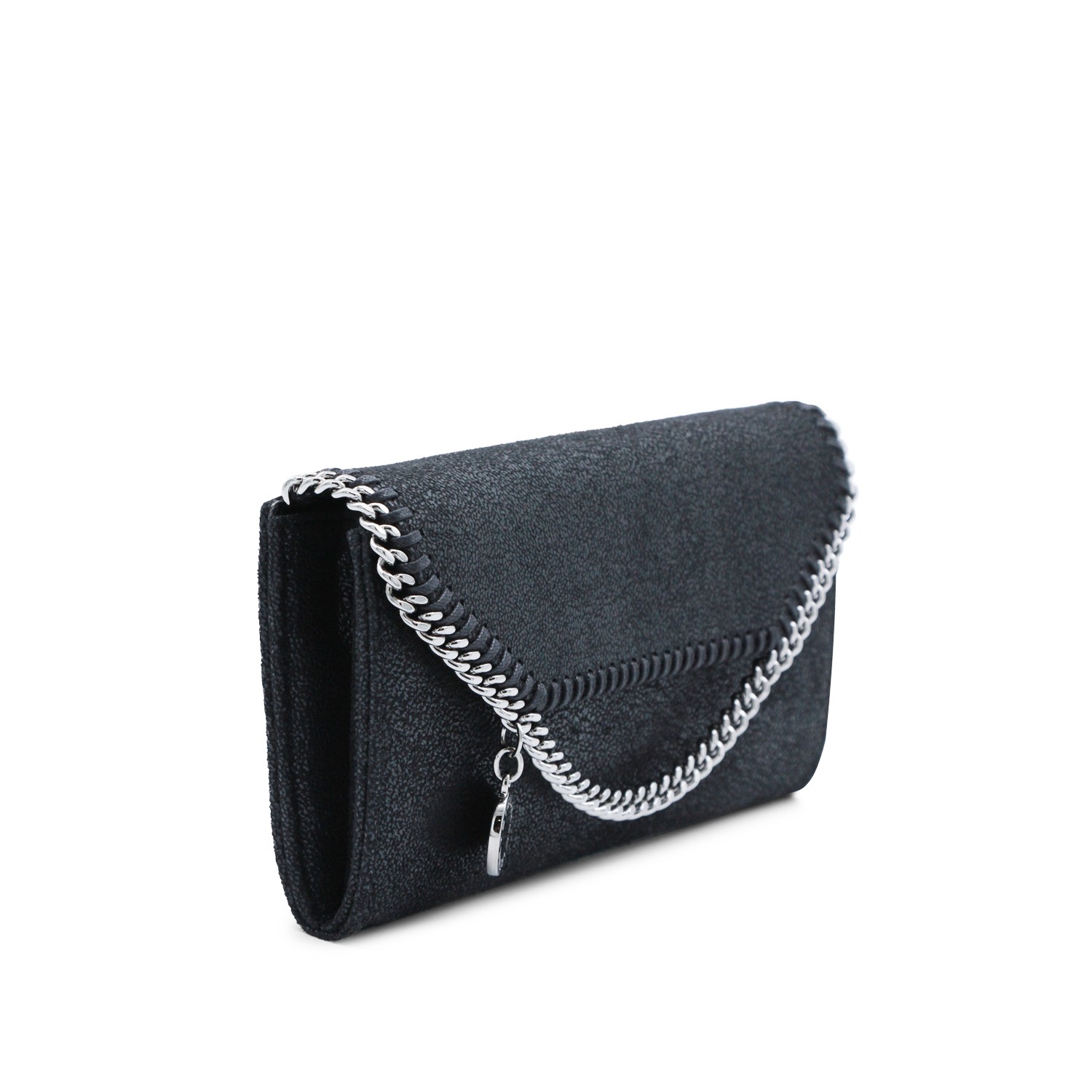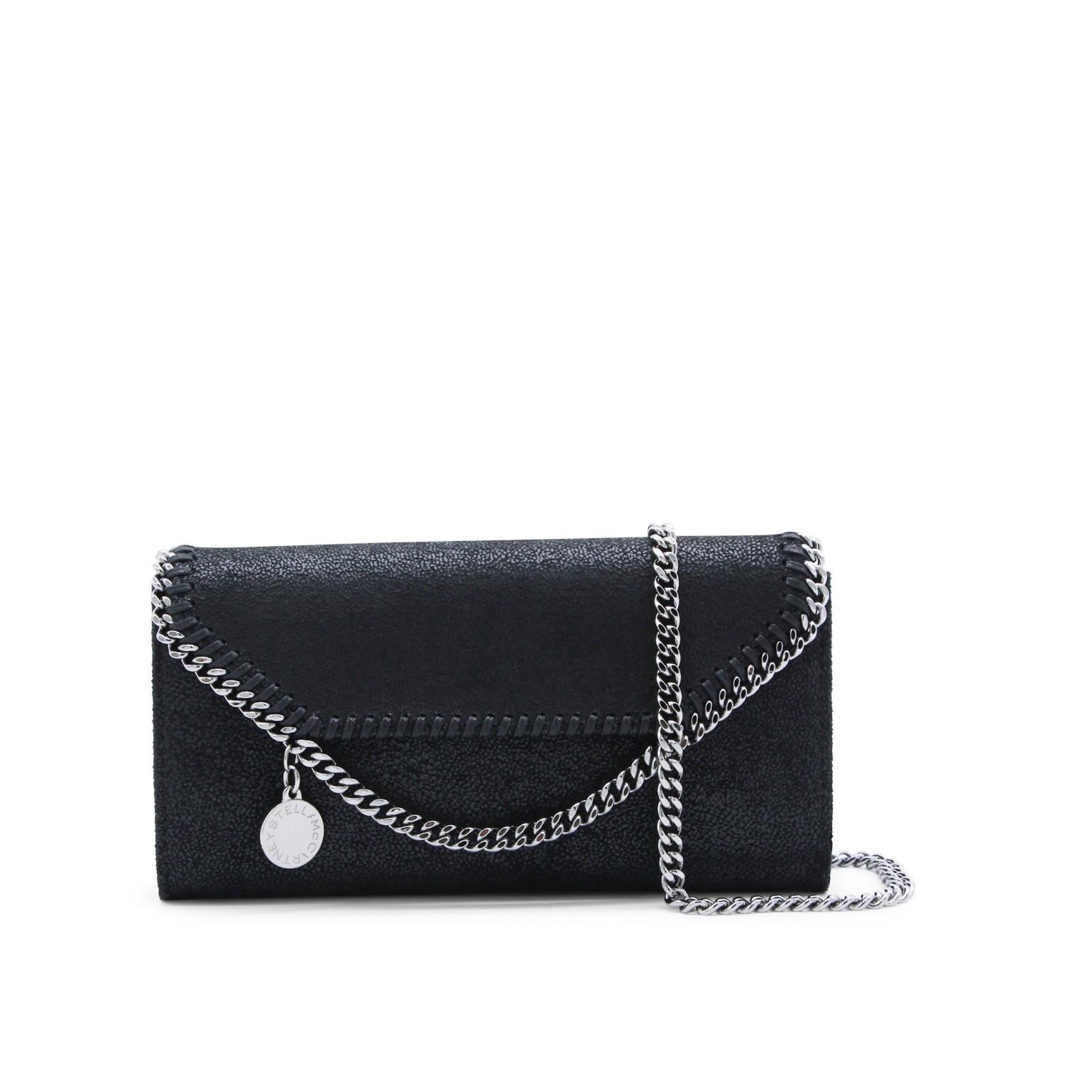 Black faux leather Continental wallet crossbody bag from Stella McCartney featuring sivler tone metal finishes, snap button closure, logo details, detachable chain shoulder strap, main compartment and lining.