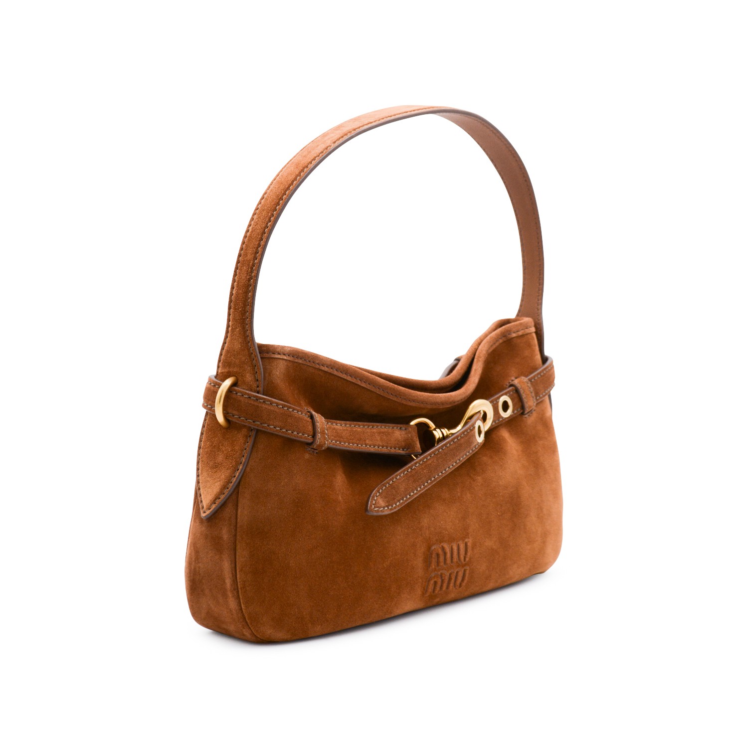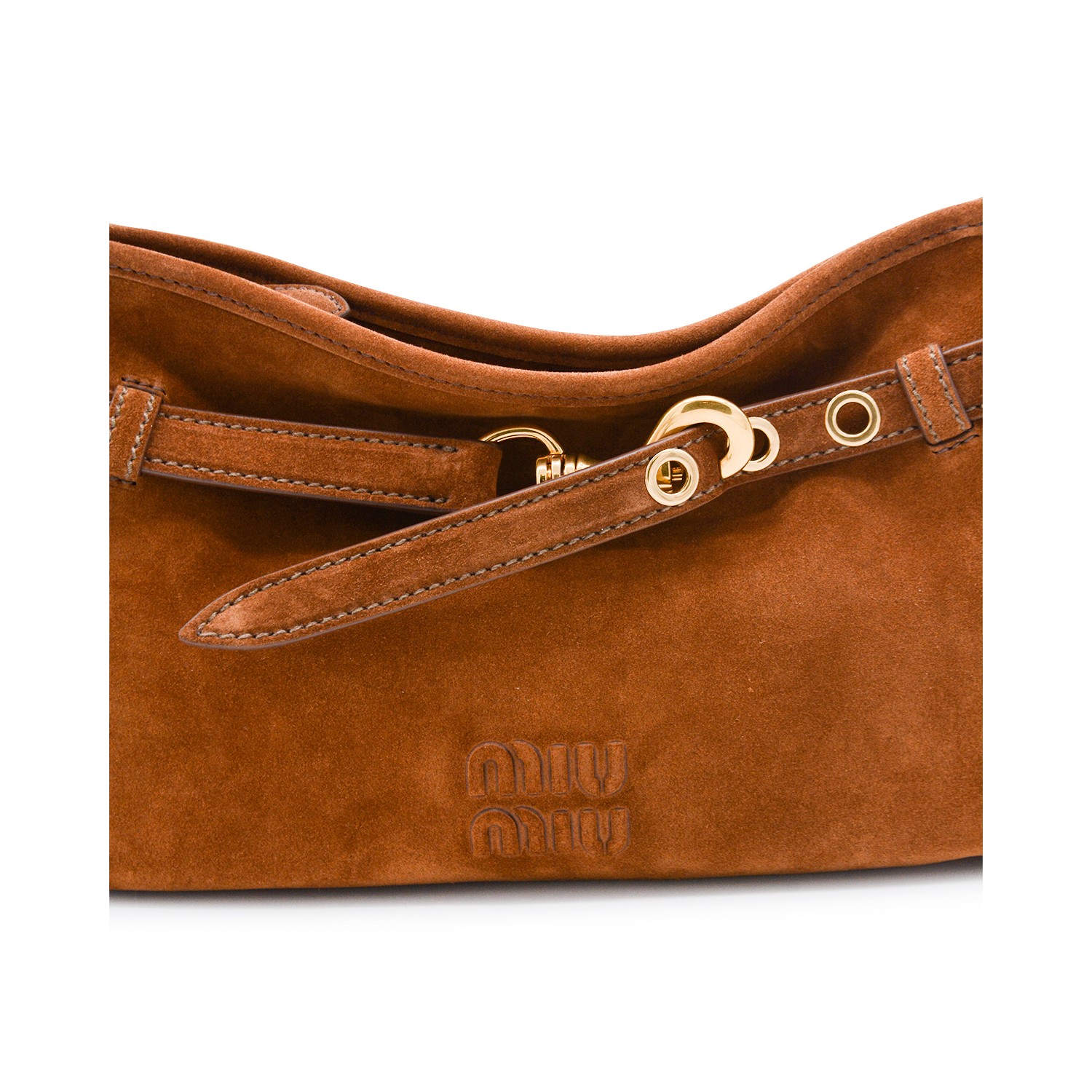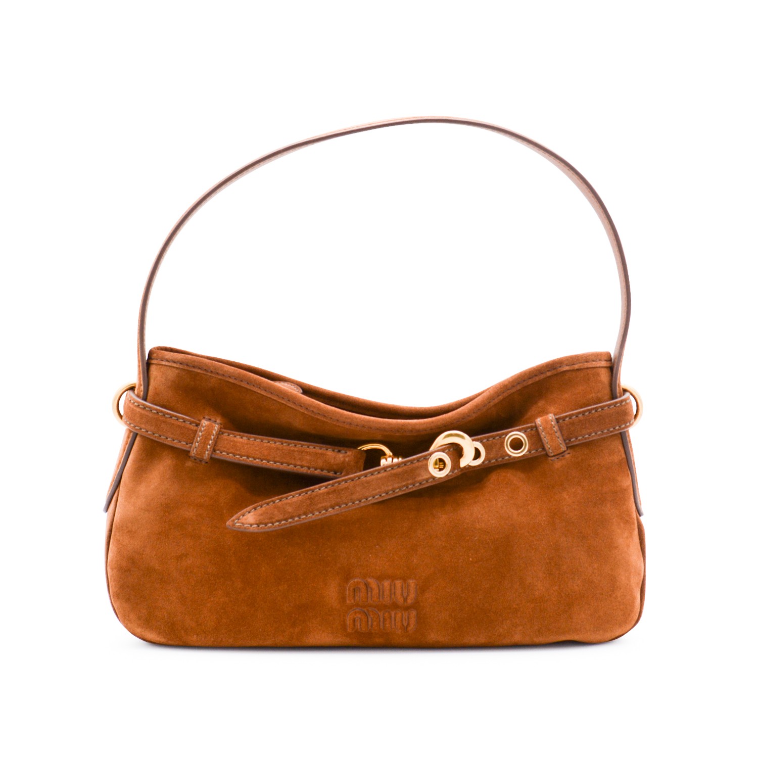 Rovere leather shoulder bag from Miu Miu featuring top handle, zip fastening, main compartment, internal zip pocket, belt featuring and frontal logo detail.