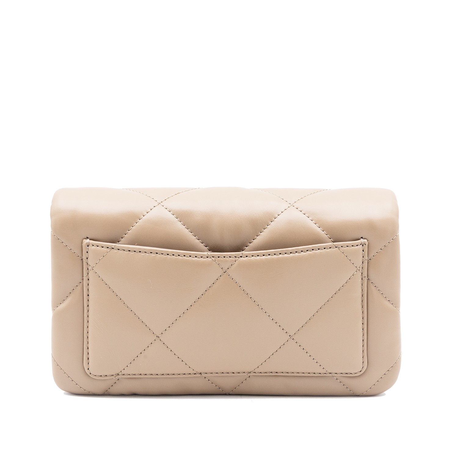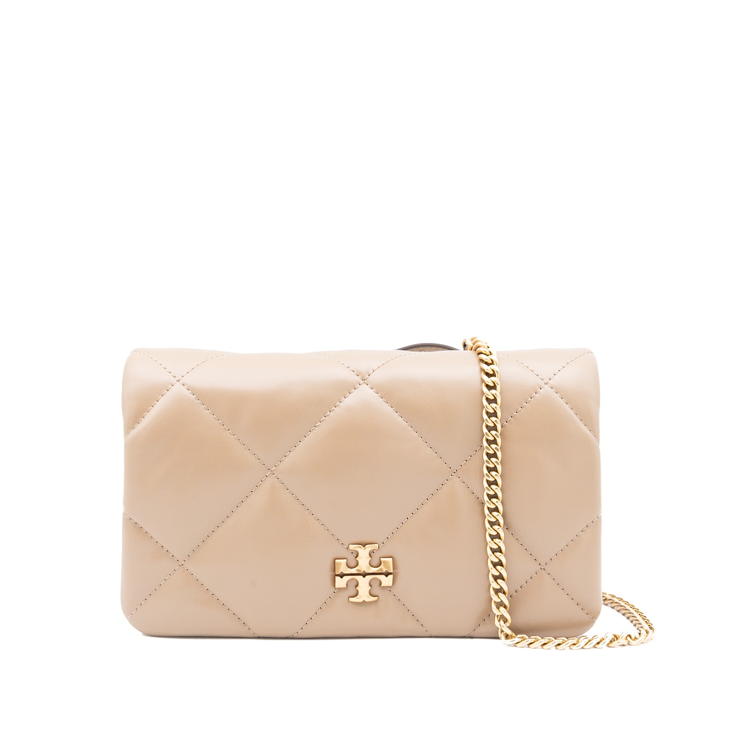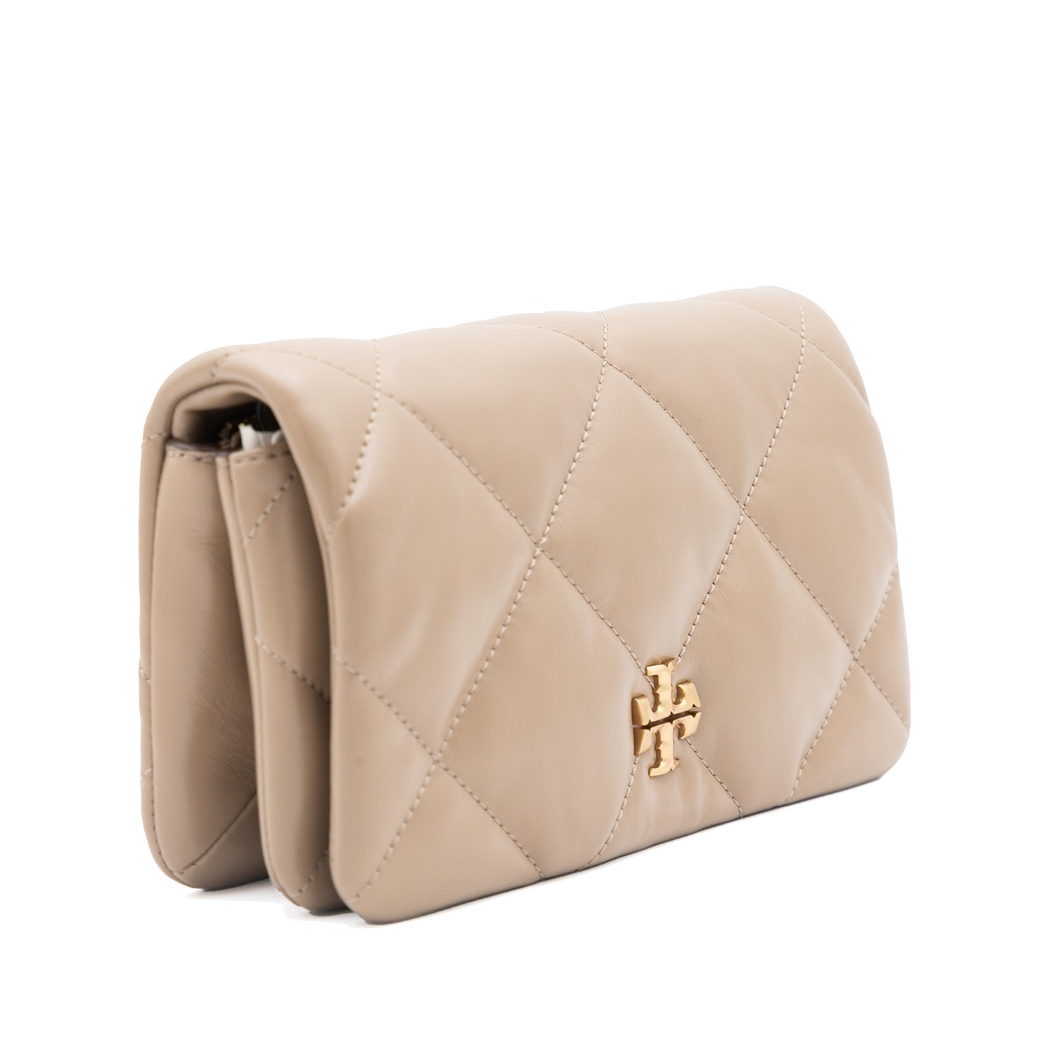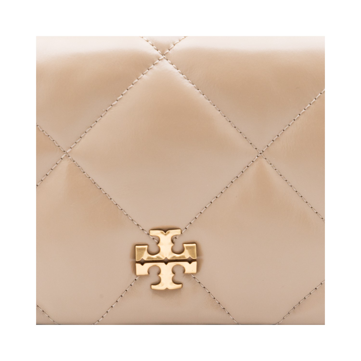 Light stone leather shoulder bag from Tory Burch featuring gold tone metal hardware, chevron texture, logo details, magnetic closure, gold tone metal chain shoulder strap and main compartment.