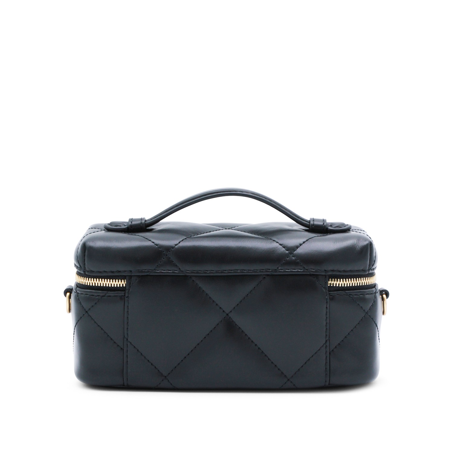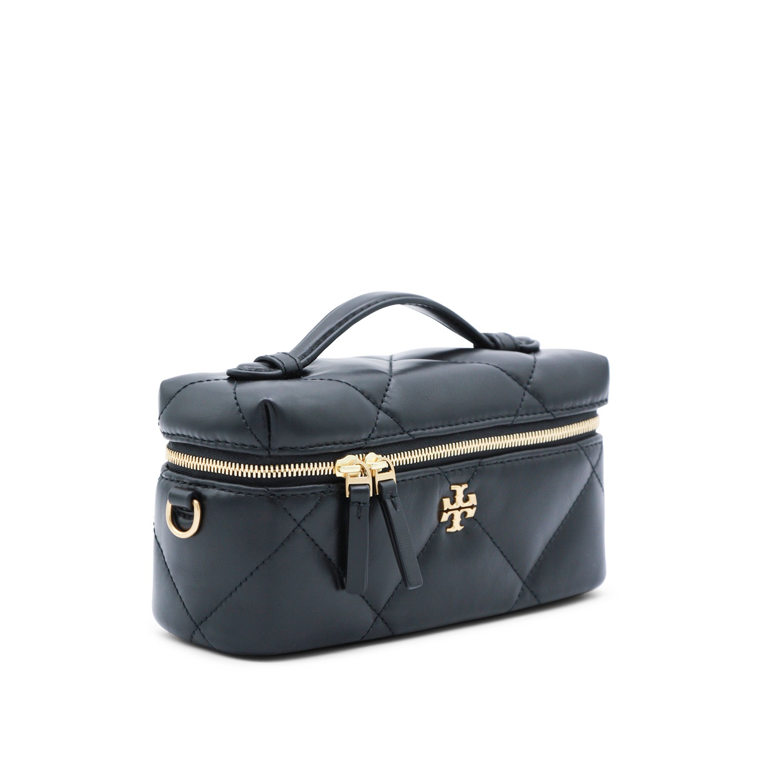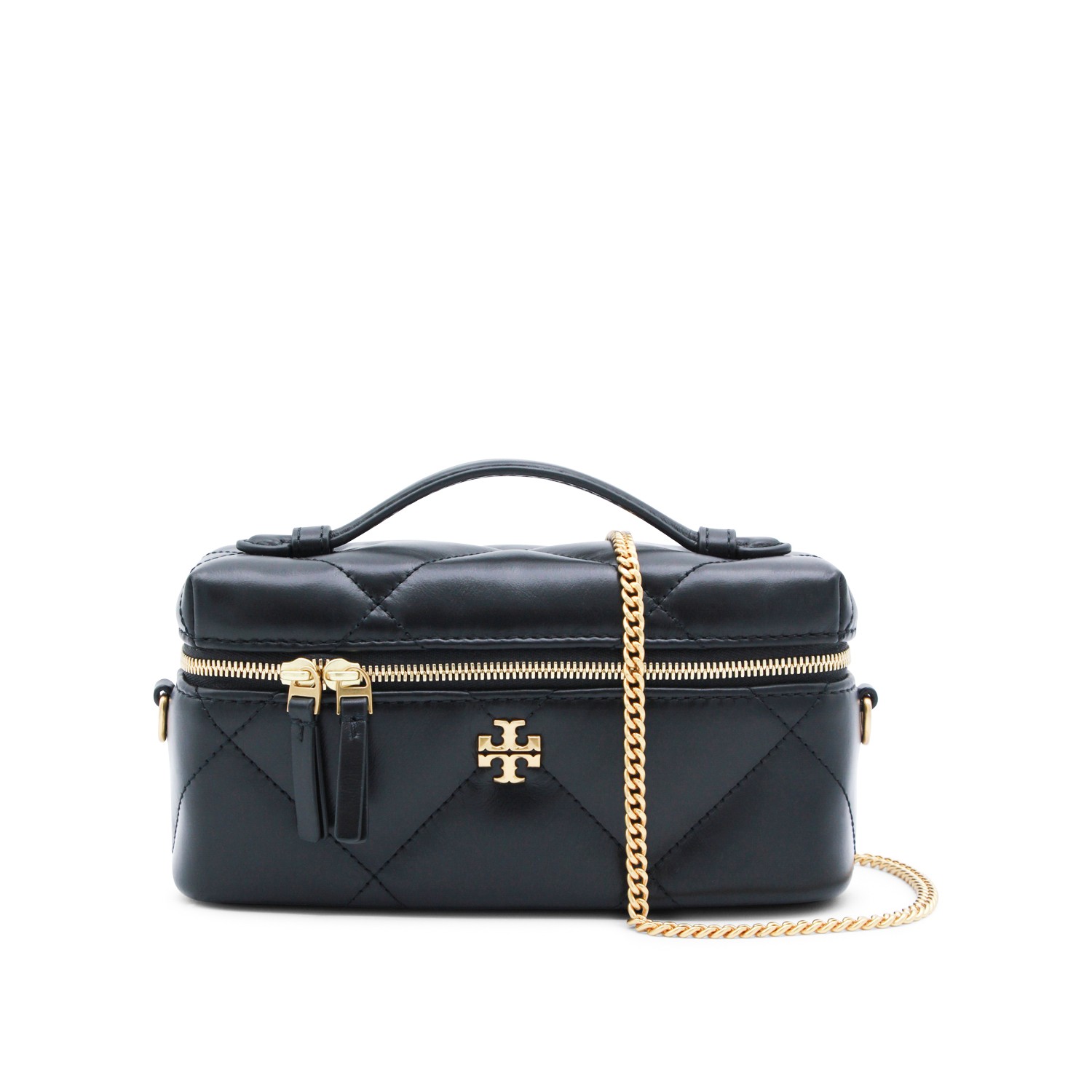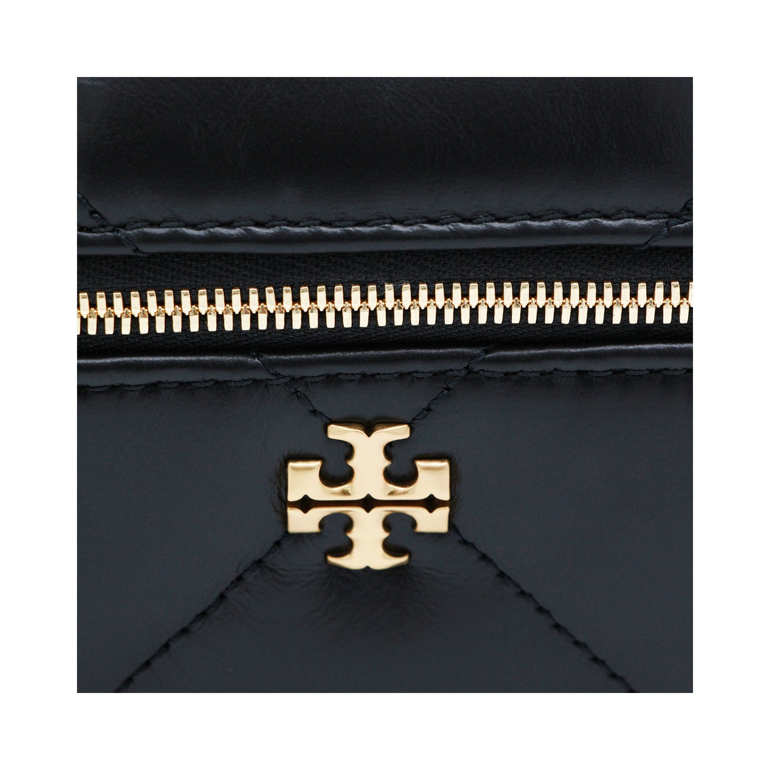 Black leather crossbody bag from Tory Burch featuring zip fastening, top handle, frontal logo, removable strap and gold tone hardware.
