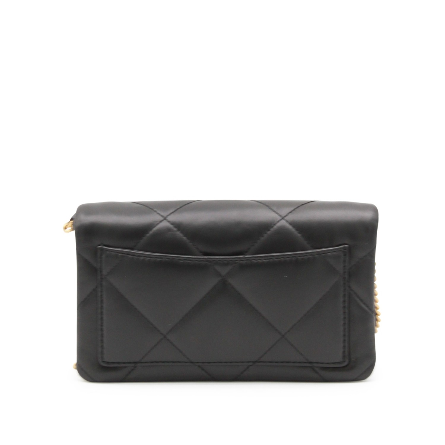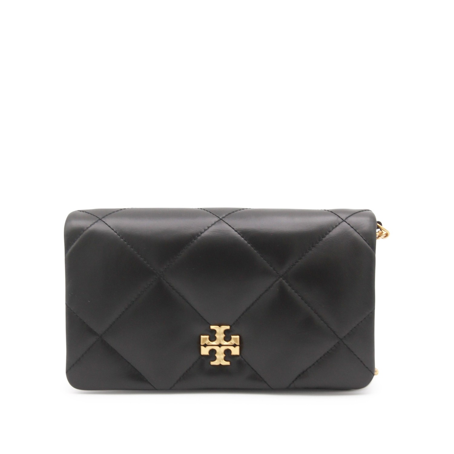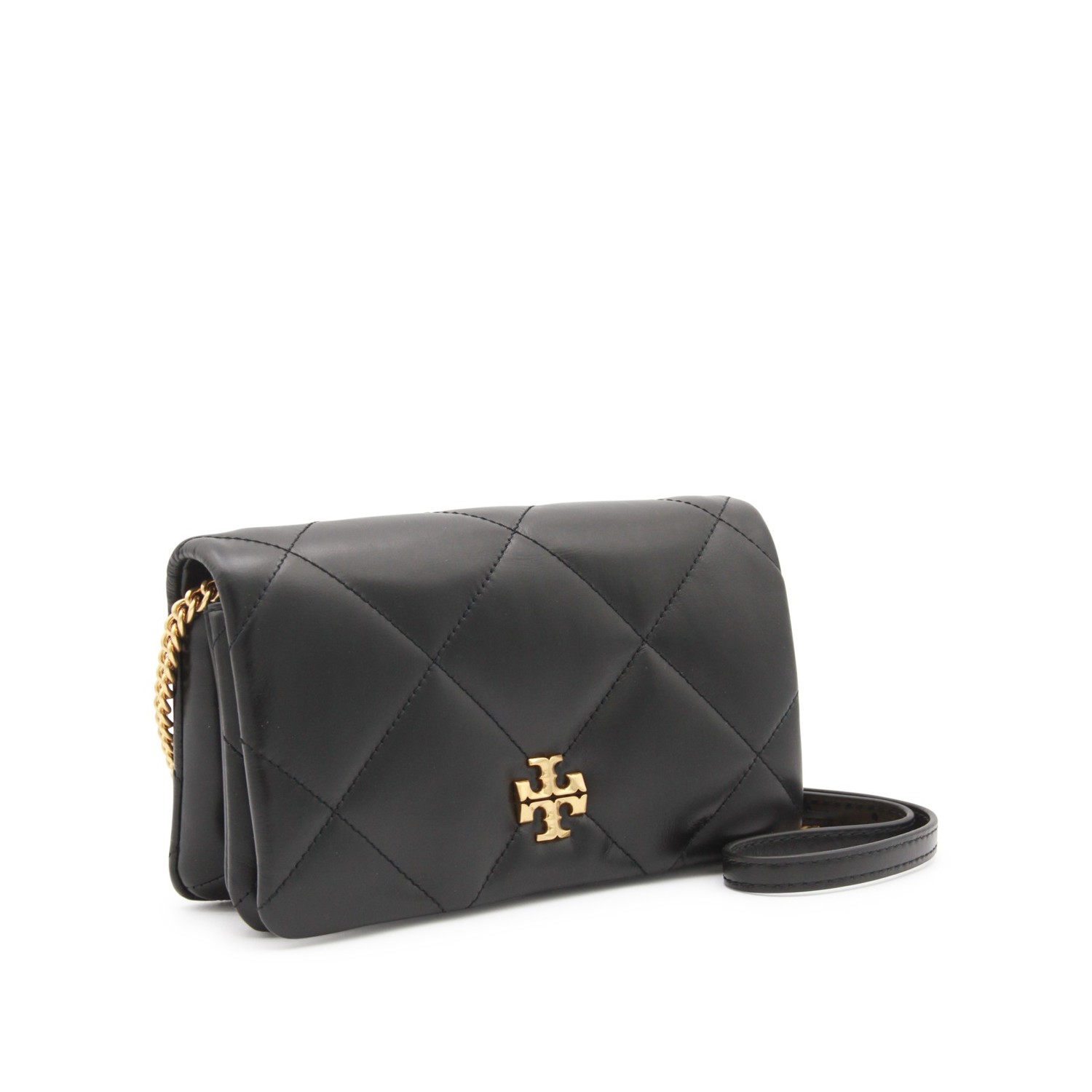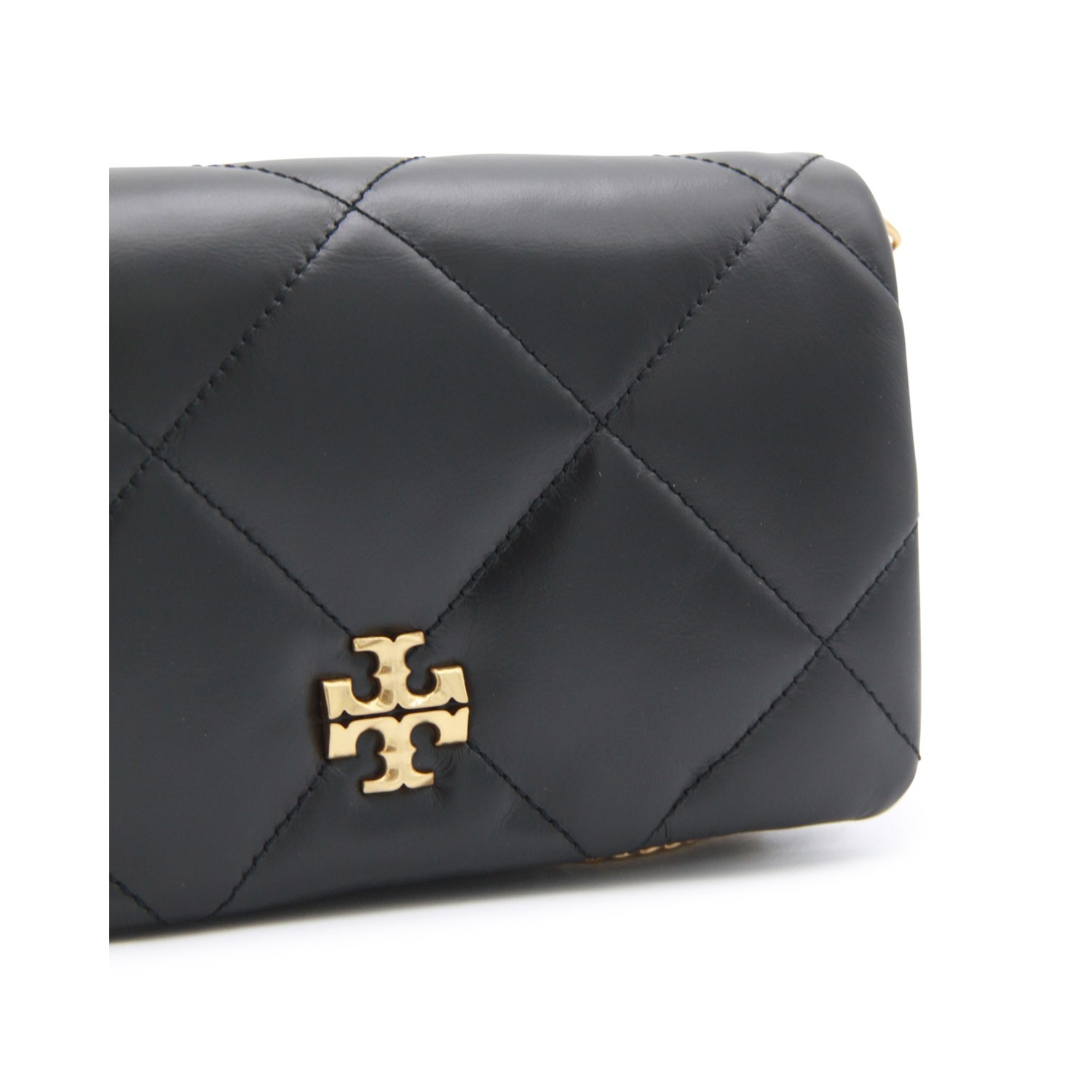 Black leather Kira crossbody bag from Tory Burch featuring gold tone metal hardware, chevron texture, logo details, magnetic closure, gold tone metal chain shoulder strap and main compartment.