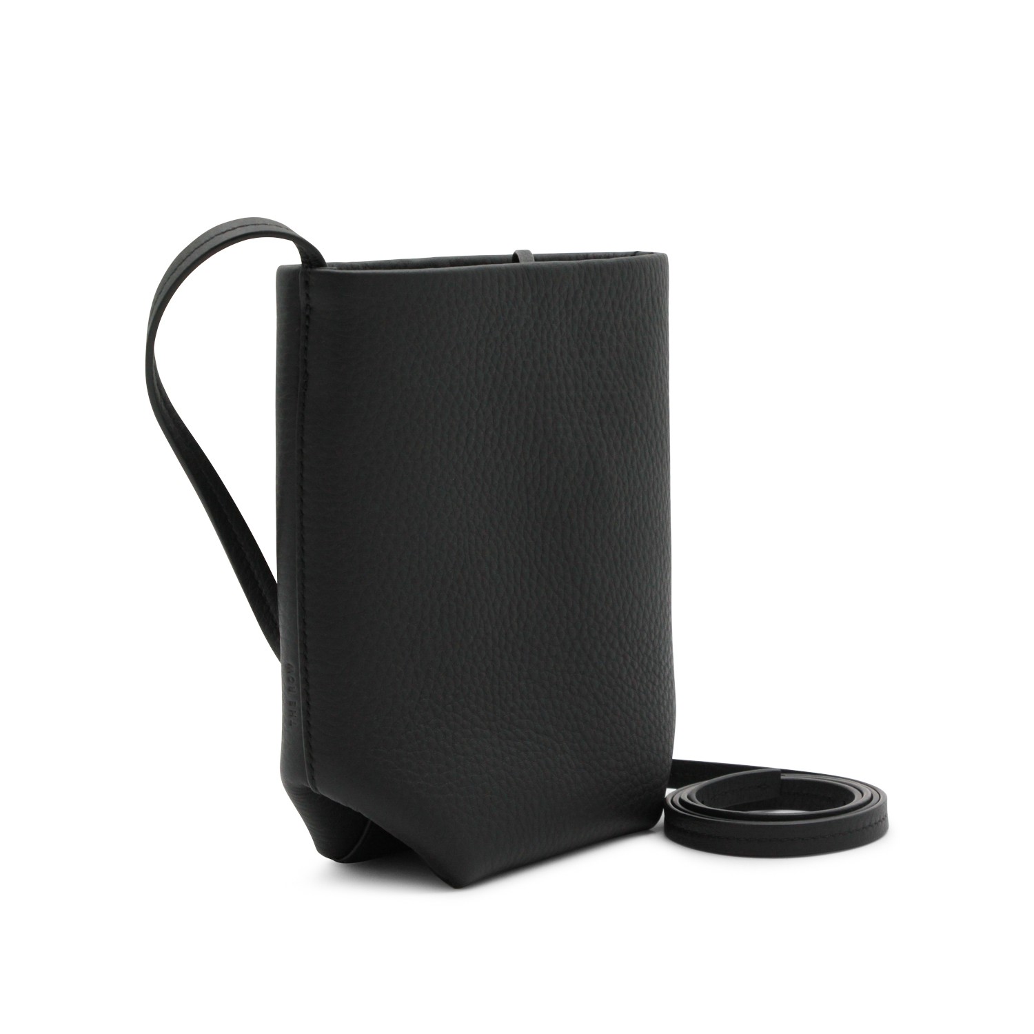Black leather N/S park crossbody bag from The Row featuring single compartment, removale strap and lateral logo.