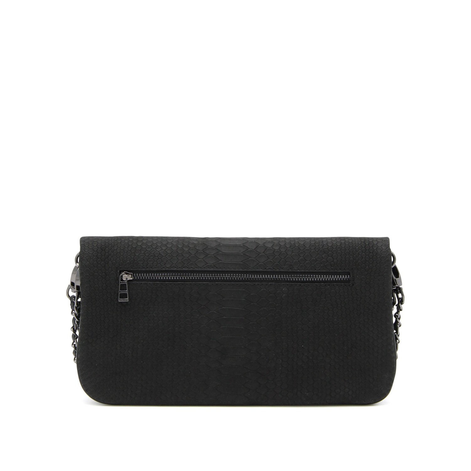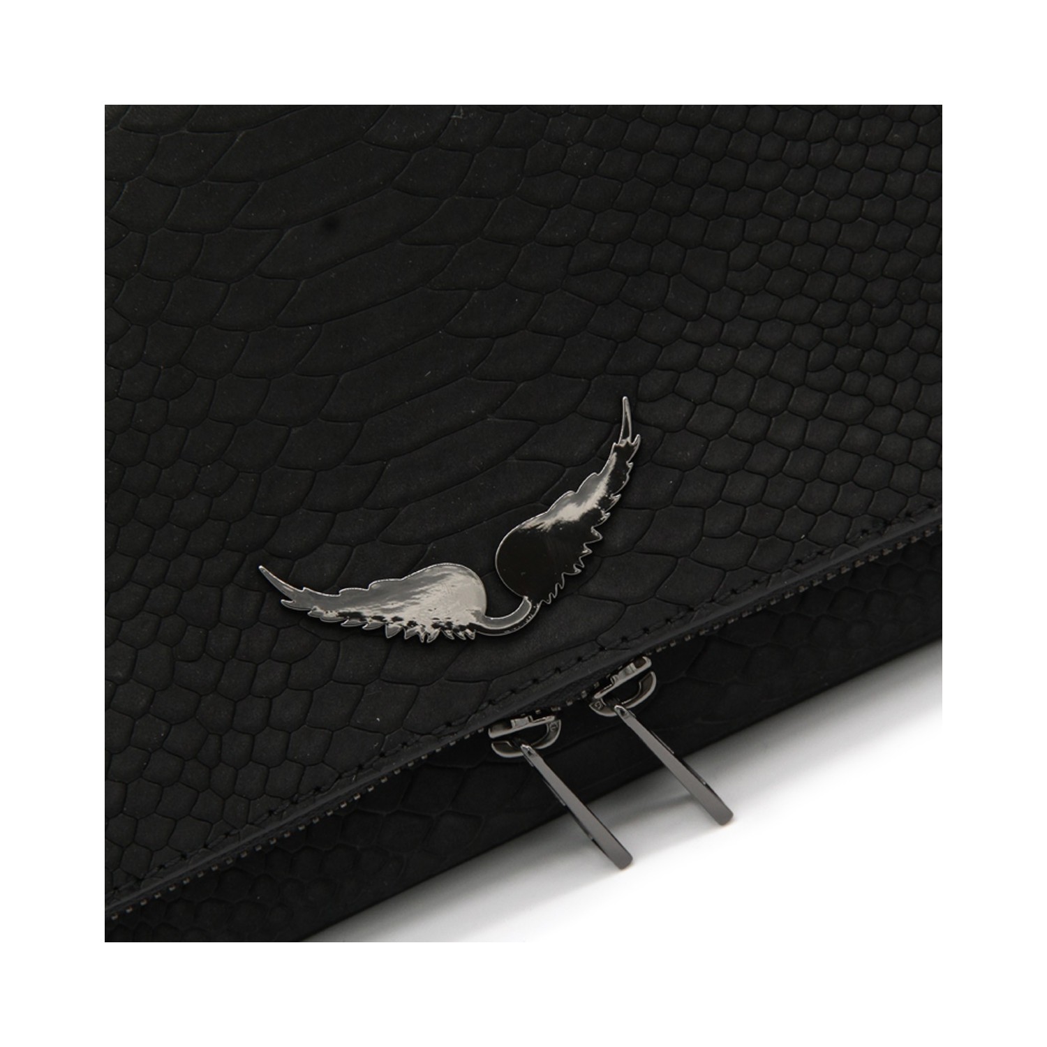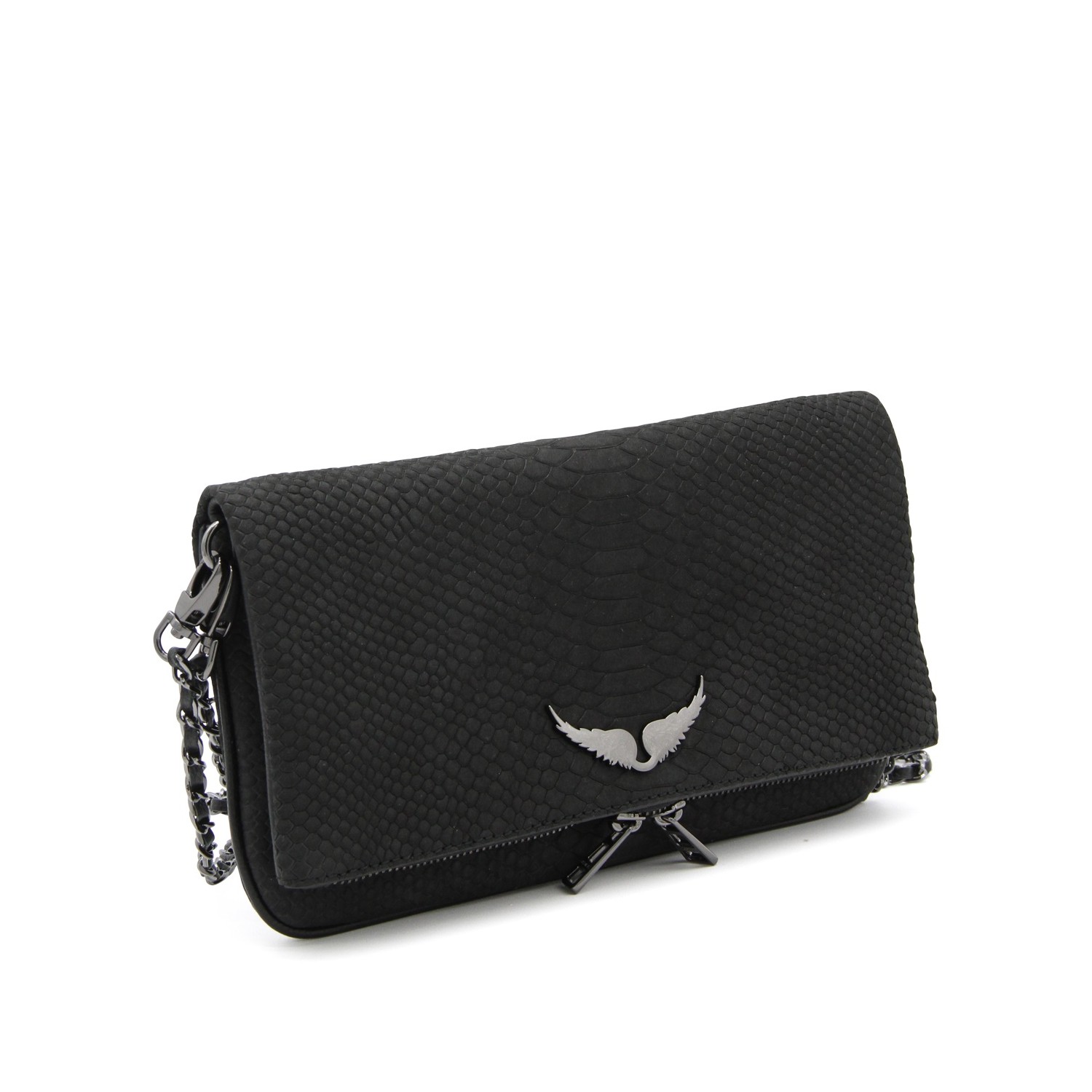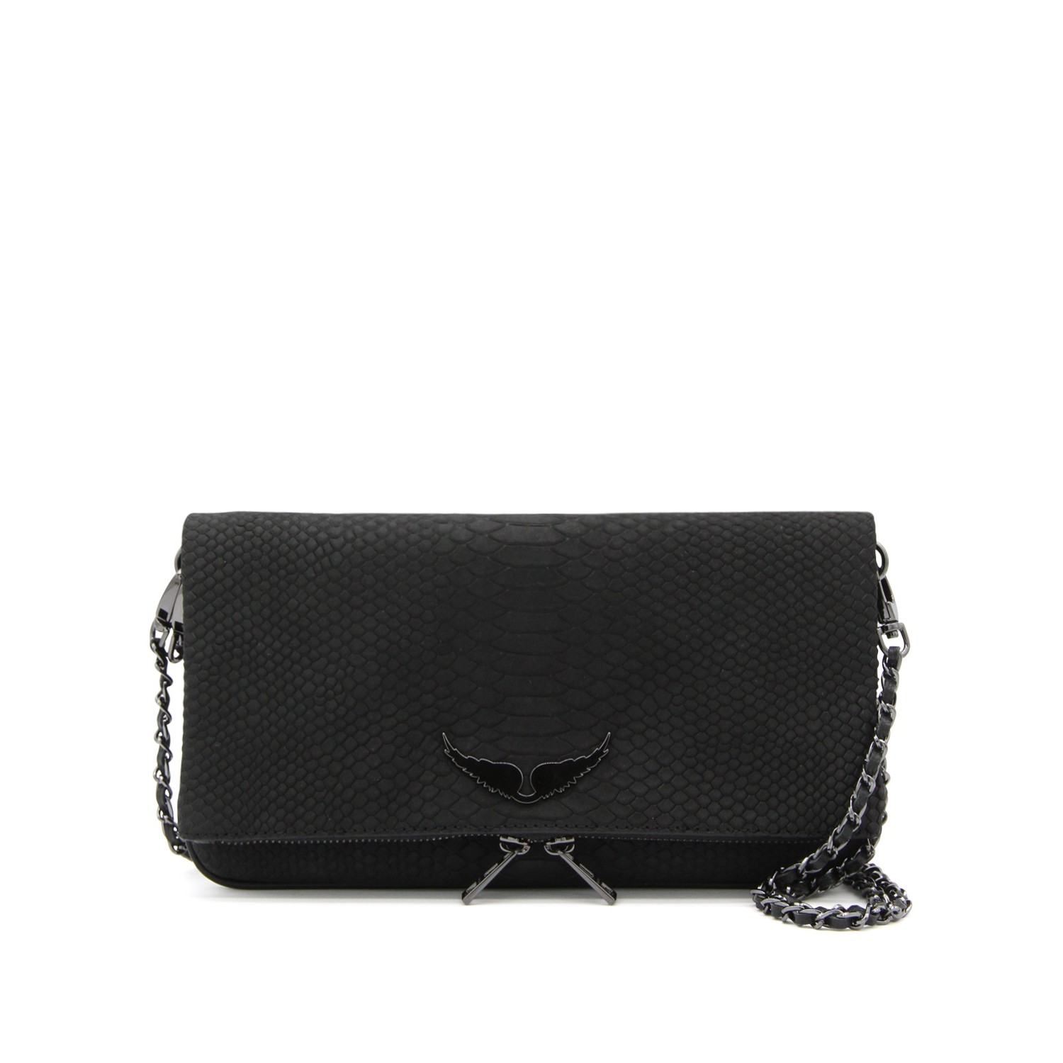 Black leather Rock Soft Savage shoulder bag from Zadig&Voltaire featuring crocodile effect, foldover top with magnetic fastening, top zip fastening, main compartment, chain-link shoulder strap and logo plaque.