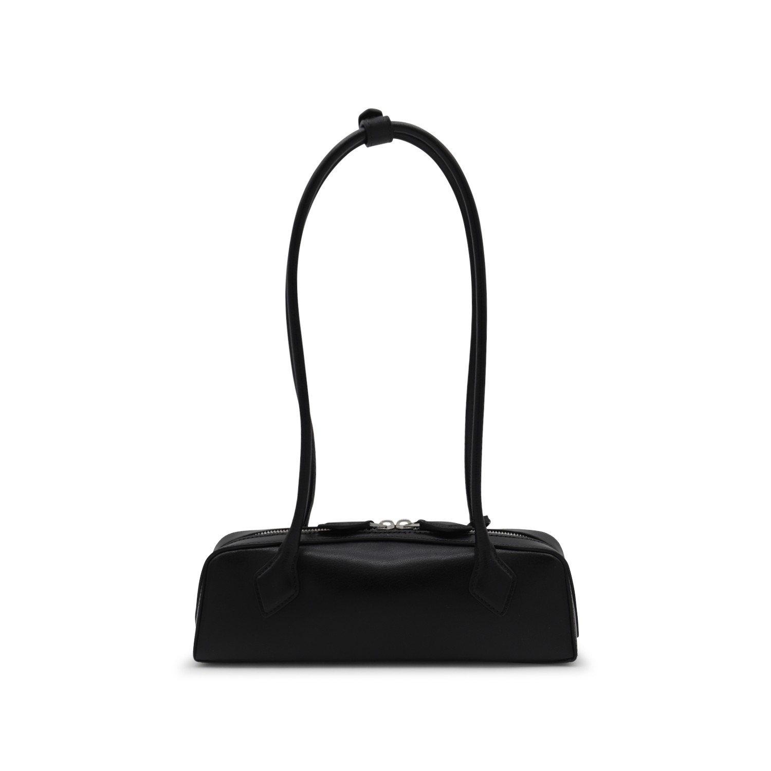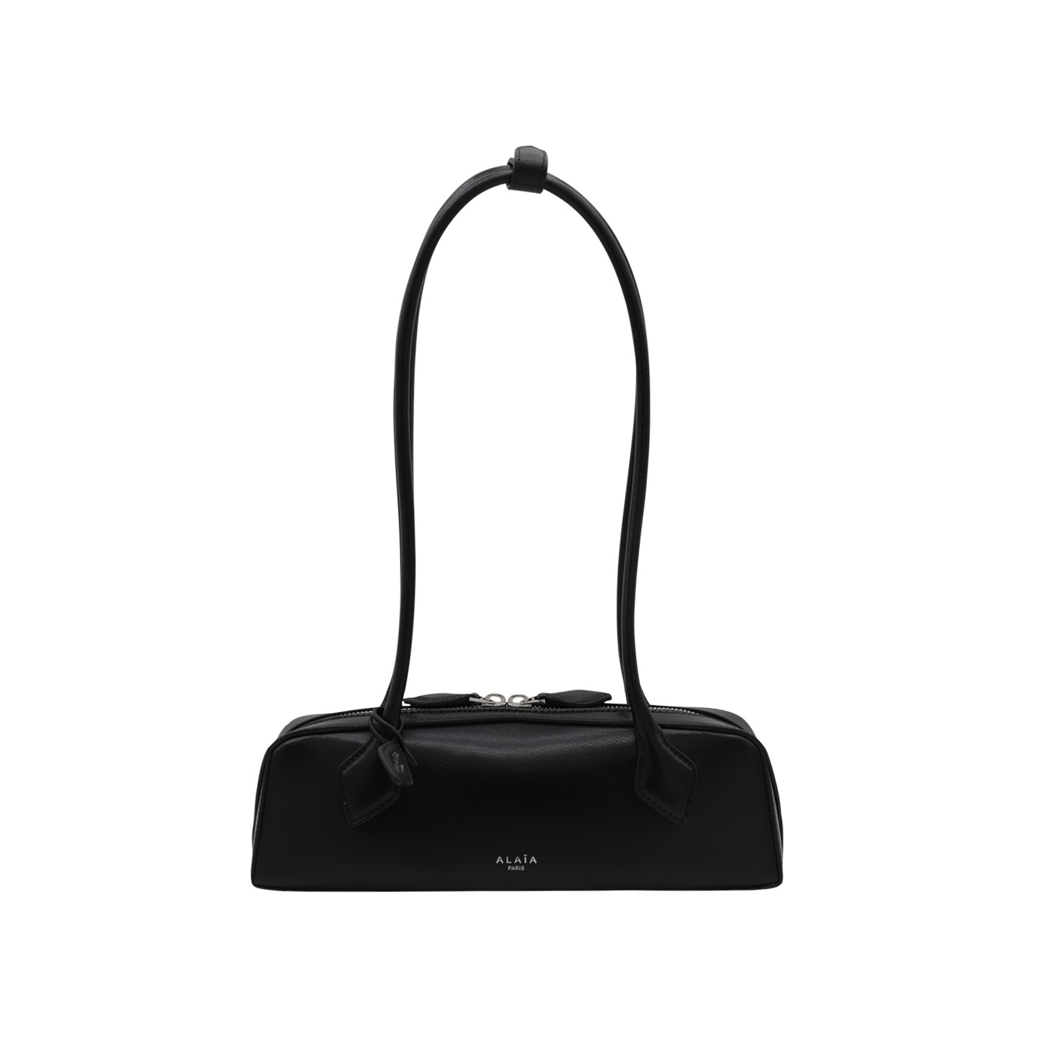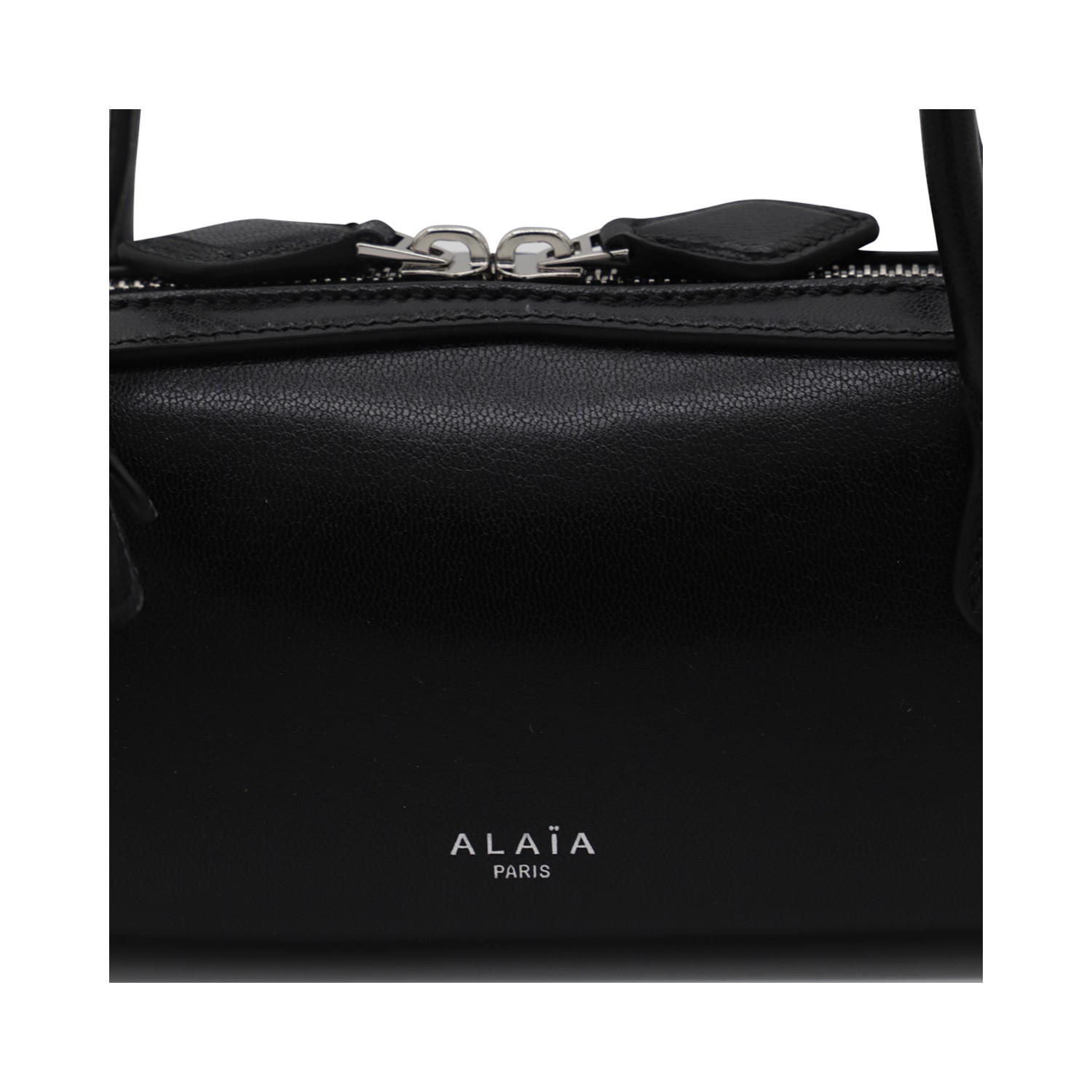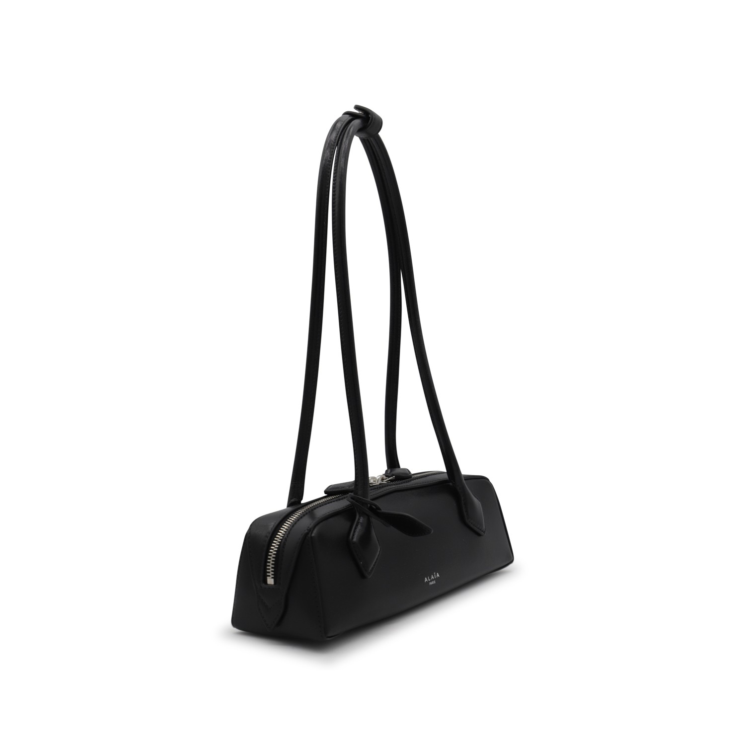 Black leather Tackel small shoulder bag from Alaia featuring top handles, double zip fastening, pocket and frontal logo.
