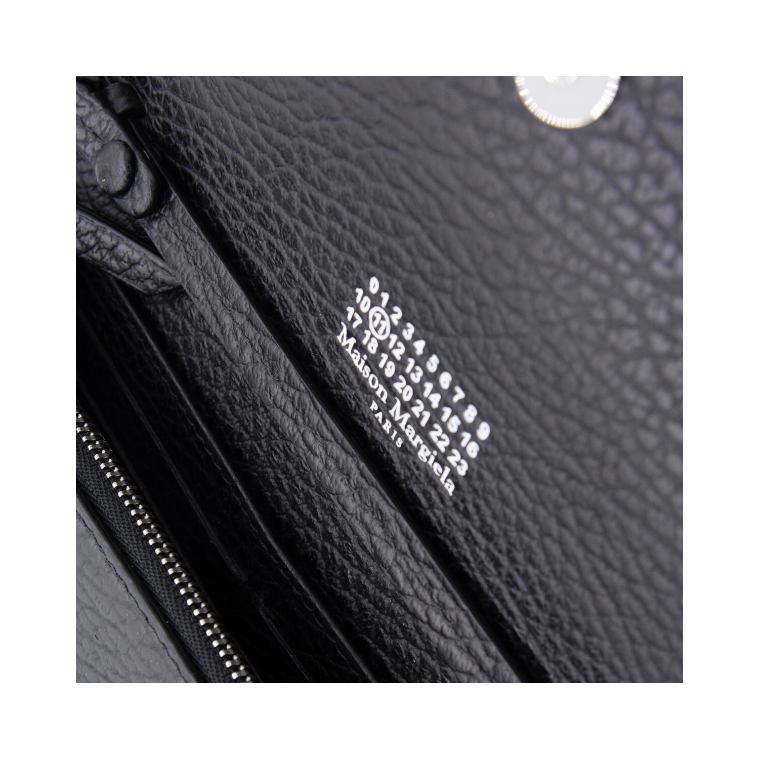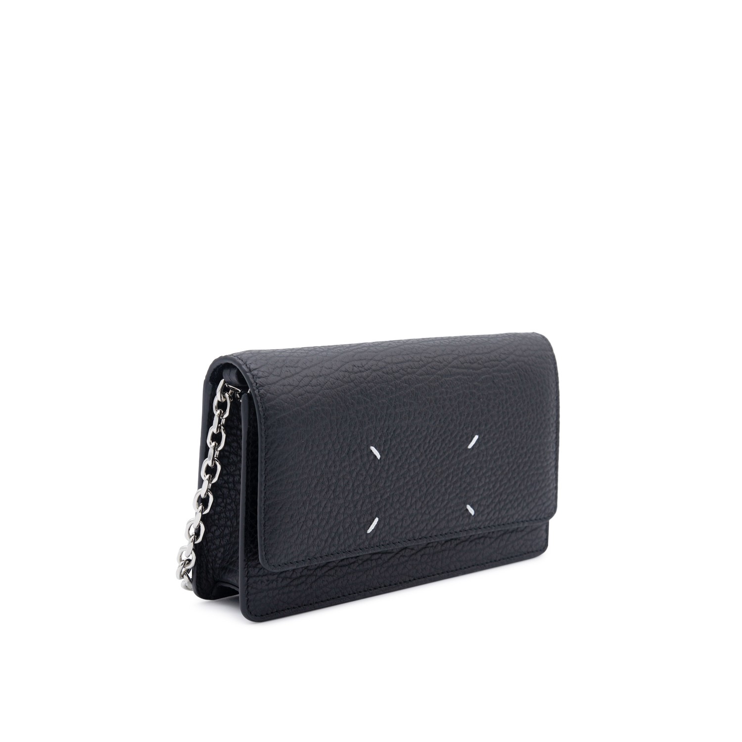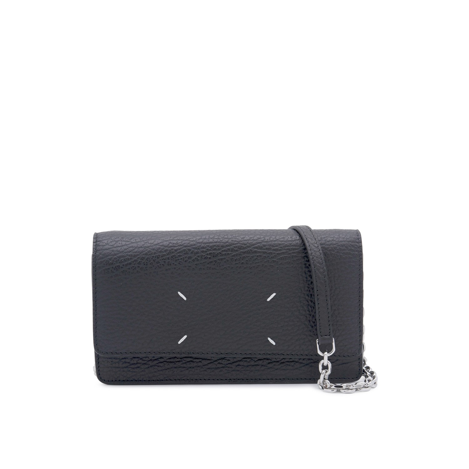 Black leather chain wallet from Maison Margiela with snap buttons fastening, textured leather, internal card slots and zip pocket, leather and silver-metal chain.