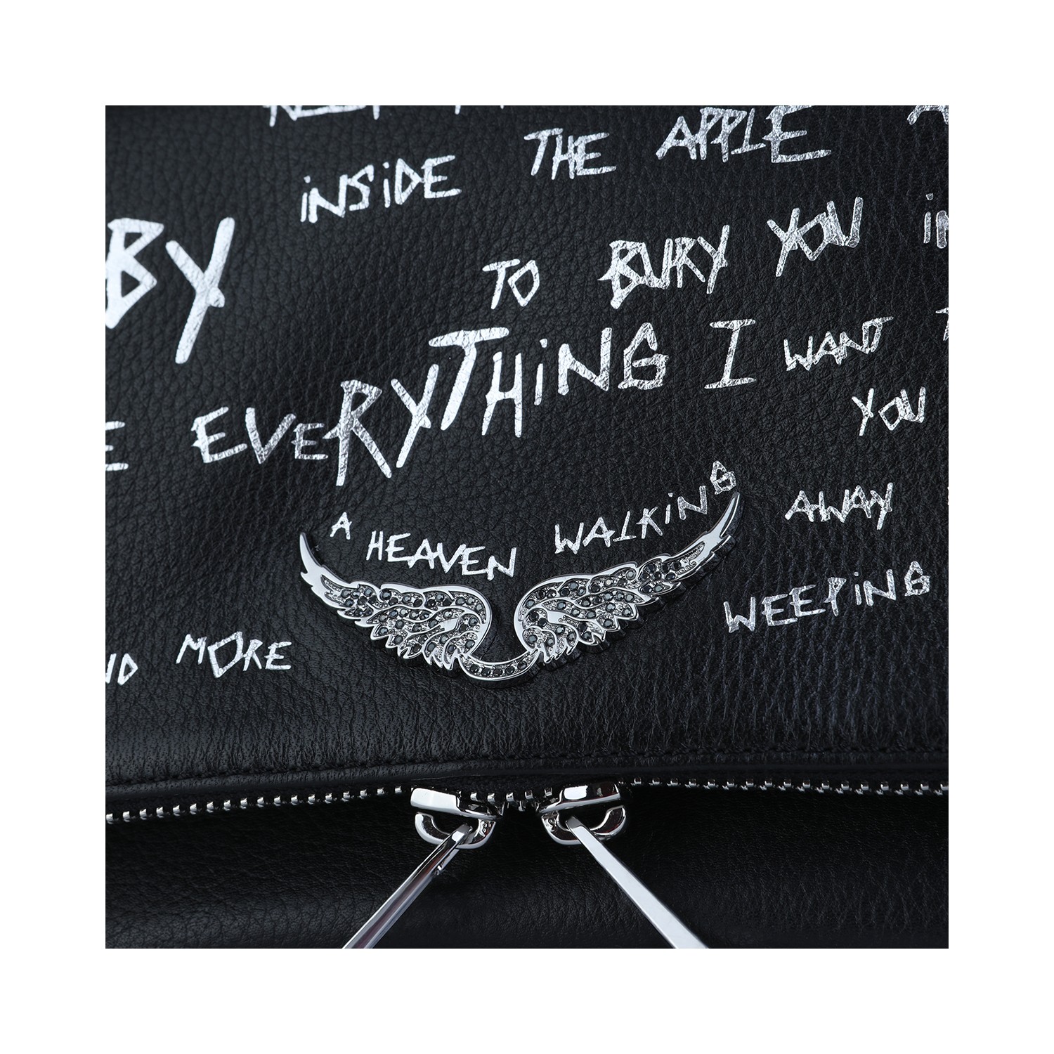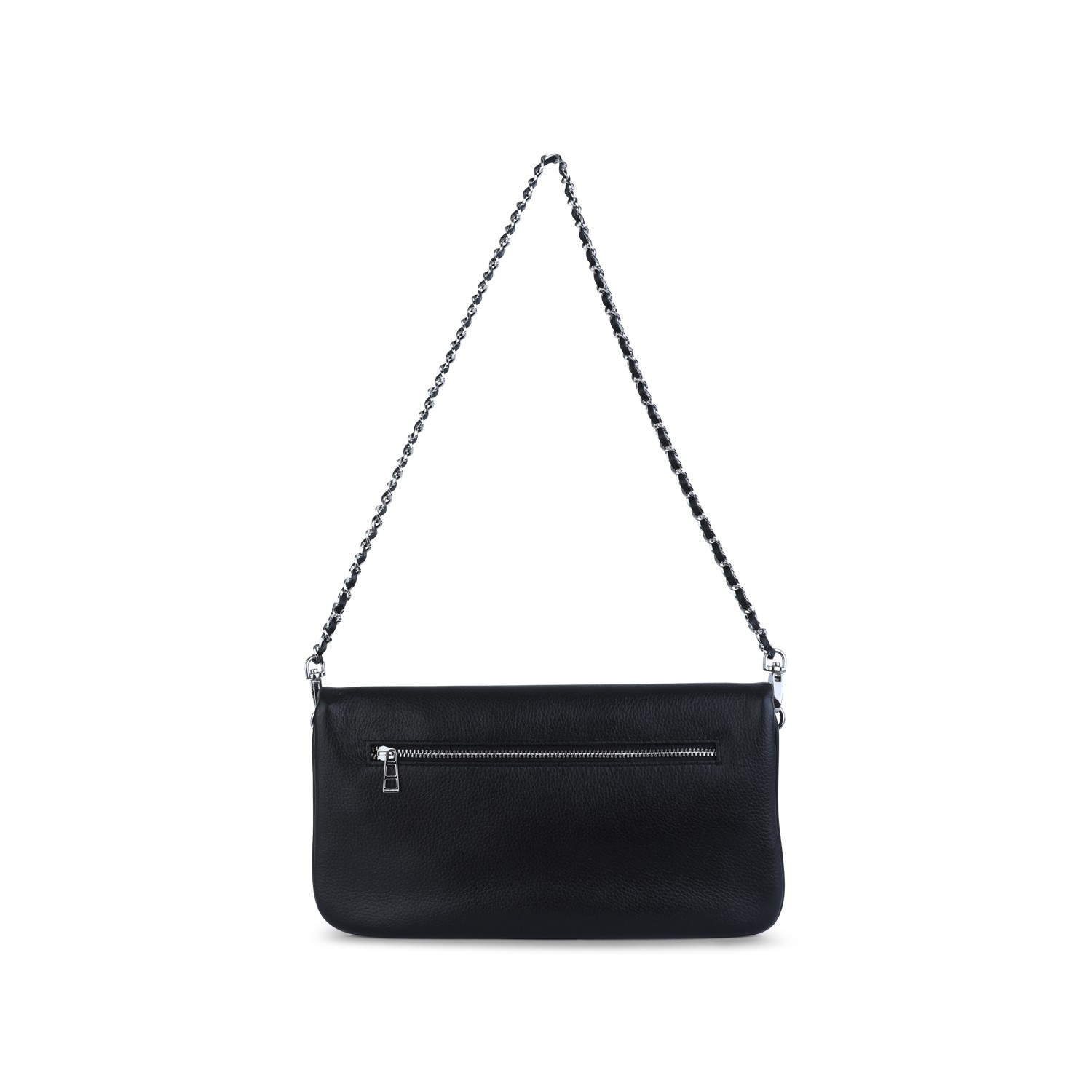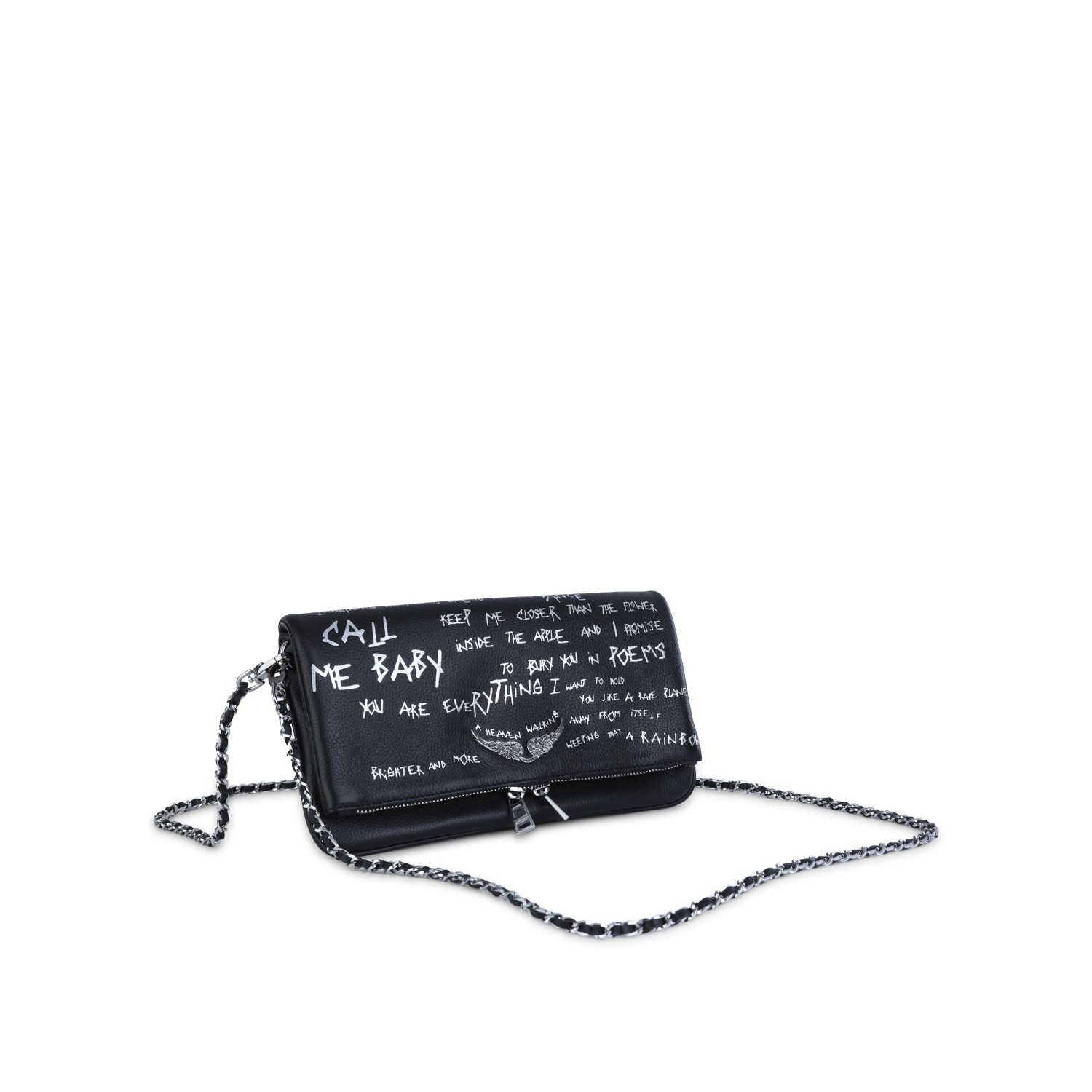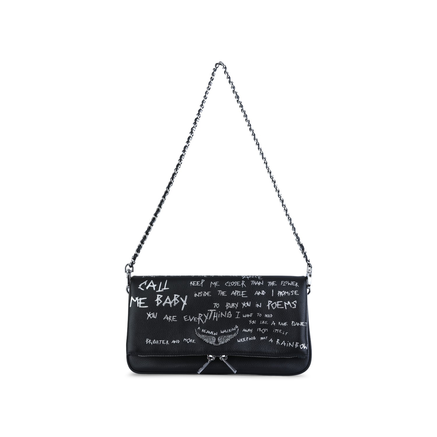 Black Rock Graffiti leather shoulder bag from Zadig & Voltaire featuring chain-link strap, silver tone hardware, frontal logo plaque, zip fastening, all over stamp and main compartment.