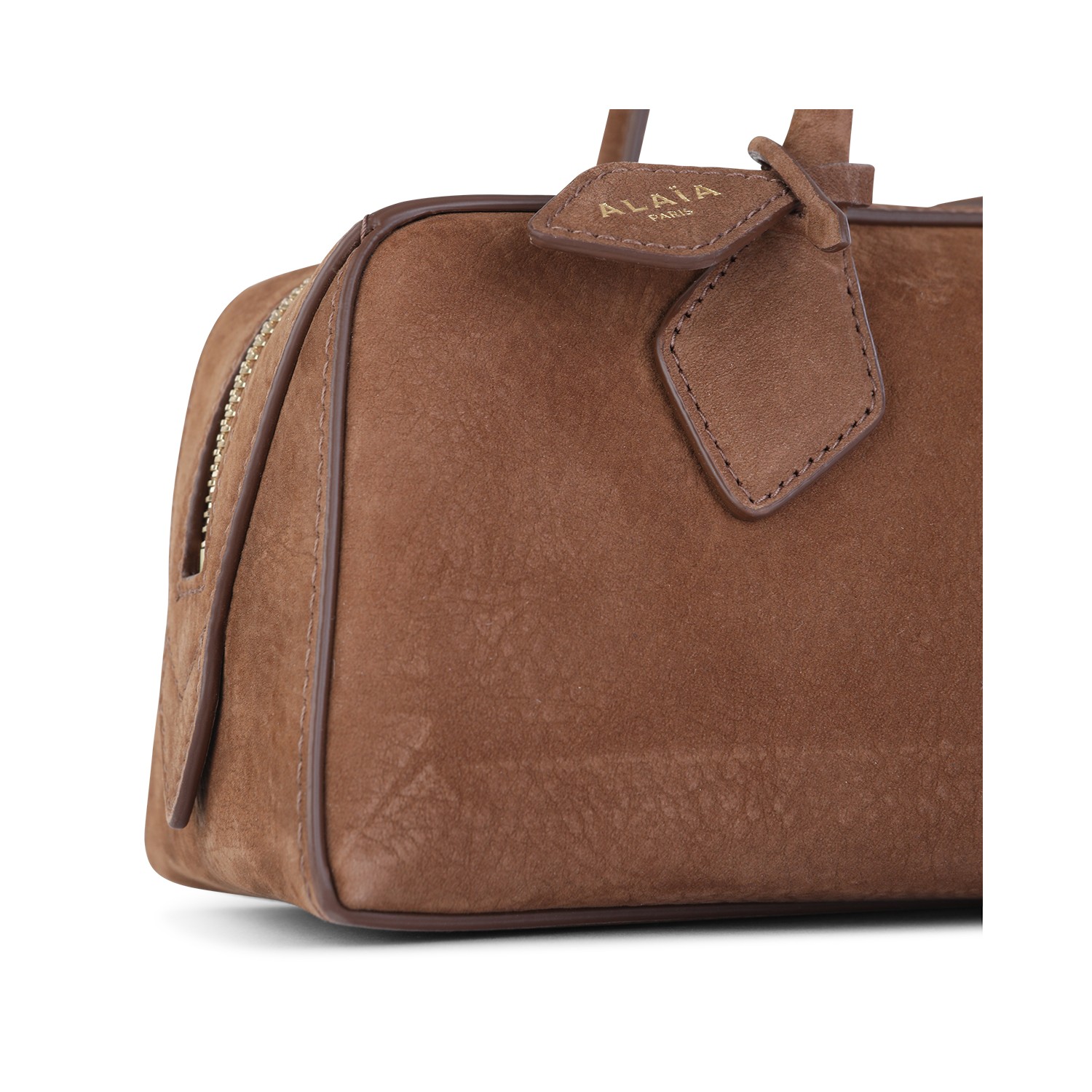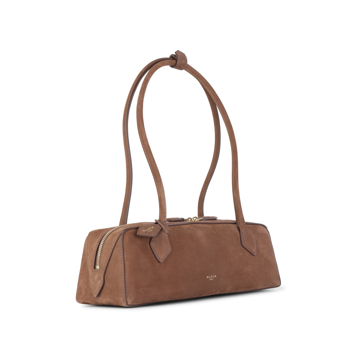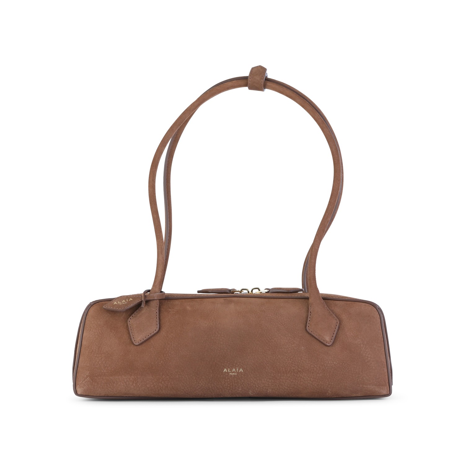 Beige leather Le Teckel medium clutch from Alaia featuring top handles, main compartment, zip fastening and frontal logo.