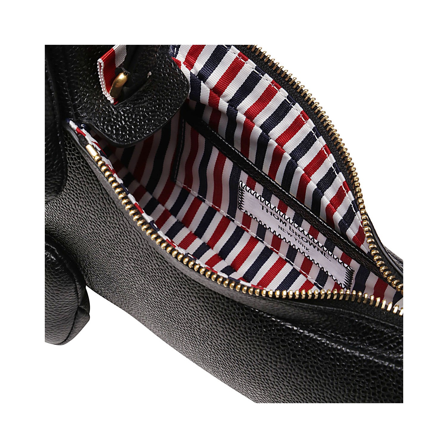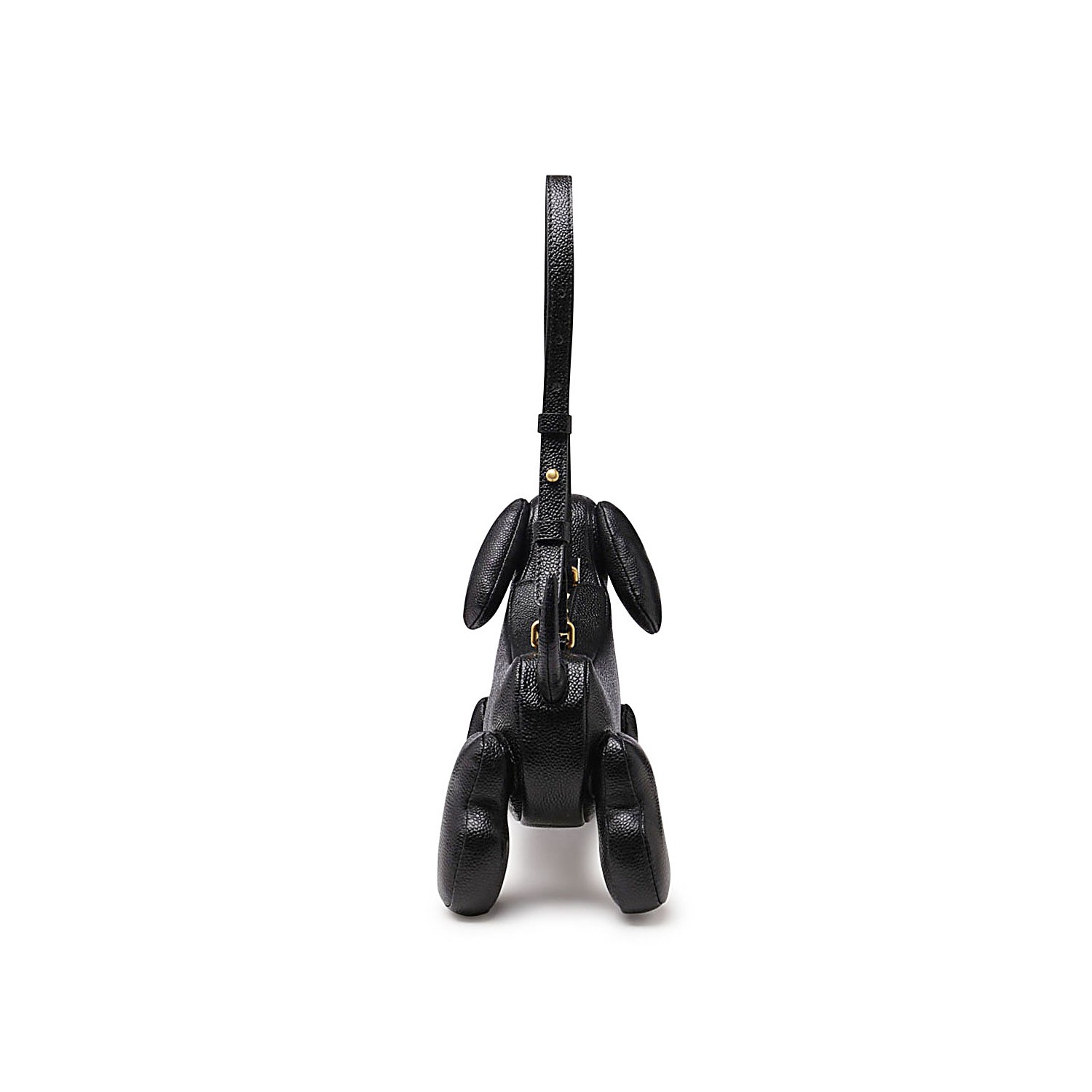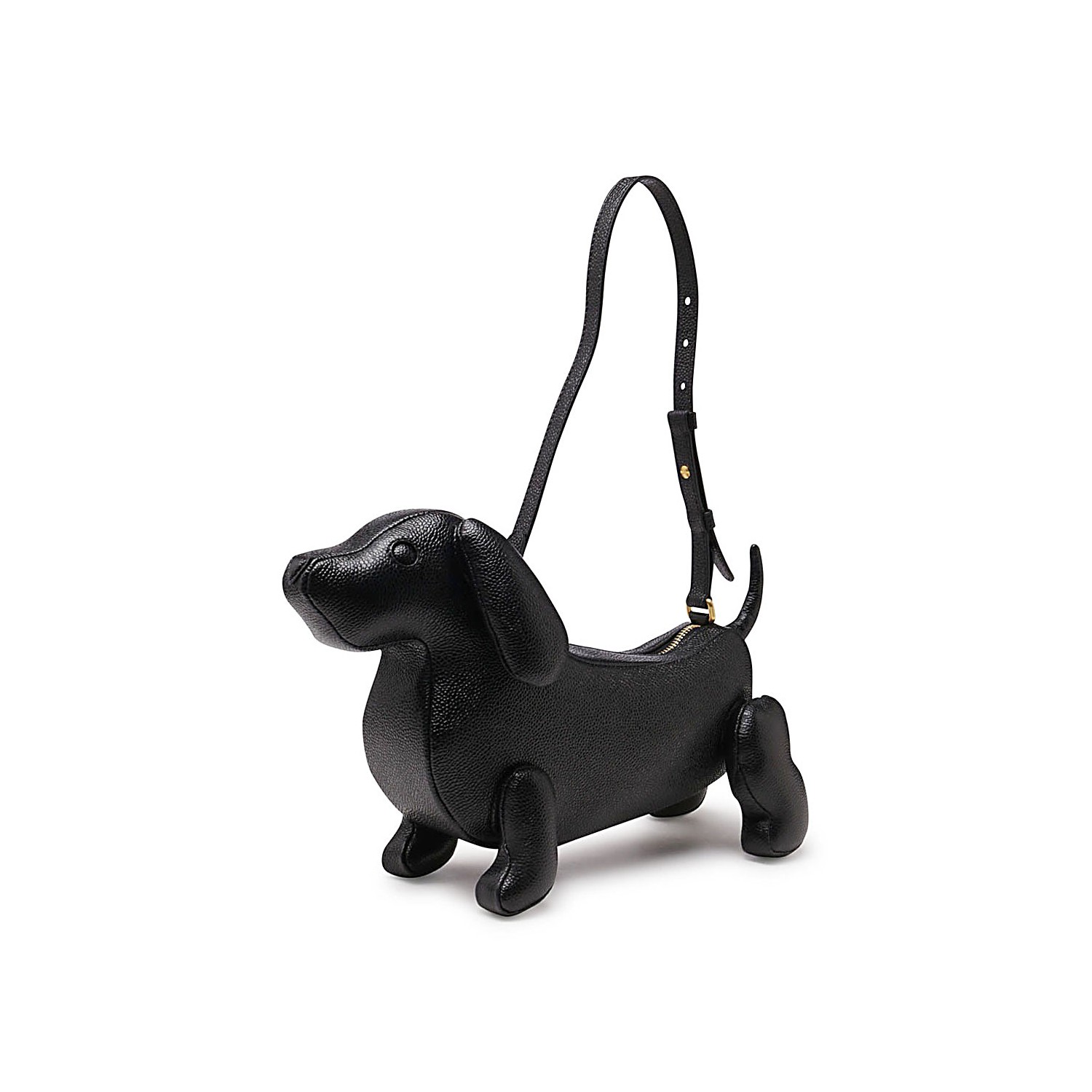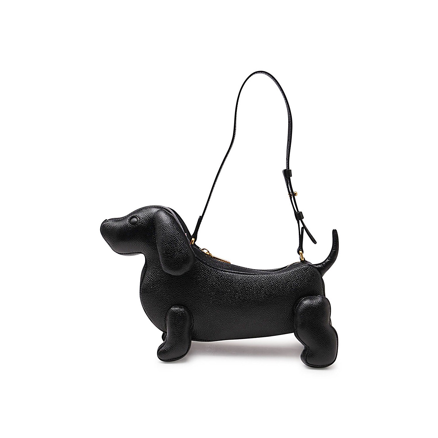 Black leather Hector shoulder bag from Thom Browne featuring an adjustable shoulder strap, top zip fastening, pebbled texture, dog shape and gold-tone hardware.