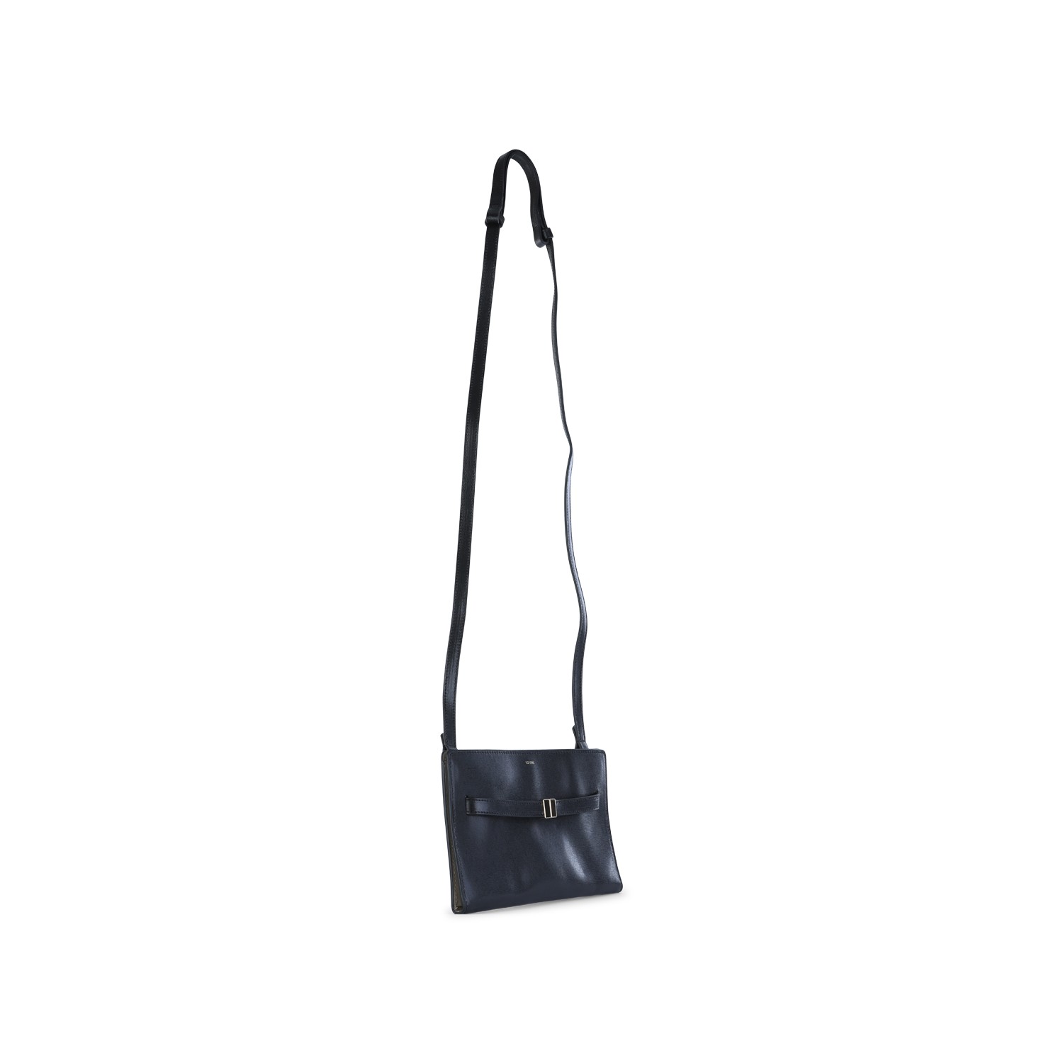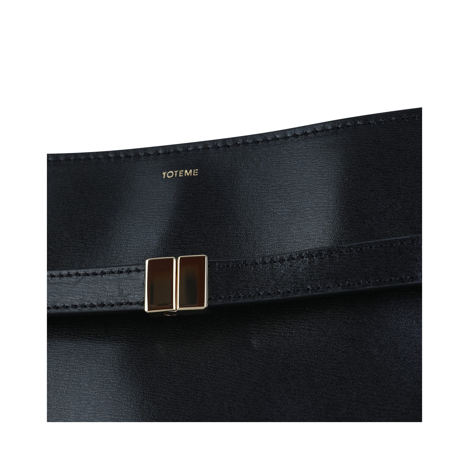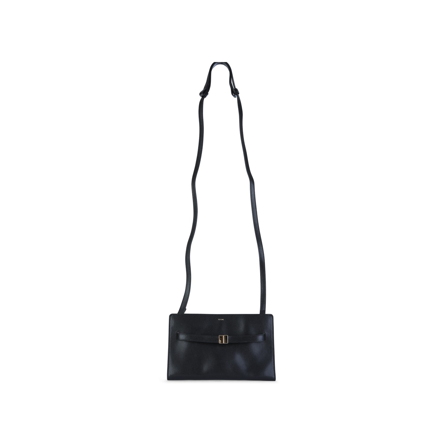Black leather crossbody bag from Toteme featuring adjustable strap, maiin compartment, frontal logo and gold tone hardware.