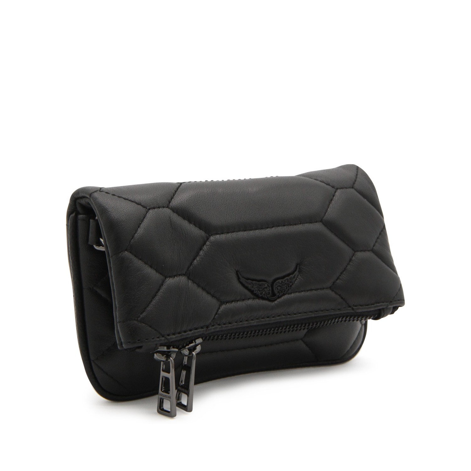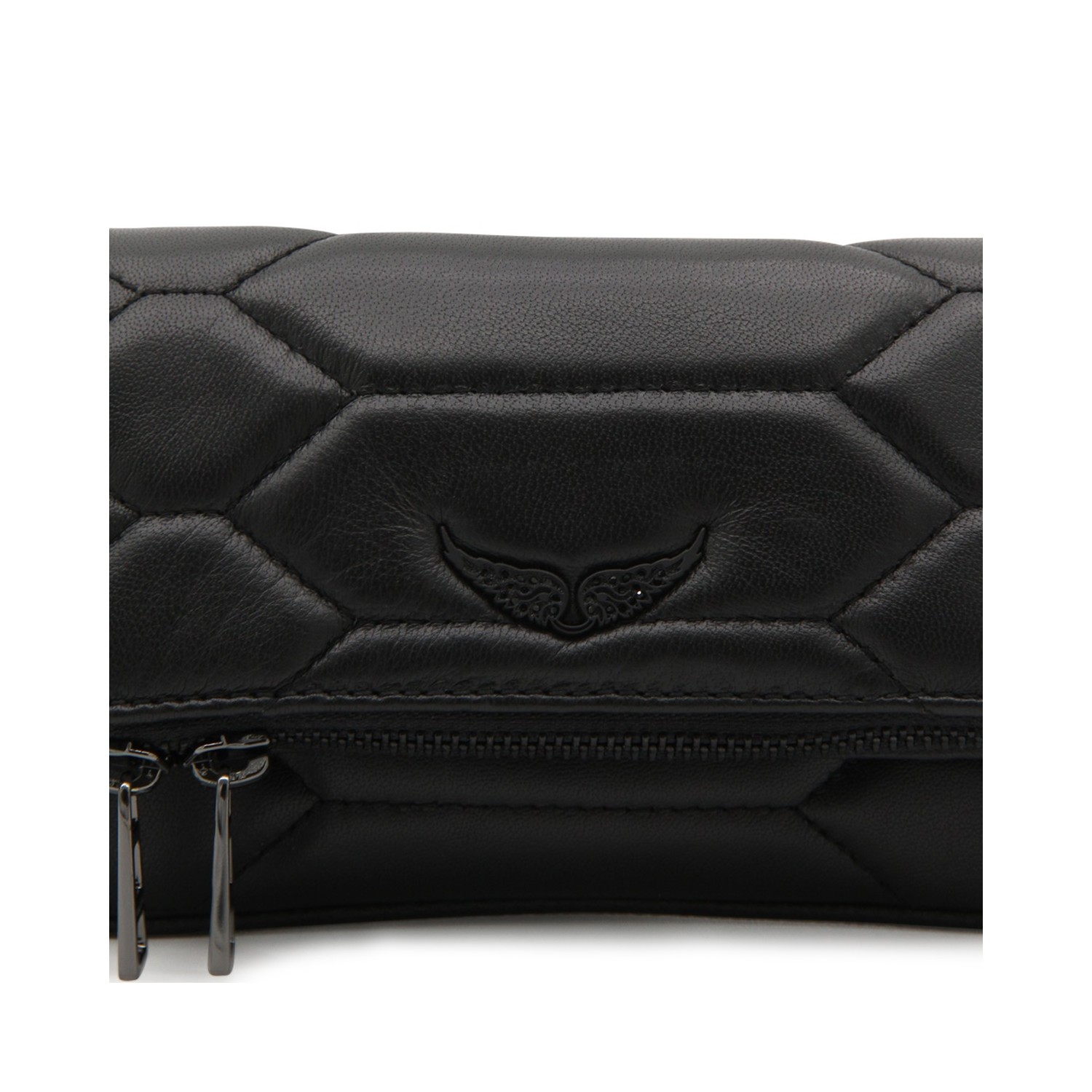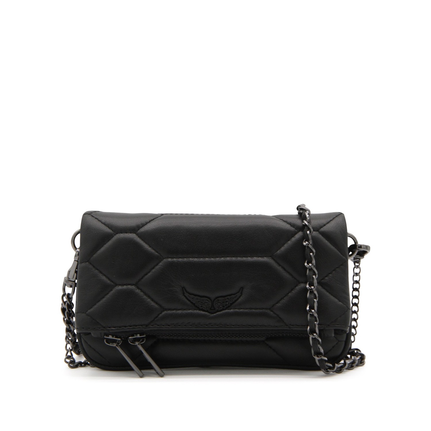 Black leather Rock Nano XL Mat Scale shoulder bag from Zadig & Voltaire featuring chain-link strap, black tone hardware, frontal logo plaque, zip fastening and main compartment.