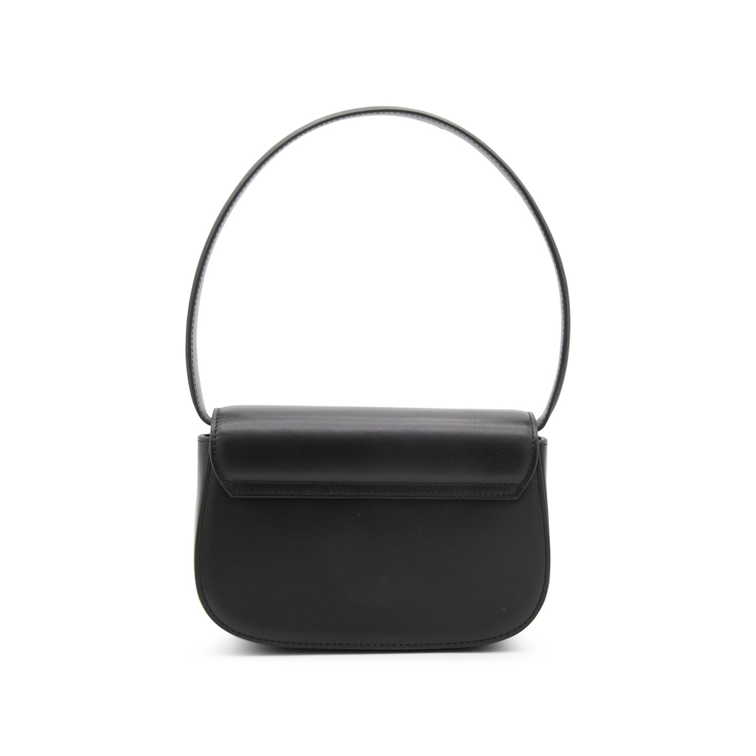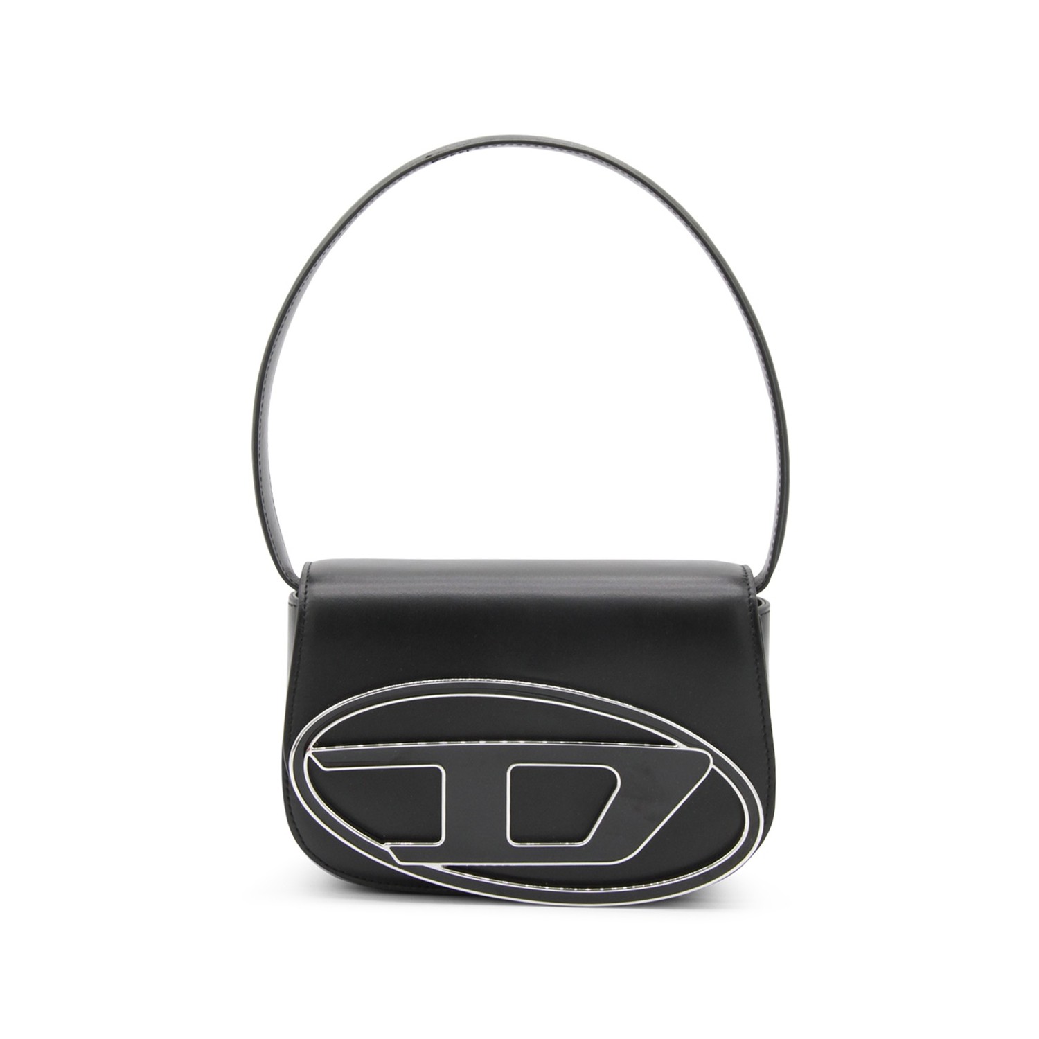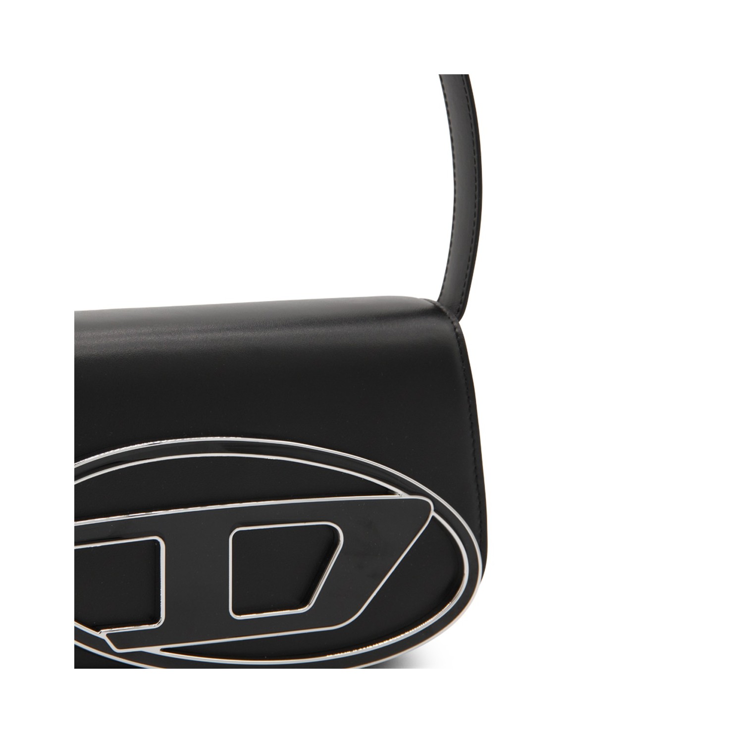 Black leather 1DR shoulder bag from Diesel featuring front logo plaque, foldover top with magnetic fastening, silver-tone hardware, detachable shoulder strap, internal logo patch, partitioned compartment and single rounded top handle.