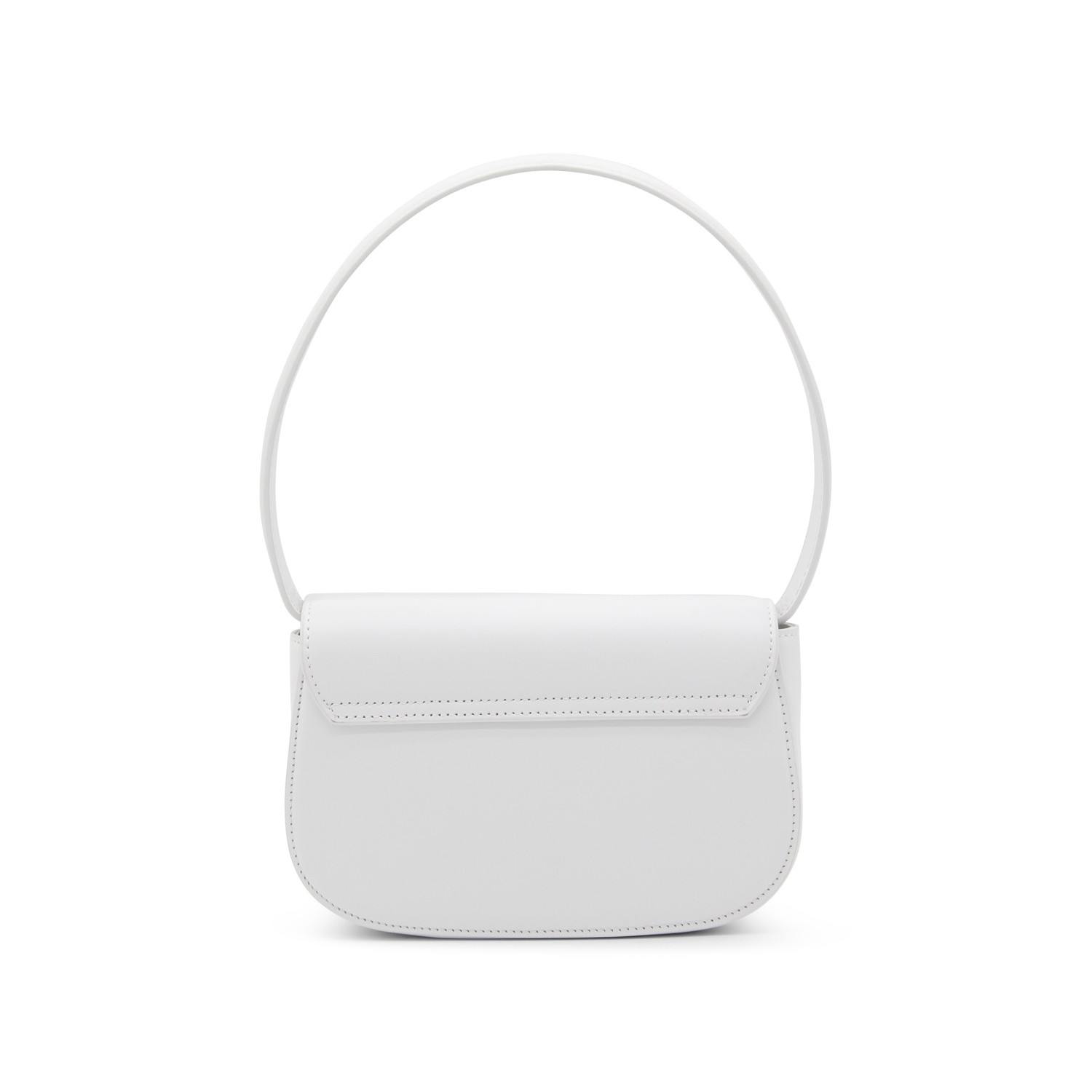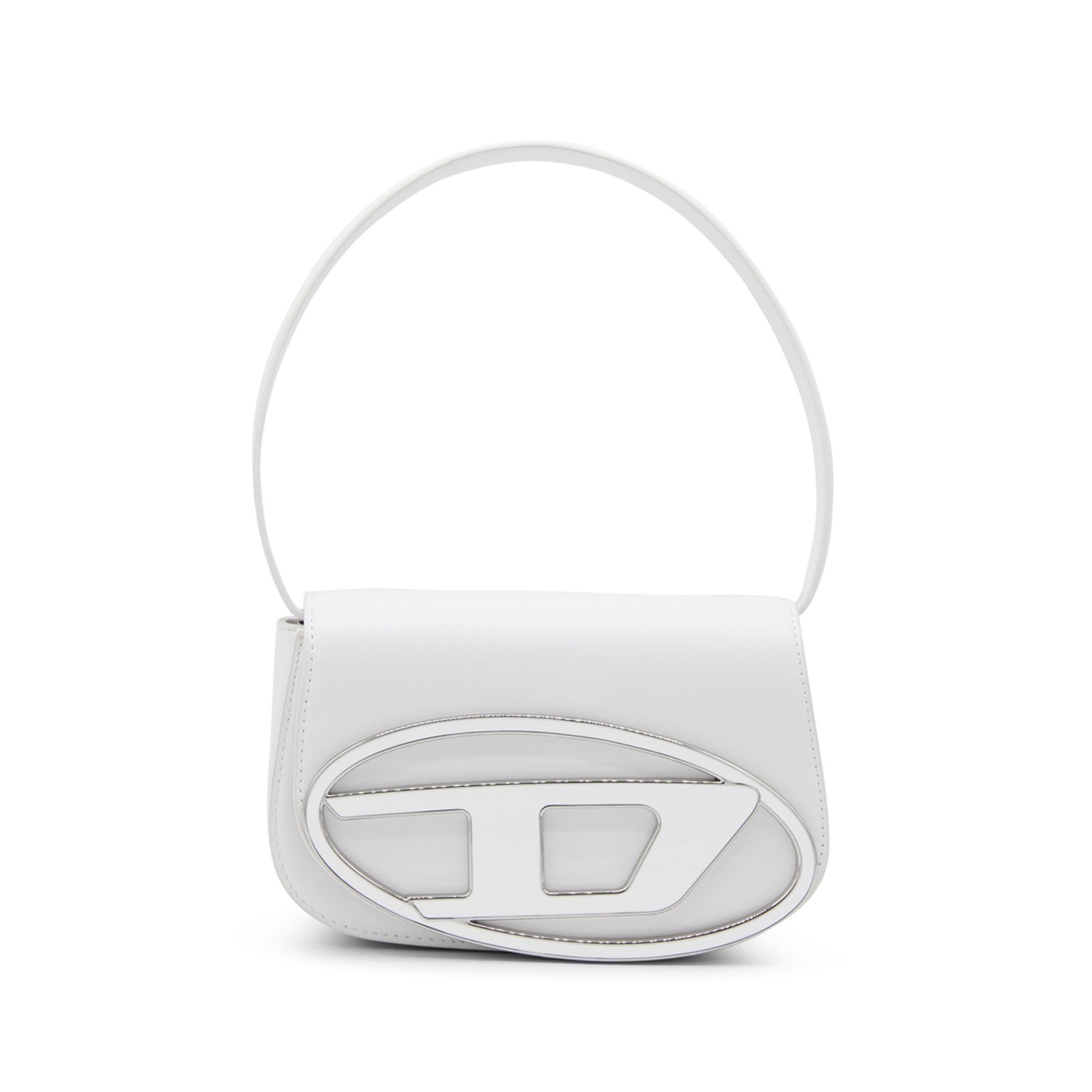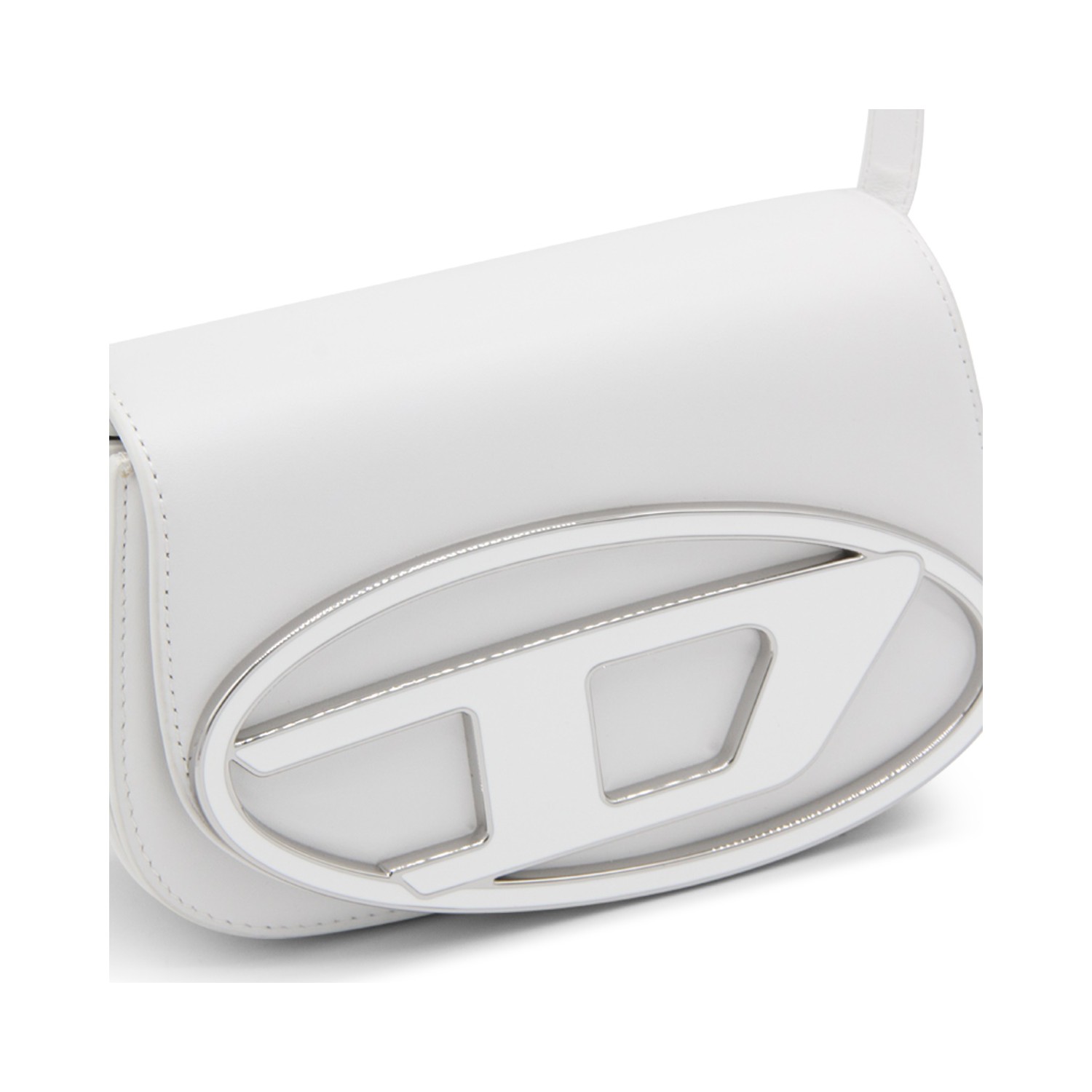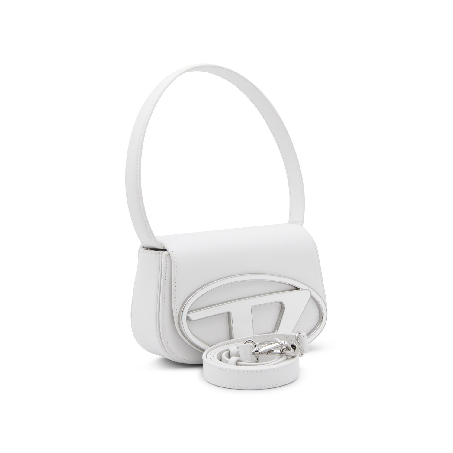 White leather 1DR shoulder bag from Diesel featuring front logo plaque, foldover top with magnetic fastening, silver-tone hardware, detachable shoulder strap, internal logo patch, partitioned compartment and single rounded top handle.