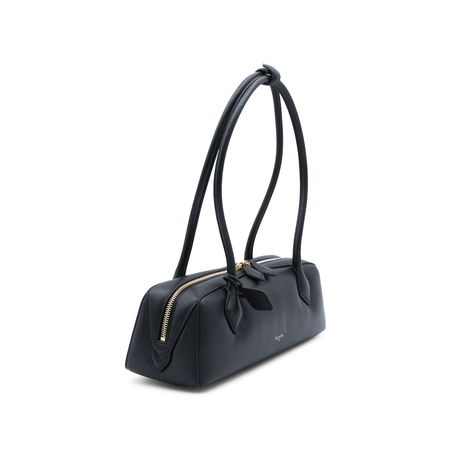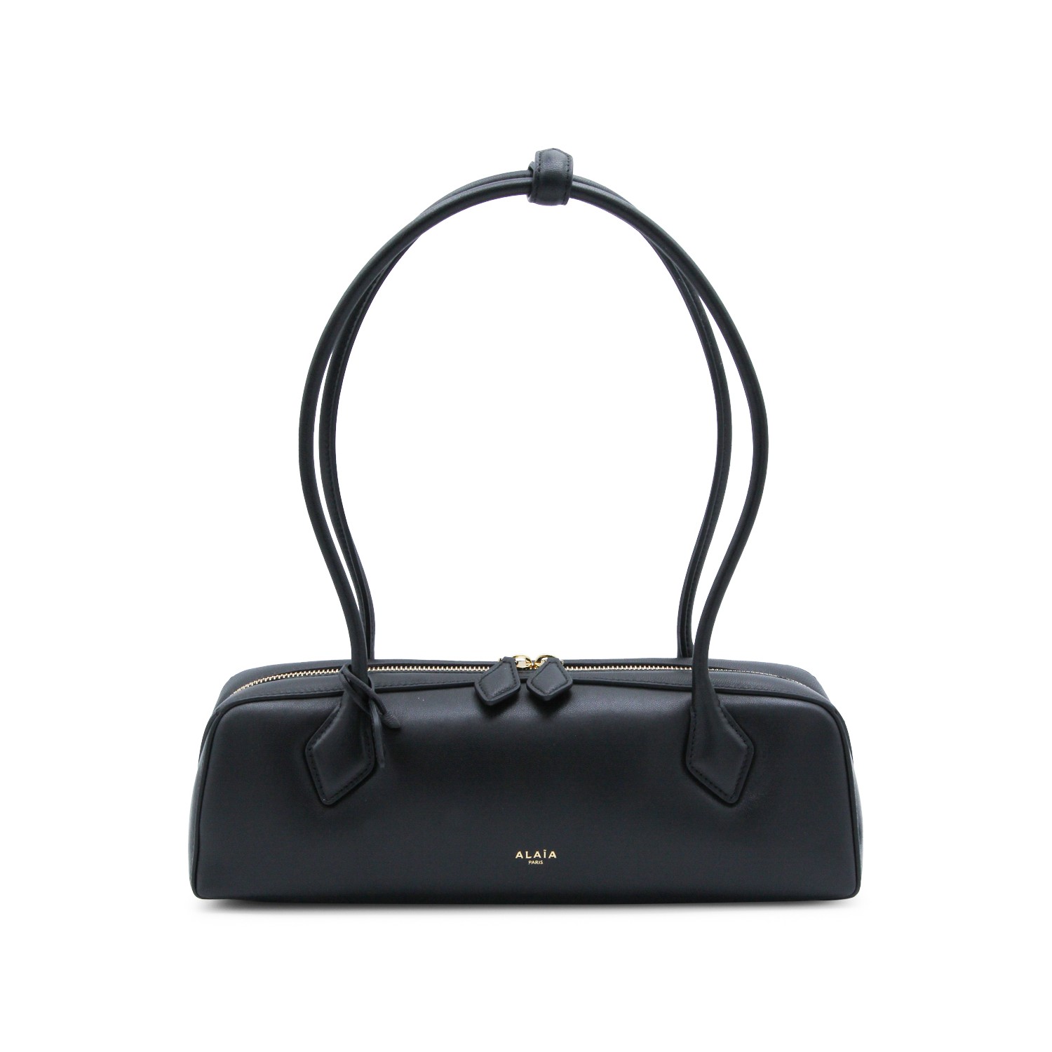 Black leather Le Teckel Medium shoulder bag from Alaia featuring iconic elongated shape, top handles with decorative laces, double zip closure, removable mirror in the internal pocket and embossed logo.